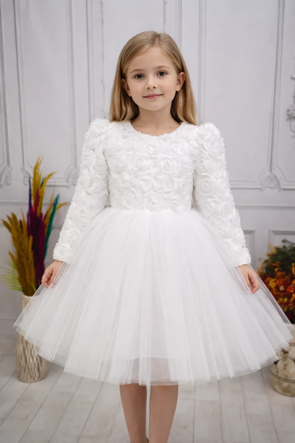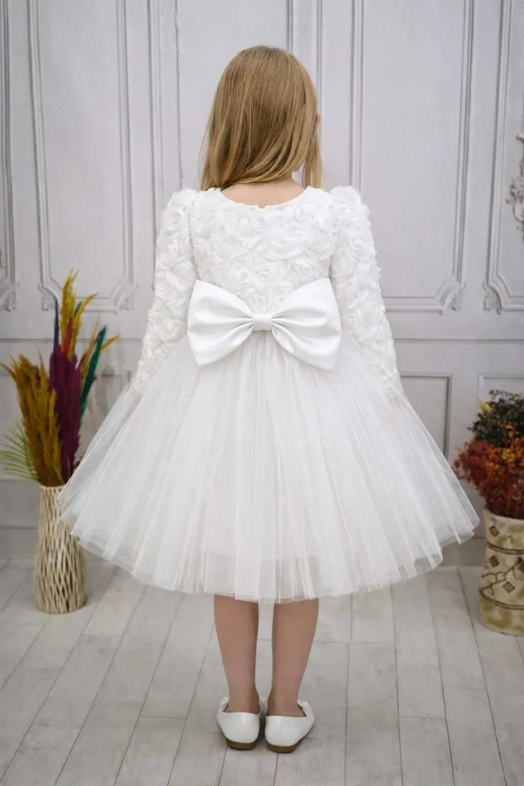 Kız Çocuk Beyaz Gül işleme Elbise Abiye Gelinlik