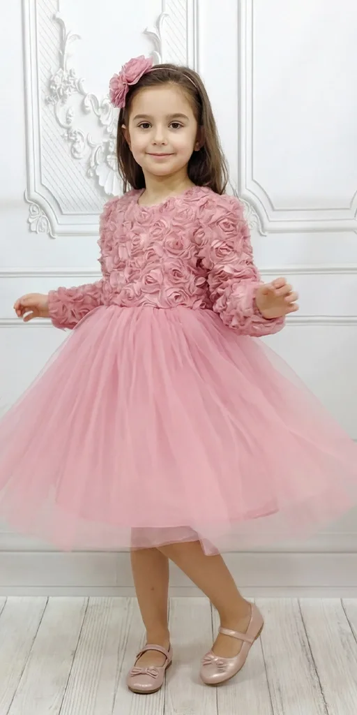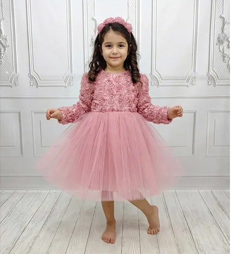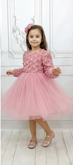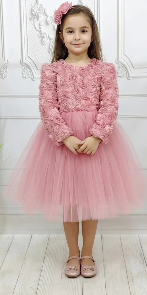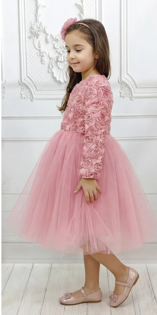 Kız Çocuk Lacivert Gül 3D Detaylı Kabarık Elbise Abiye Gelinlik