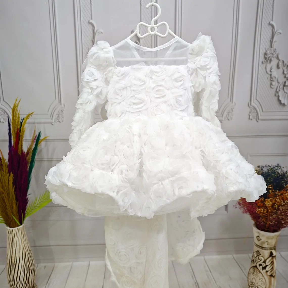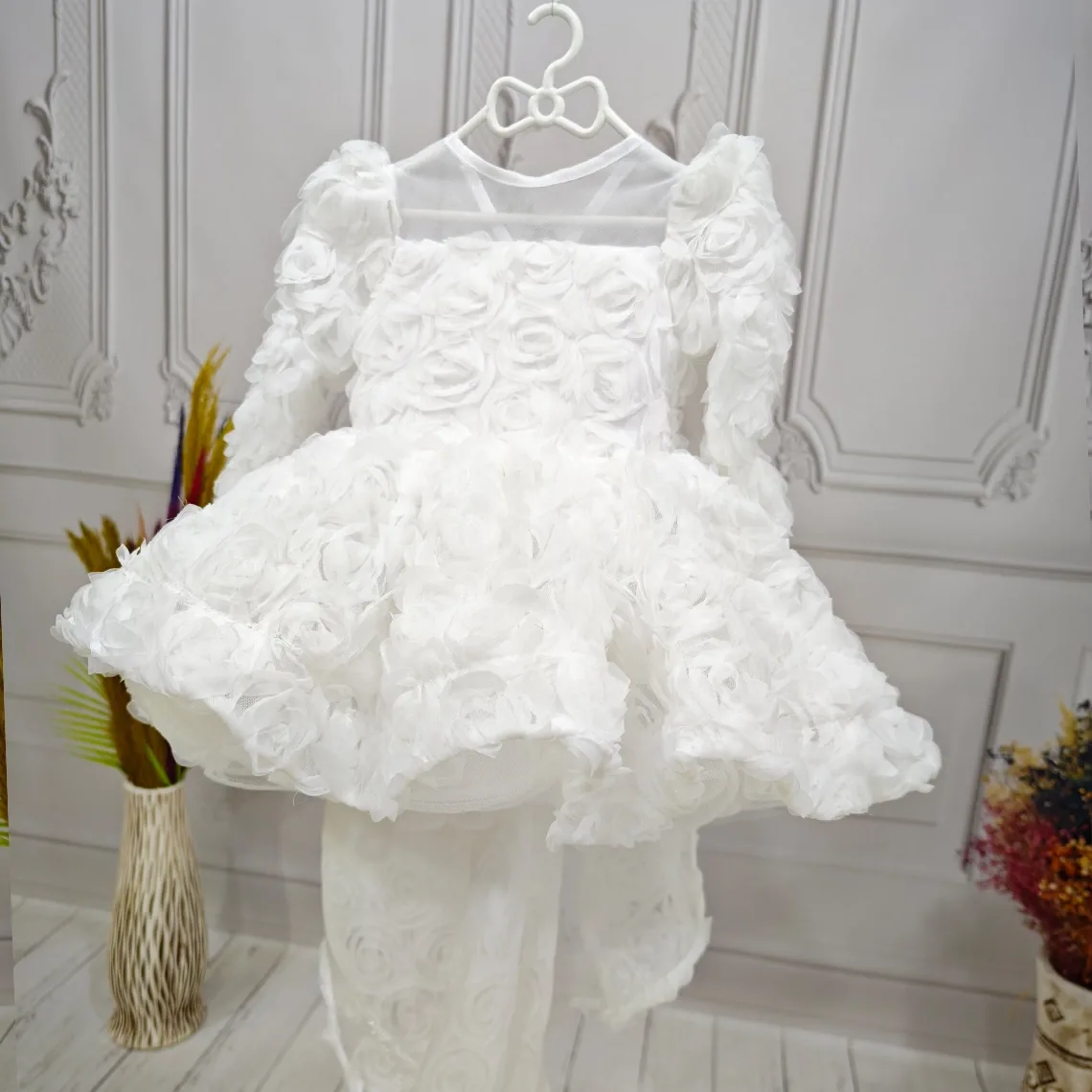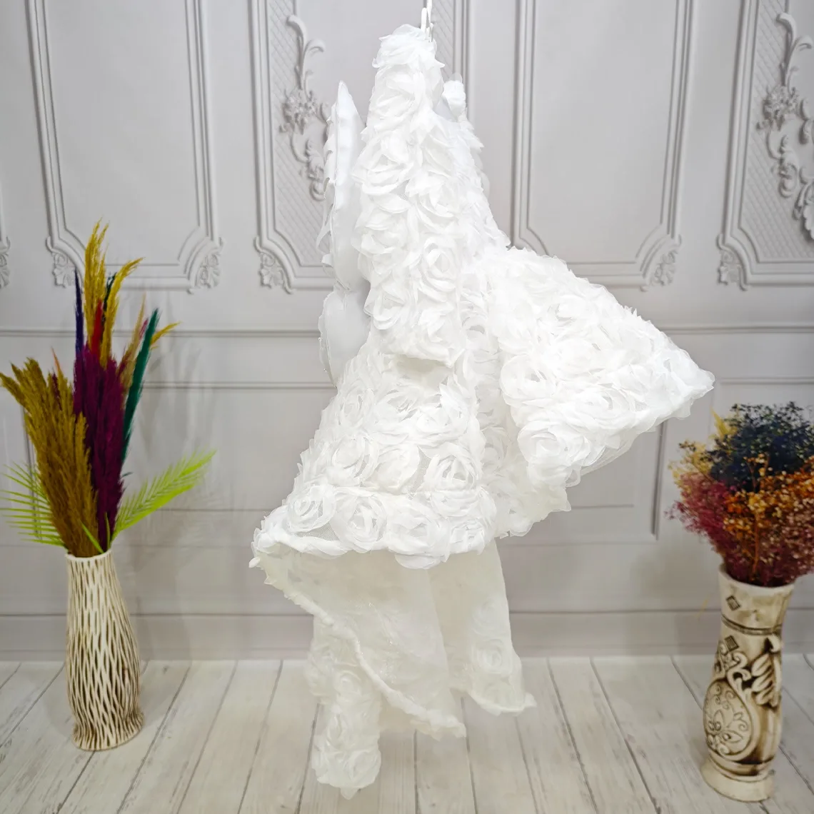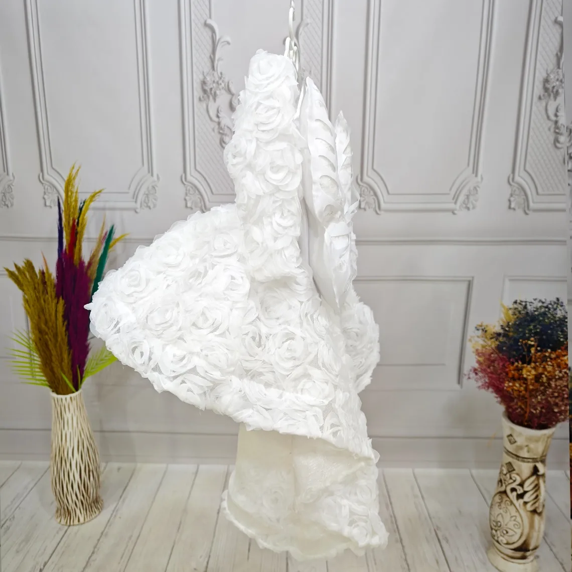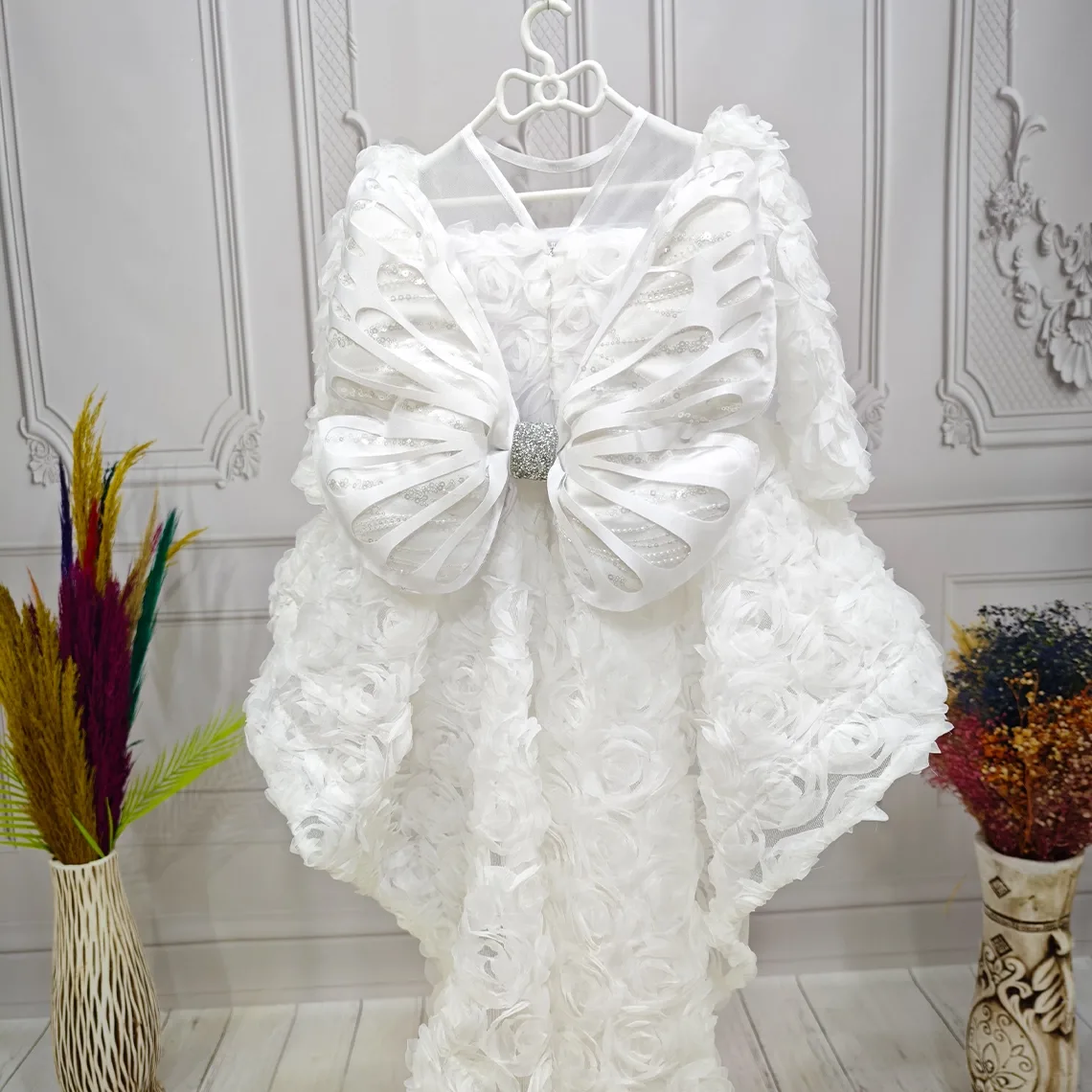 Beyaz Güllü + Kelebek seti Yaka Askılı Uzun Kol Elbise Abiye Gelinlik