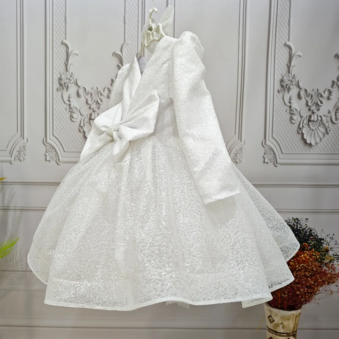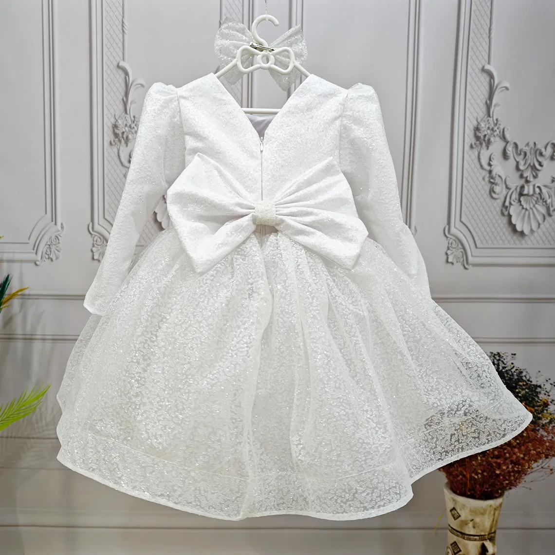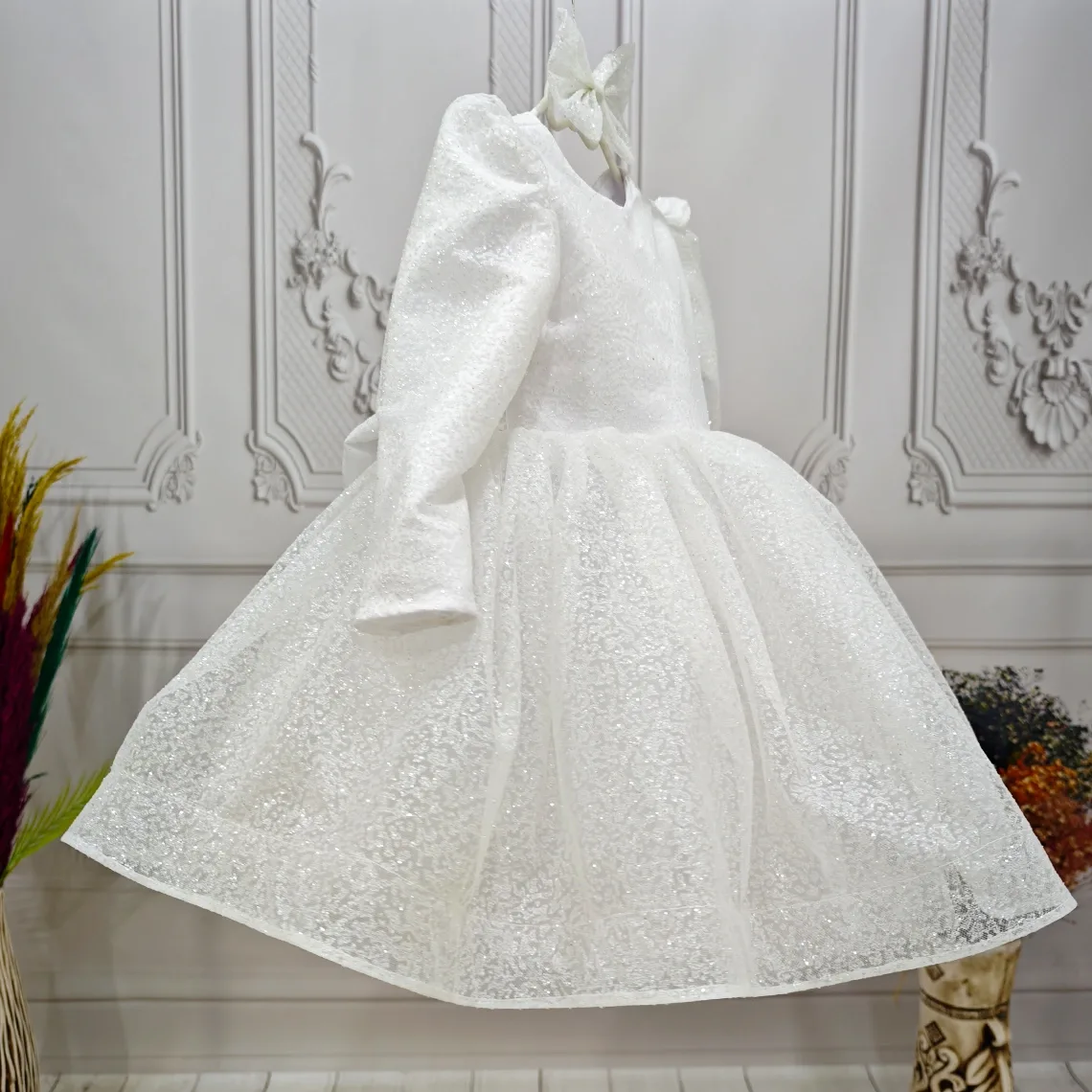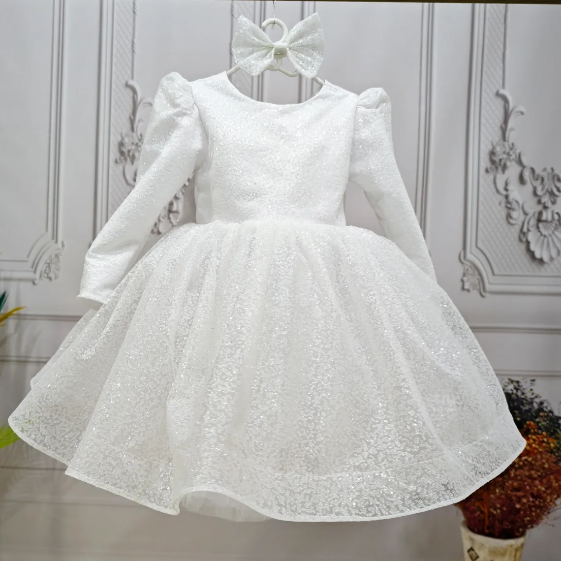 Kız Çocuk Beyaz Simli Desenli Kabarık Elbise Hicbir sekilde cildi tahriş etmez..Oldukça kabarık bir elbisedir. Yıkama ve kurutma işlemlerini tersten yapmanızı ve 30°c sıcaklıkta yıkamanızı öneririz. ( TOKASI FİYATA DAHİL DEĞİLDİR )