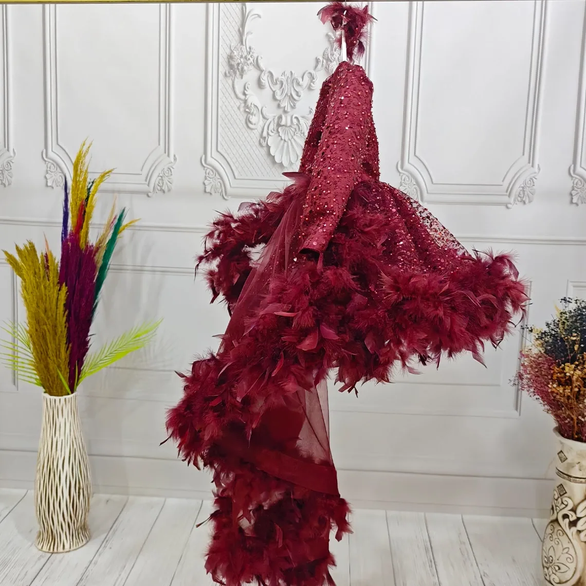 Bordo Gül Taşlı Boncuklu Kuyruklu Uzun Kol Elbise Abiye Gelinlik