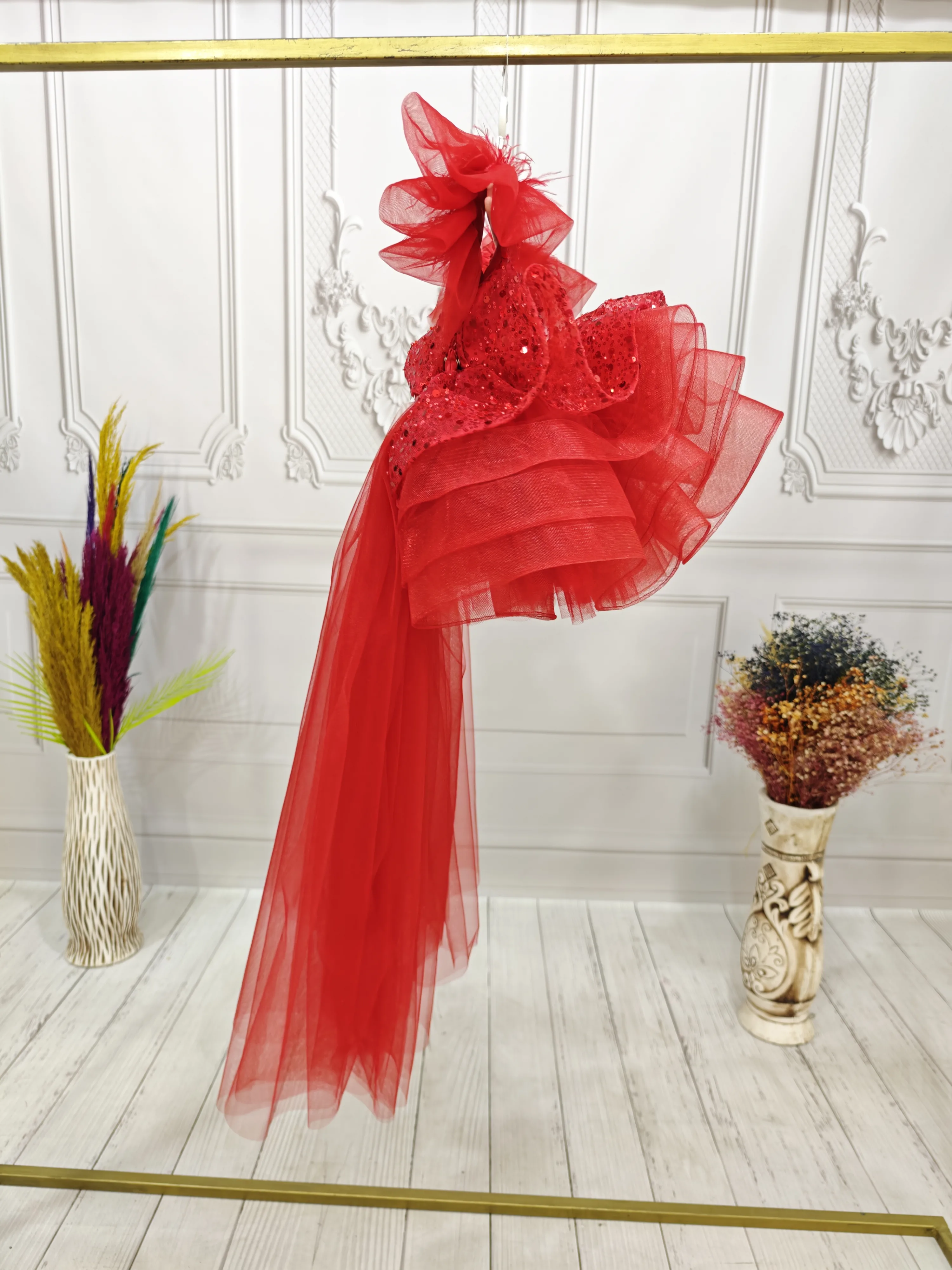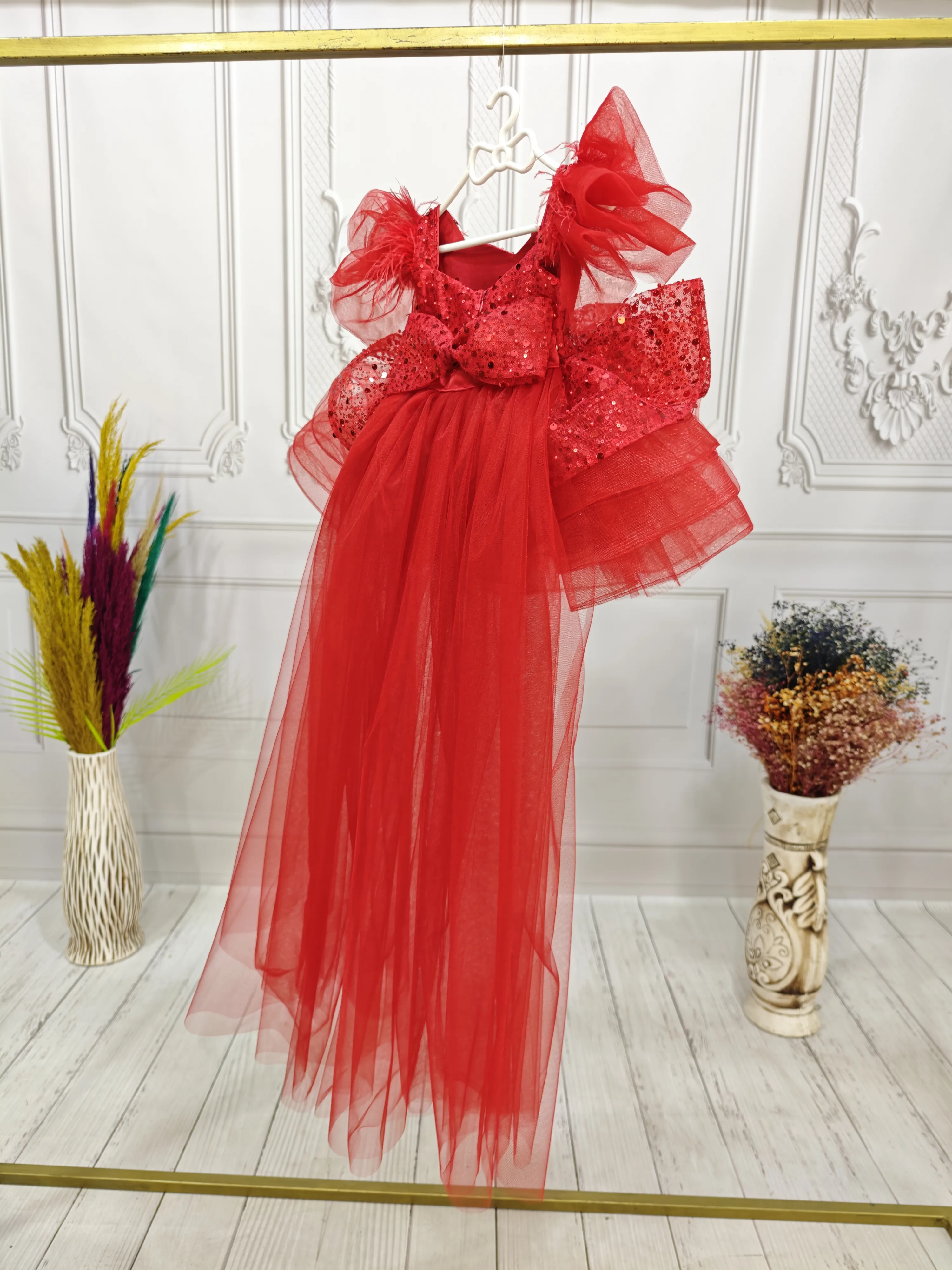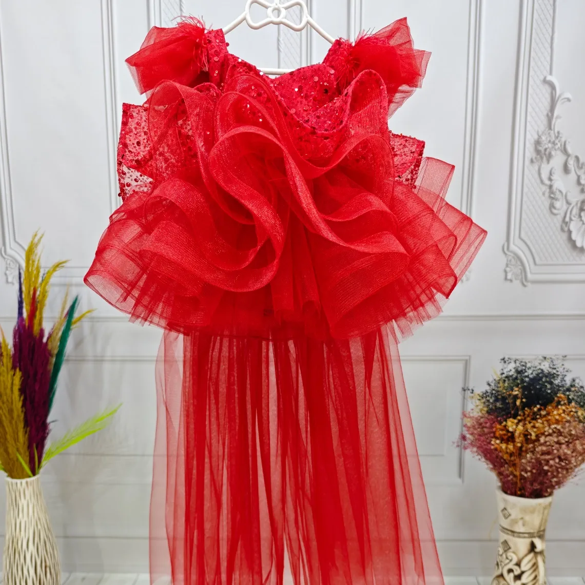 Kırmızı Boncuklu payetli fırfırlı Elbise Abiye