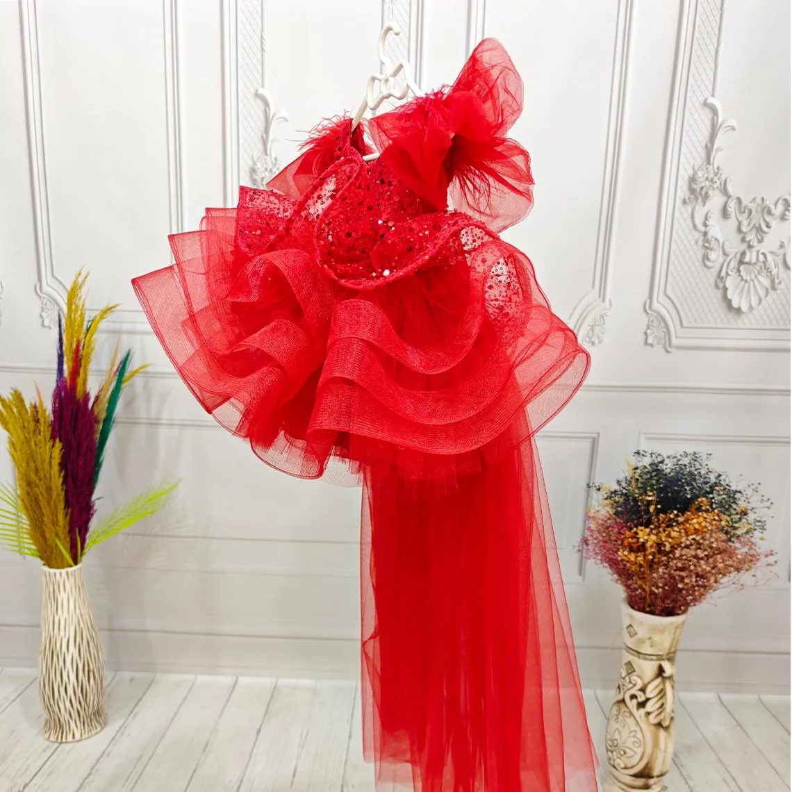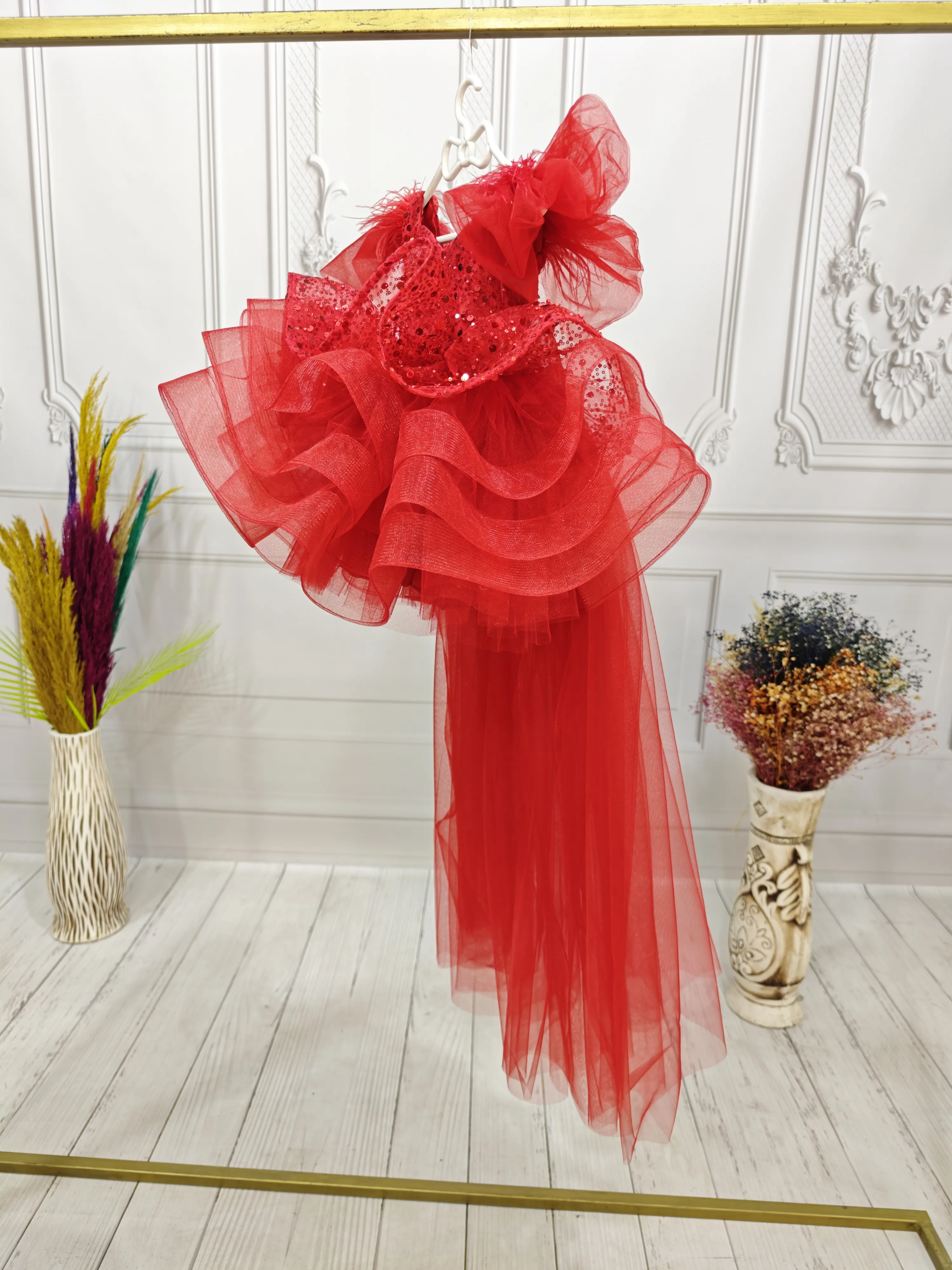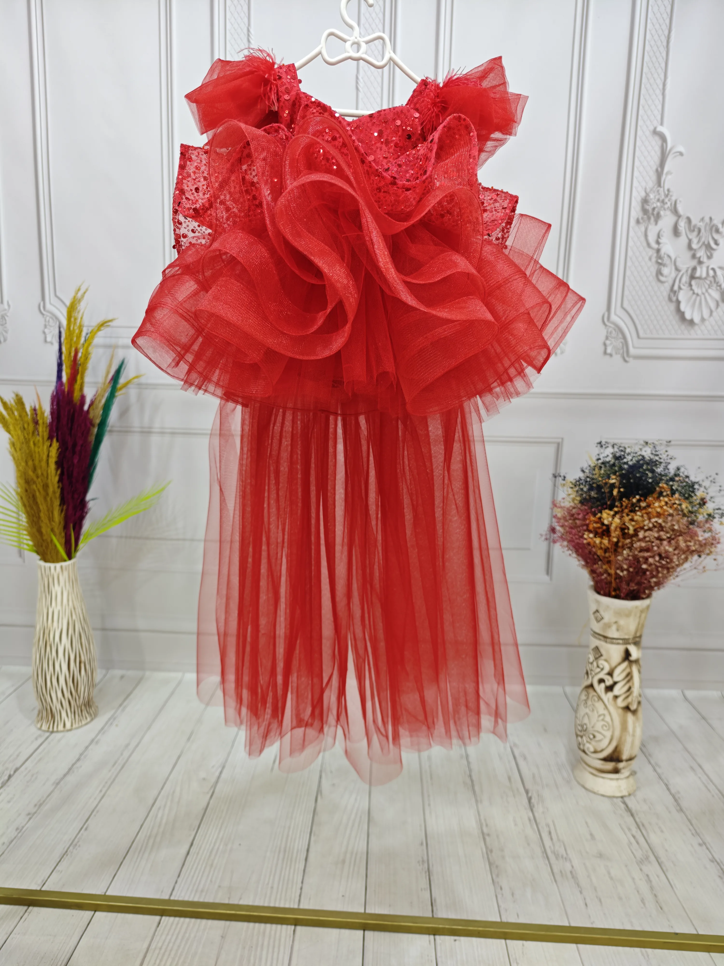 Kırmızı Boncuklu payetli fırfırlı Elbise Abiye