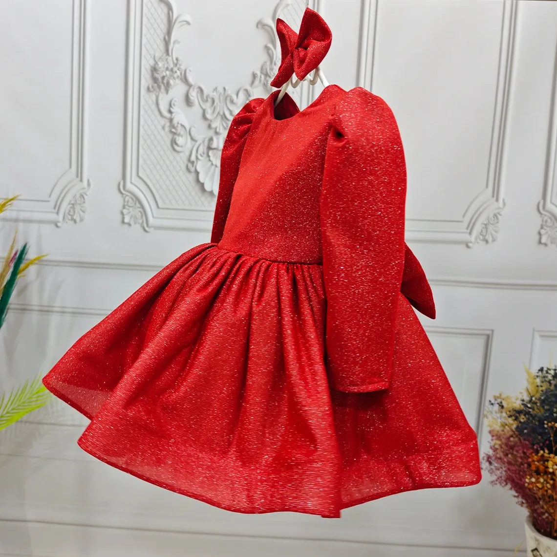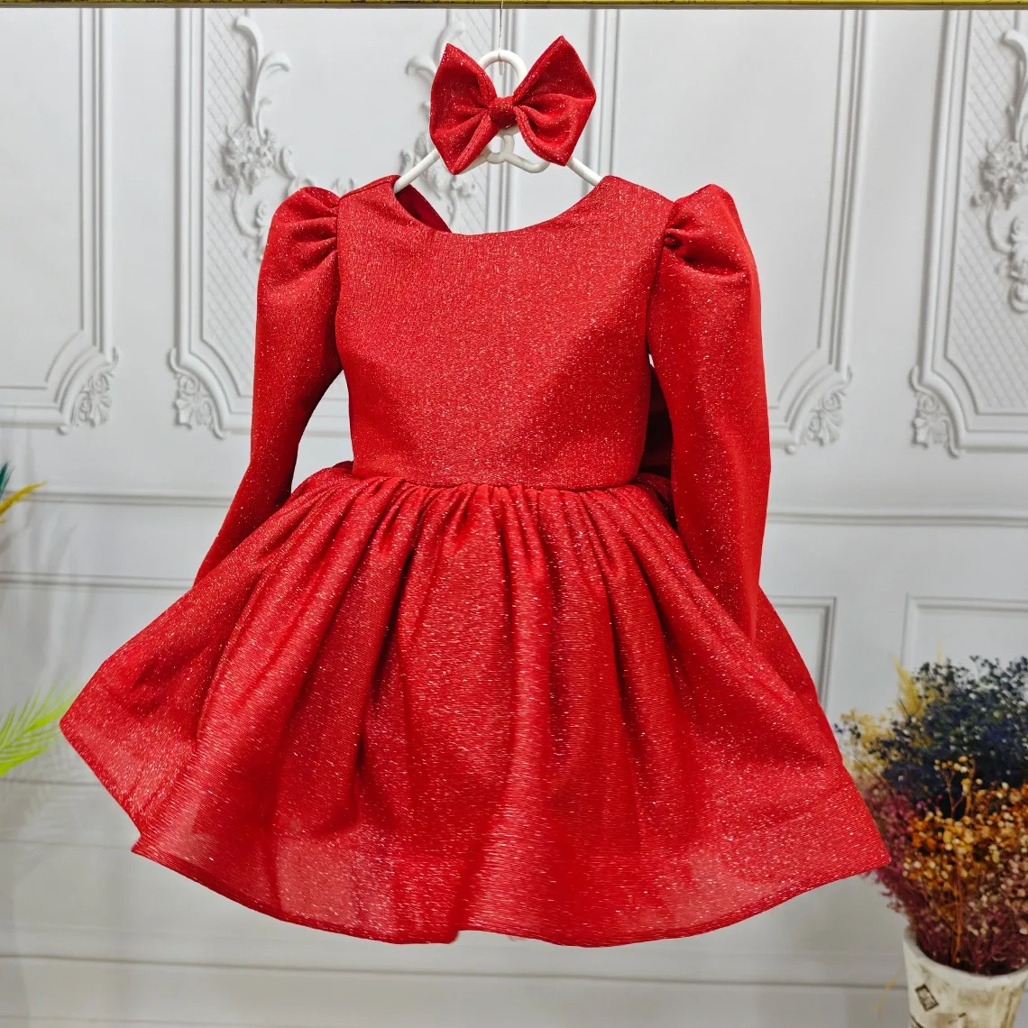 Kırmızı Parıltılı Elbise Abiye Gelinlik Uzun Kol Elbise