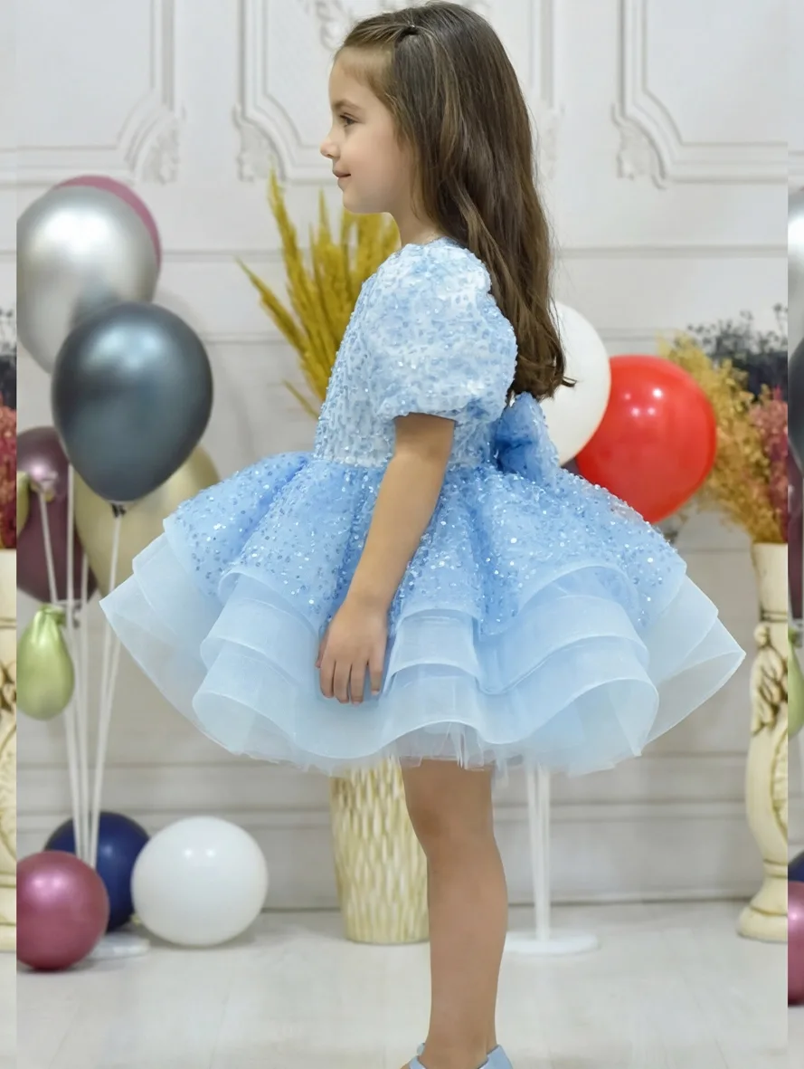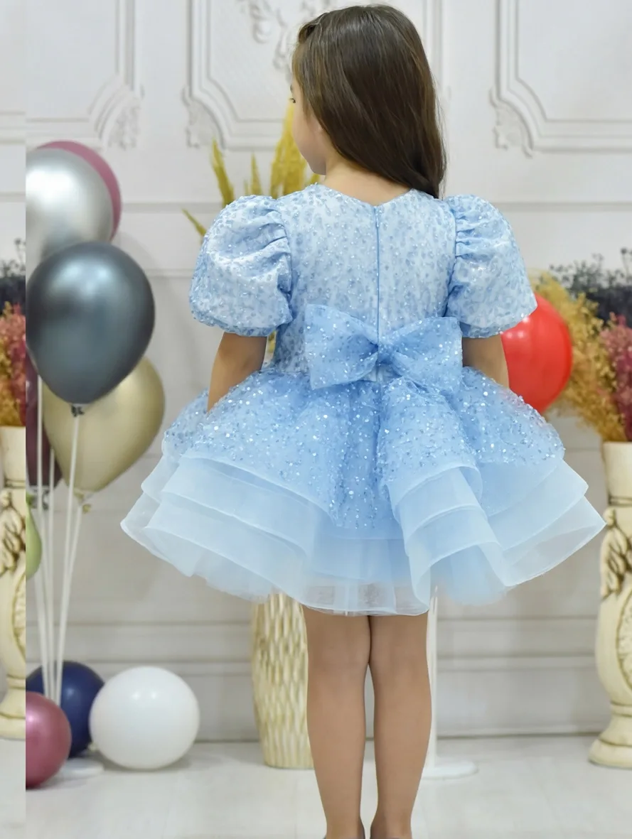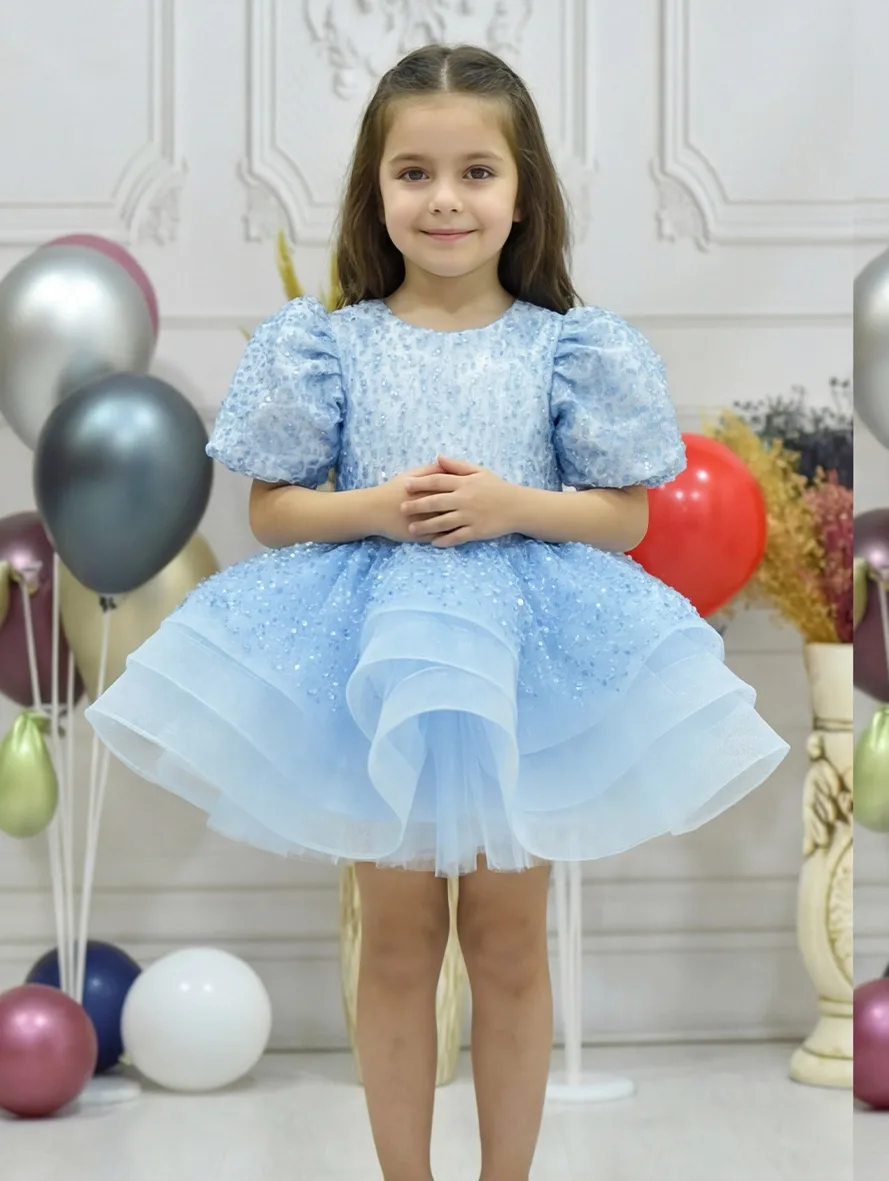 Kız Çocuk Bebe mavisi Kısa Balon Kol Taşlı Boncuklu Elbise