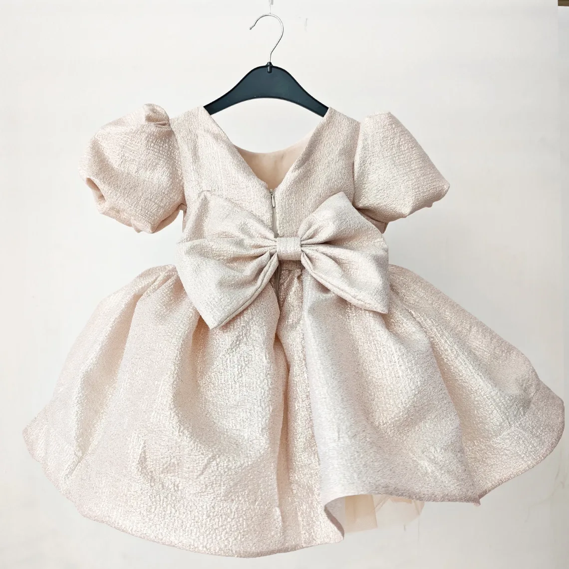 Kız Çocuk Açık Bej Renk Parıltılı Kısa Kol Kabarık Elbise