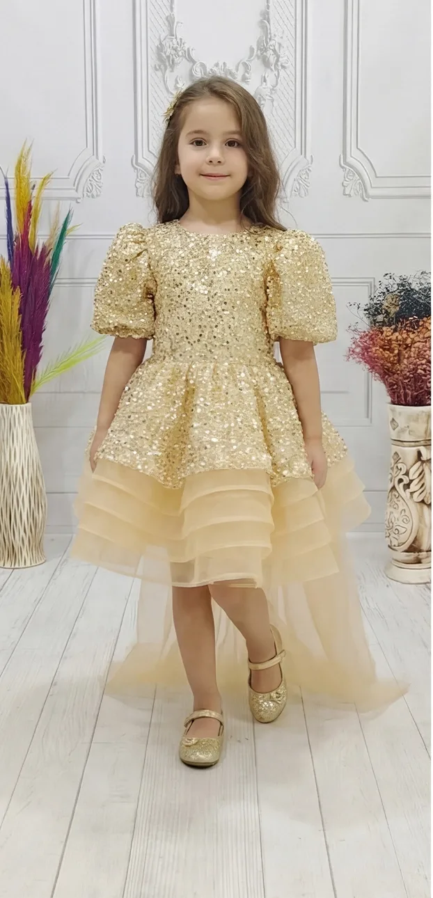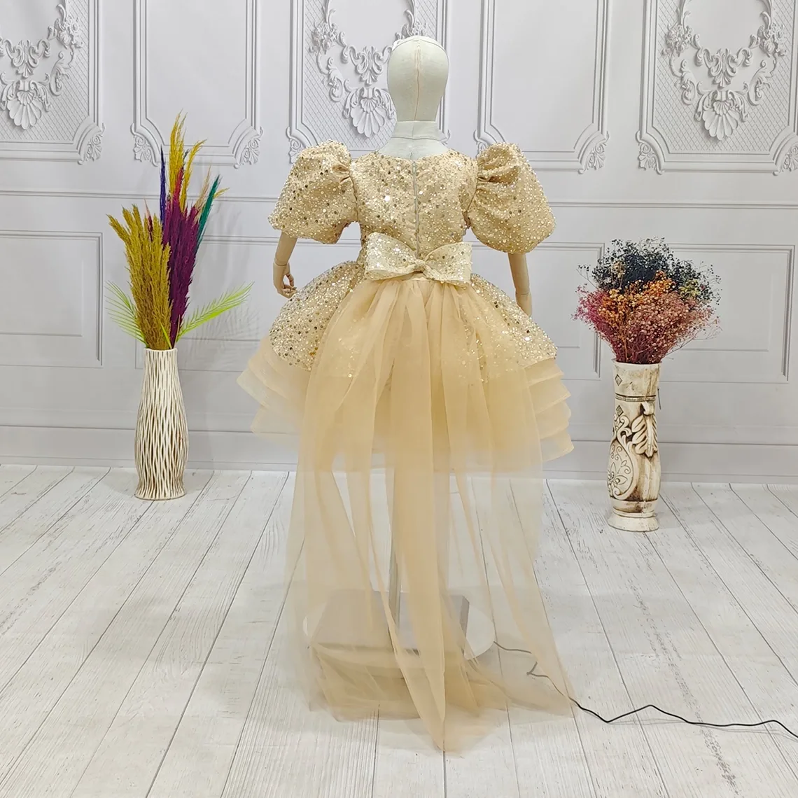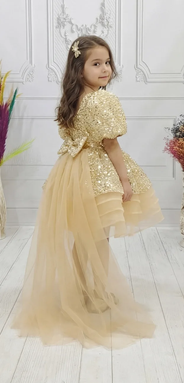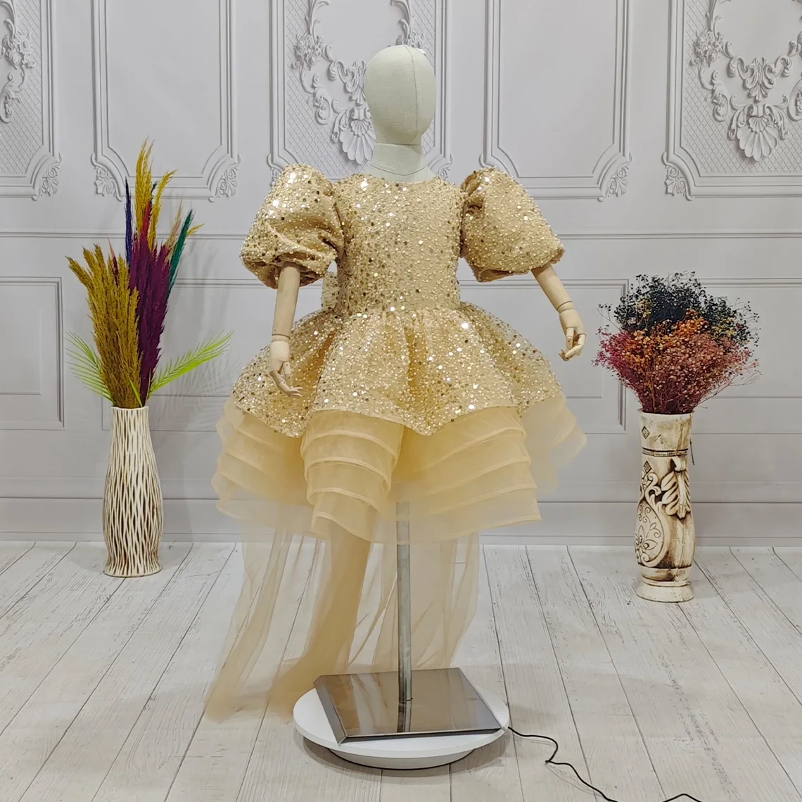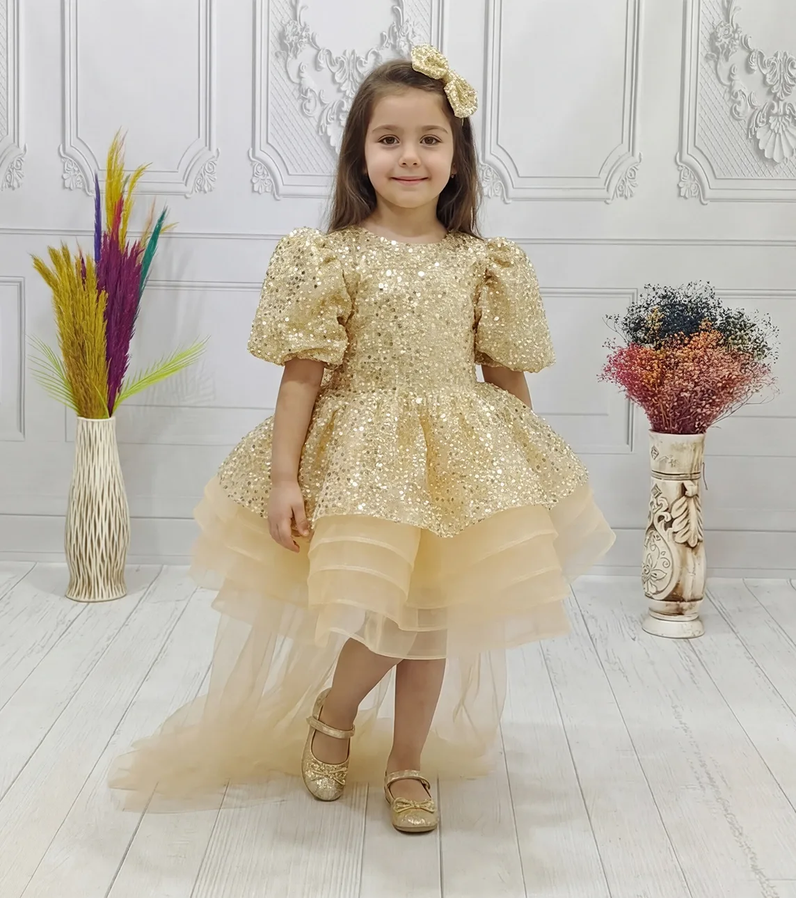 Kız Çocuk Bej Kuyruklu Boncuklu Payetli Kabarık Elbise