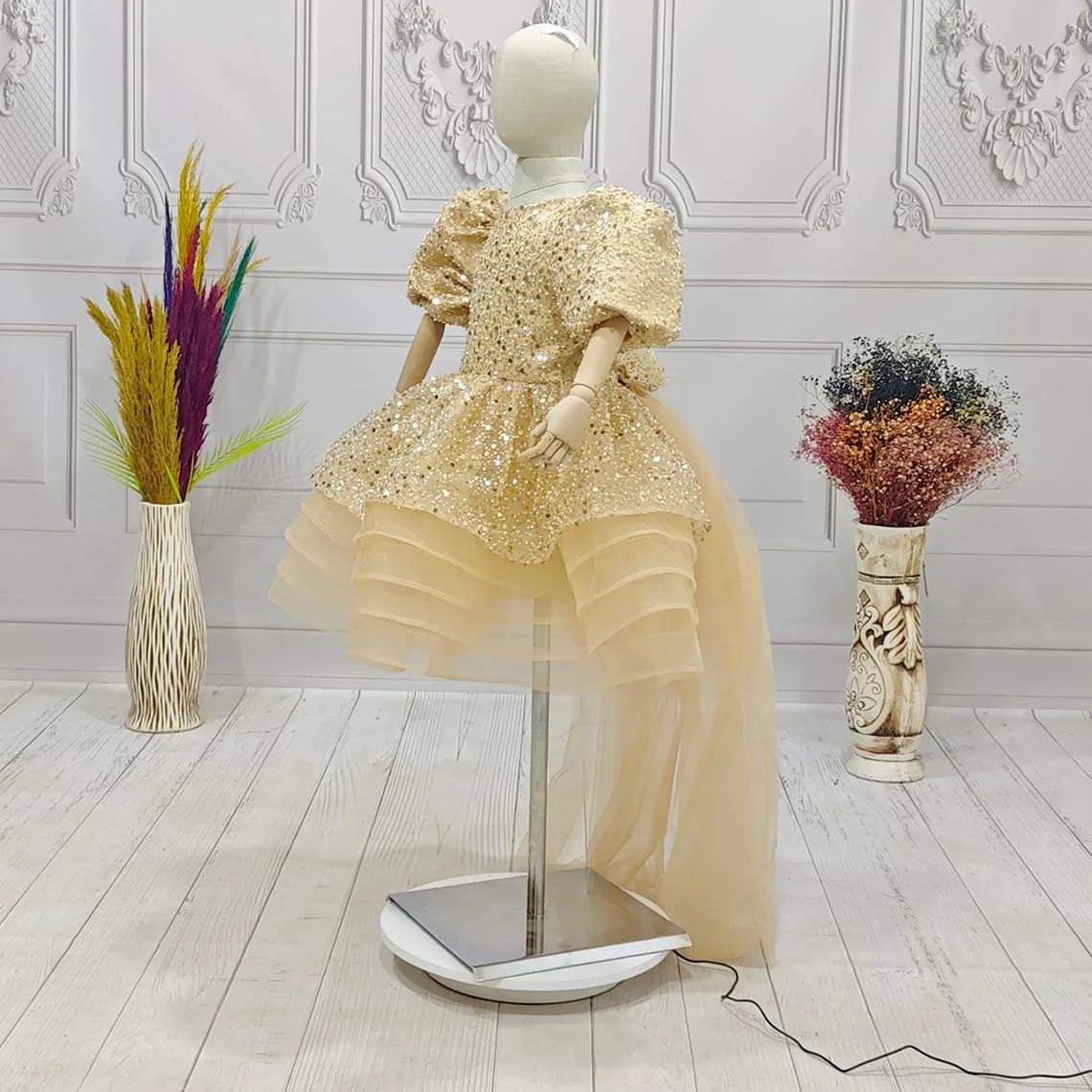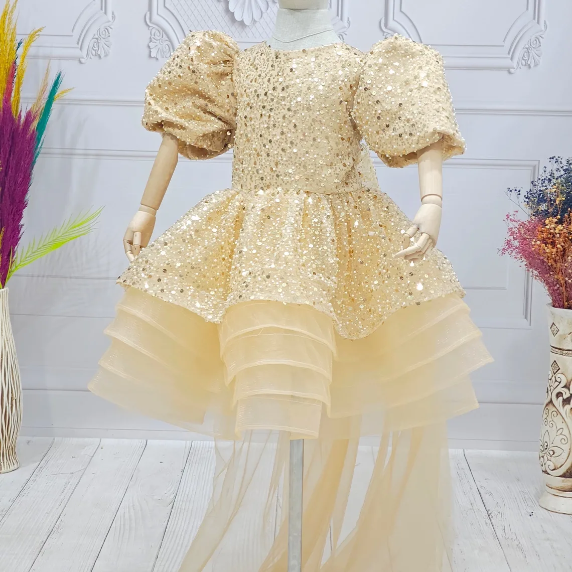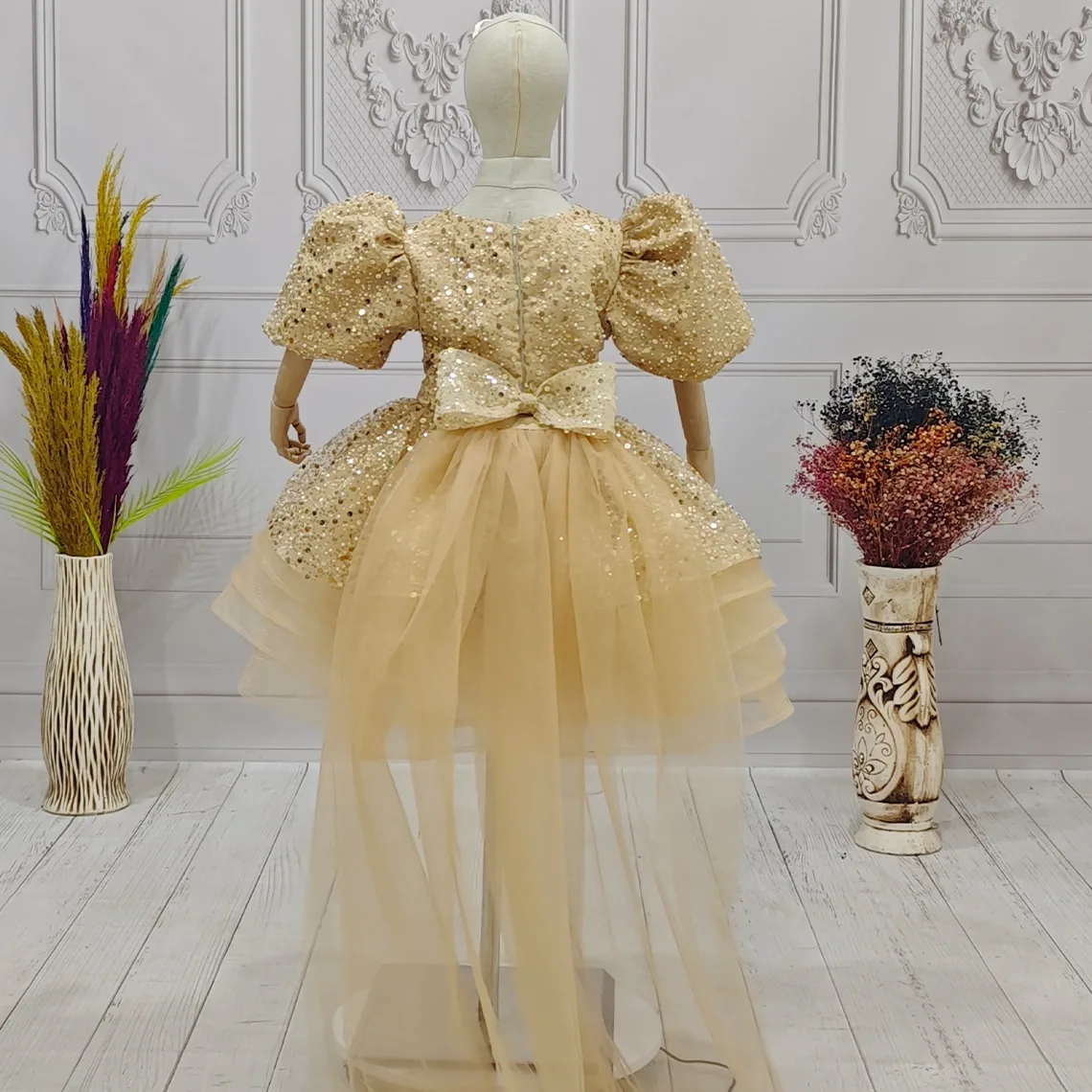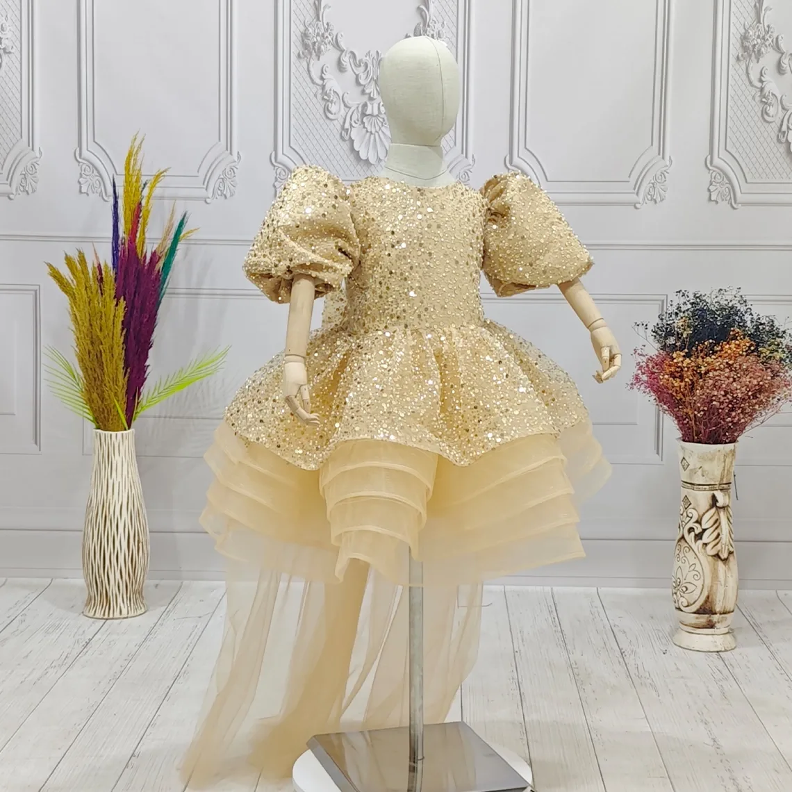 Kız Çocuk Bej Kuyruklu Boncuklu Payetli Kabarık Elbise