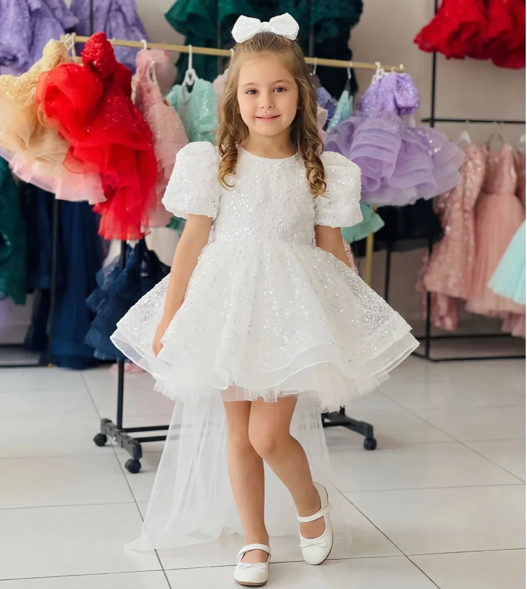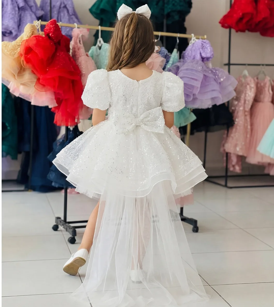 Kız Çocuk Beyaz Kuyruklu Şeffaf Gül Desenli Kısa Balon Kol Elbise Abiye