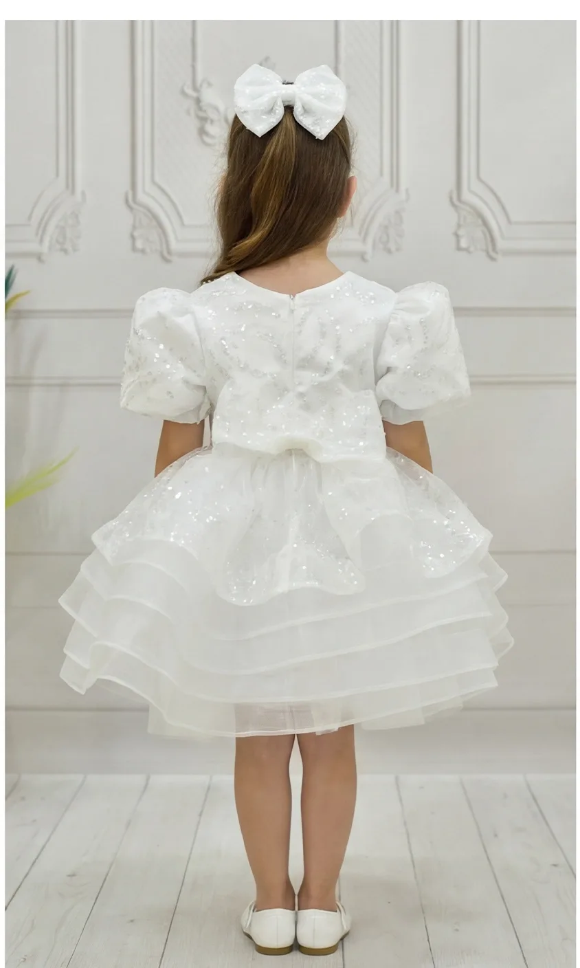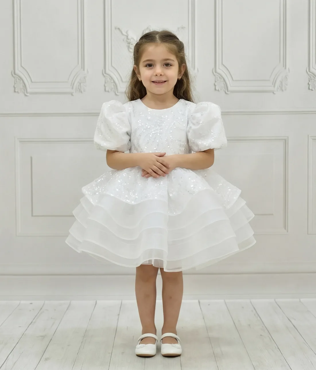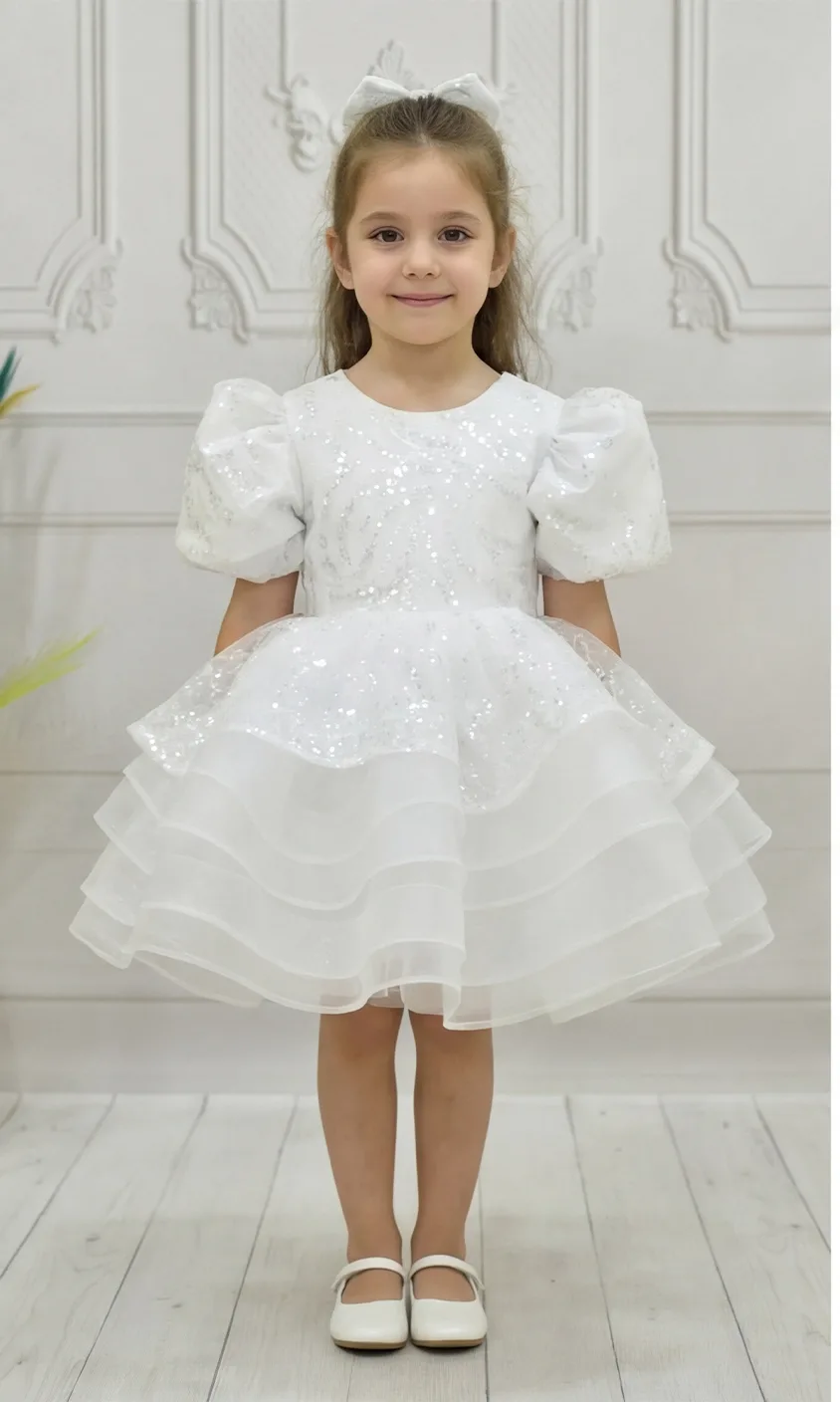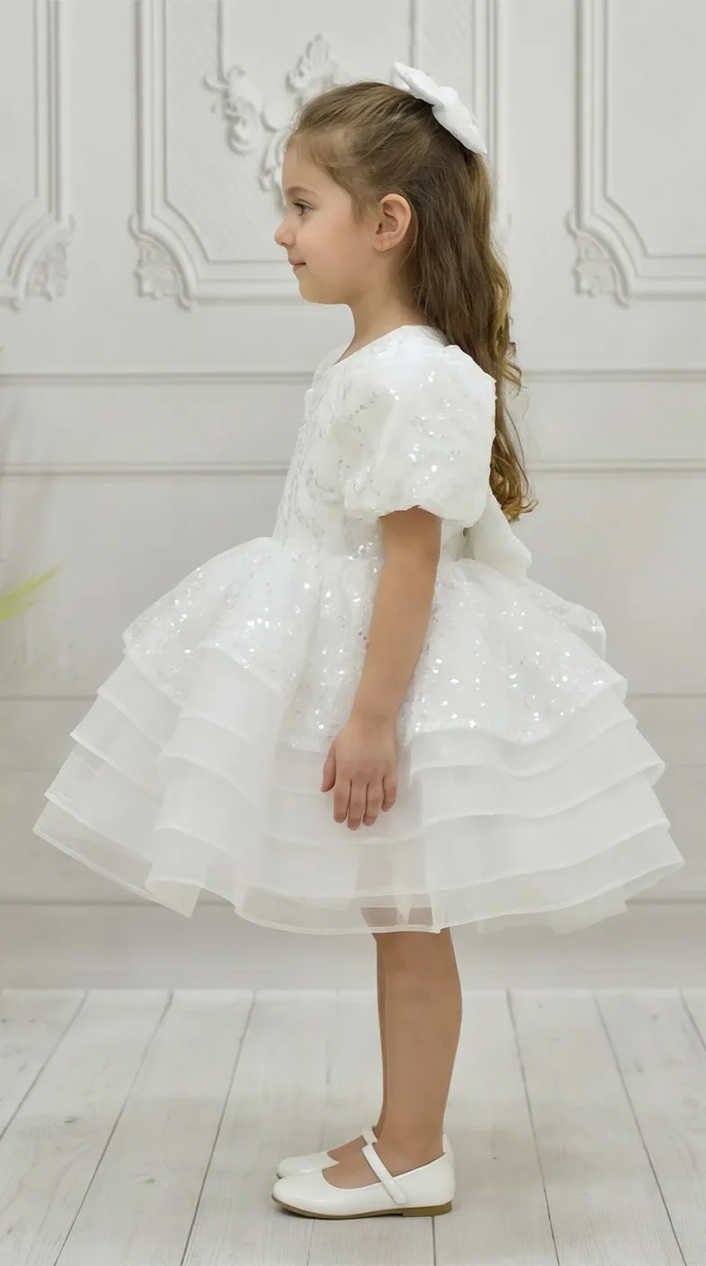 Kız Çocuk Beyaz Boncuklu Payetli Kısa Balon Kol Taşlı Boncuklu Elbise