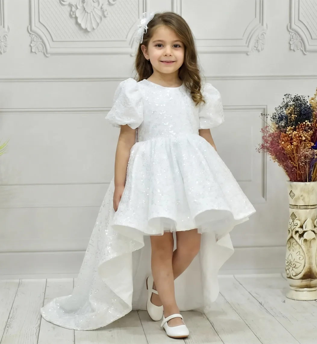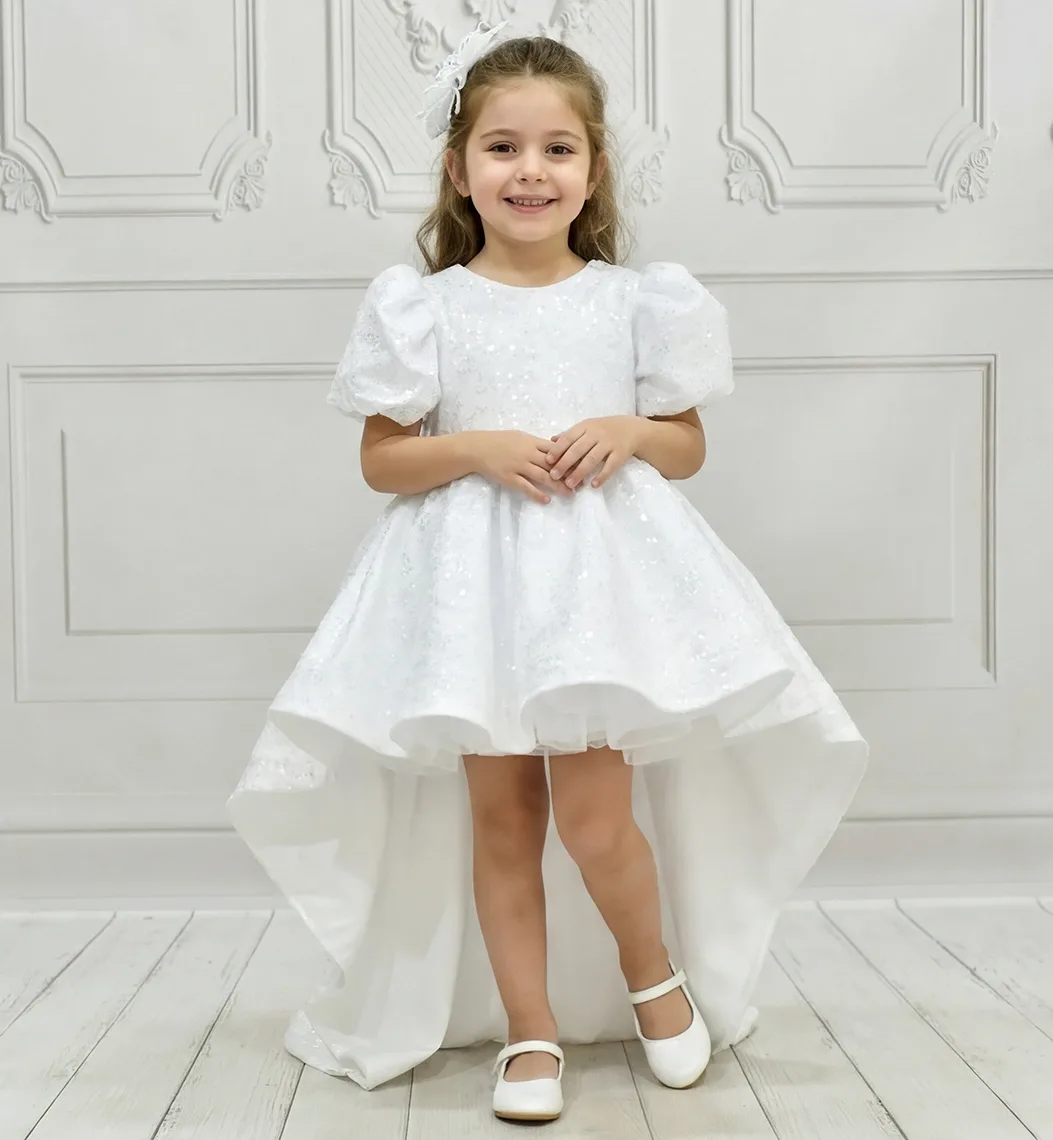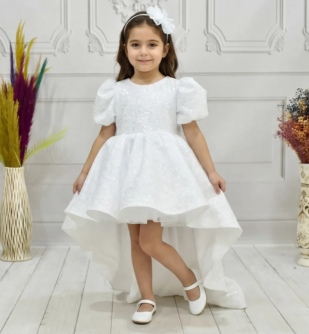 Kız Çocuk Beyaz Boncuklu Payetli Kuyruklu Kabarık Elbise
