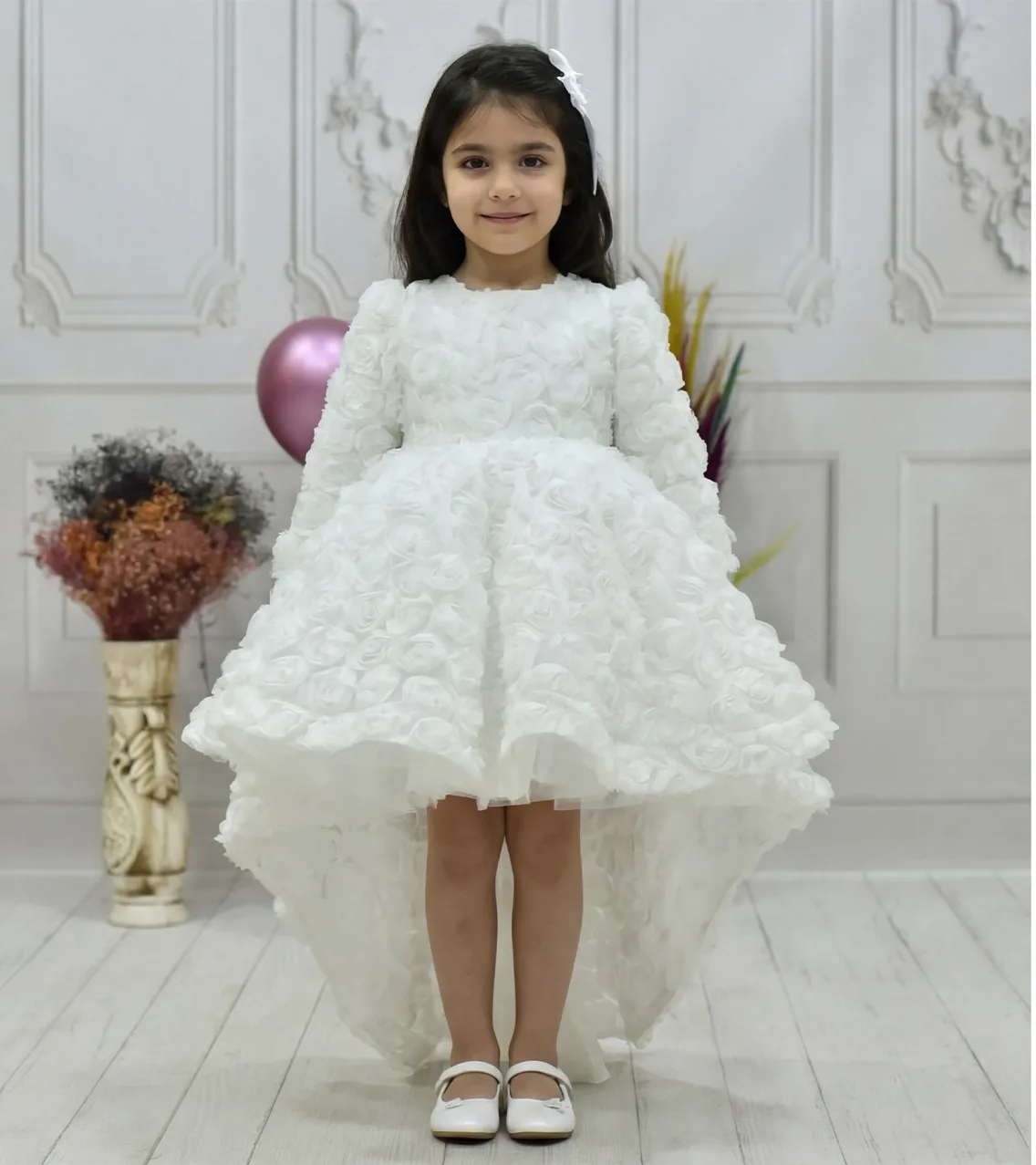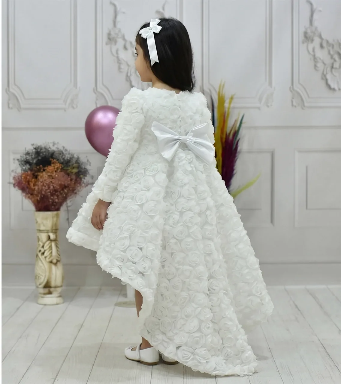 Kız çocuklar için özel olarak tasarlanan Elussi marka Beyaz Gül Desenli Kuyruklu Uzun Kol Elbise Abiye, şıklık ve zarafeti bir arada sunuyor.