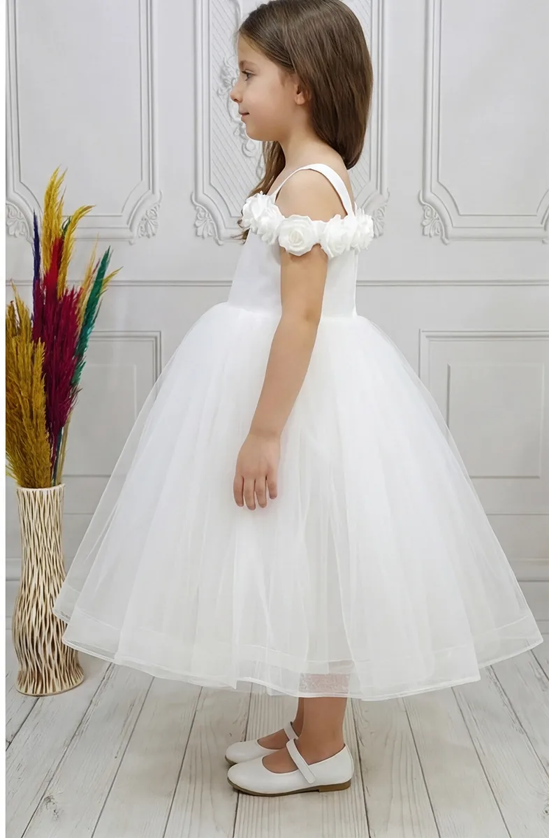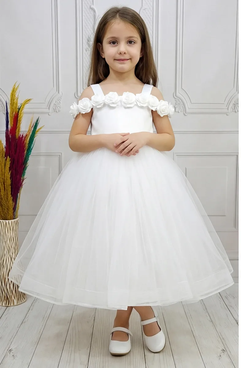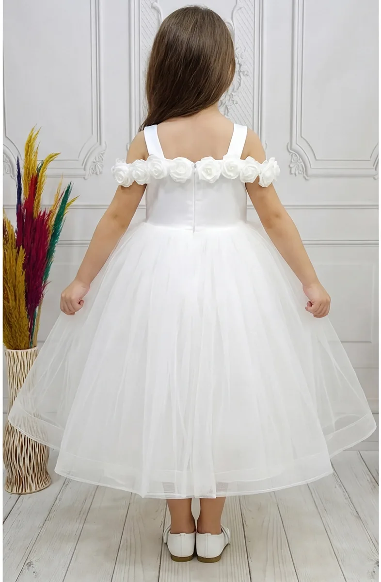 Kız Çocuk Beyaz Gül işleme Elbise Abiye Gelinlik