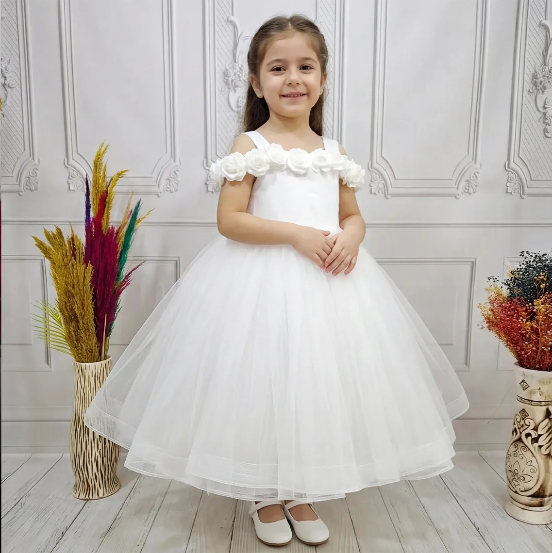 • Kız Çocuk Beyaz Gül işleme Elbise Abiye Gelinlik