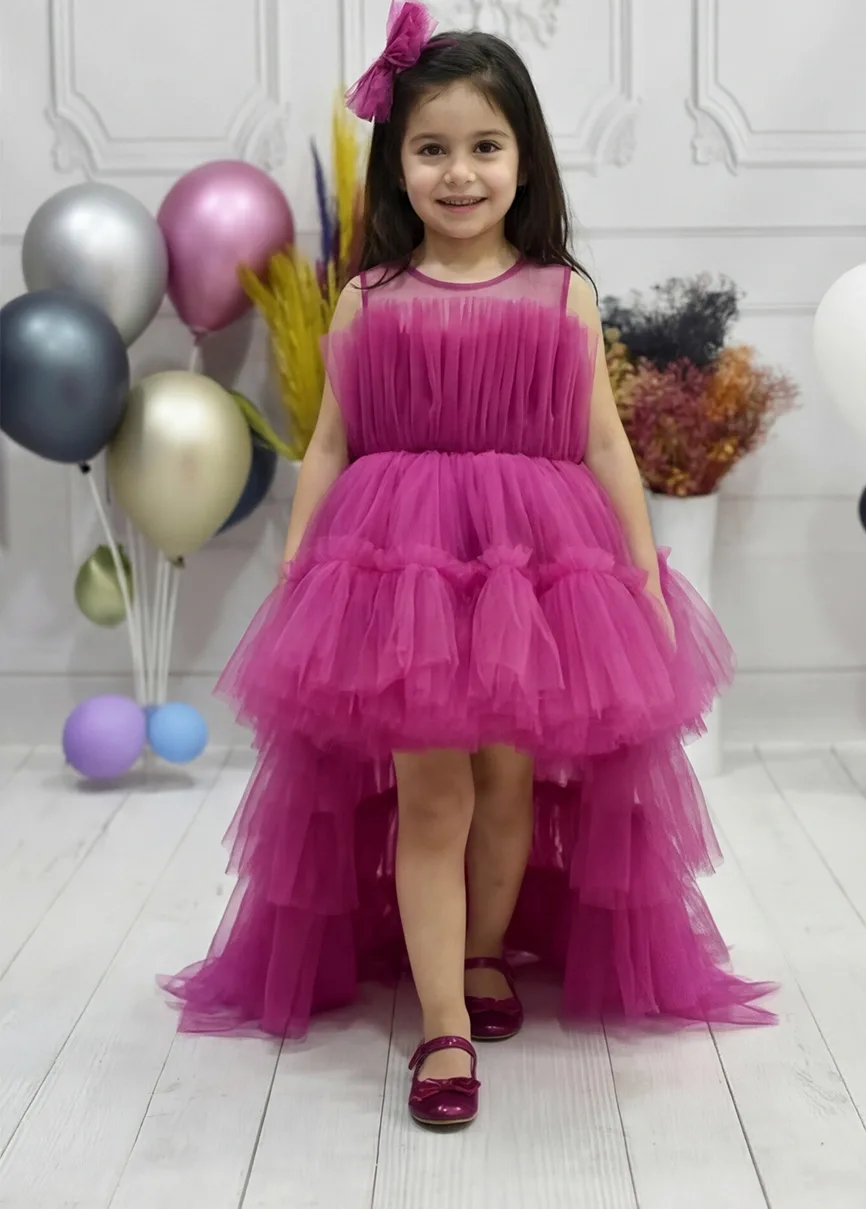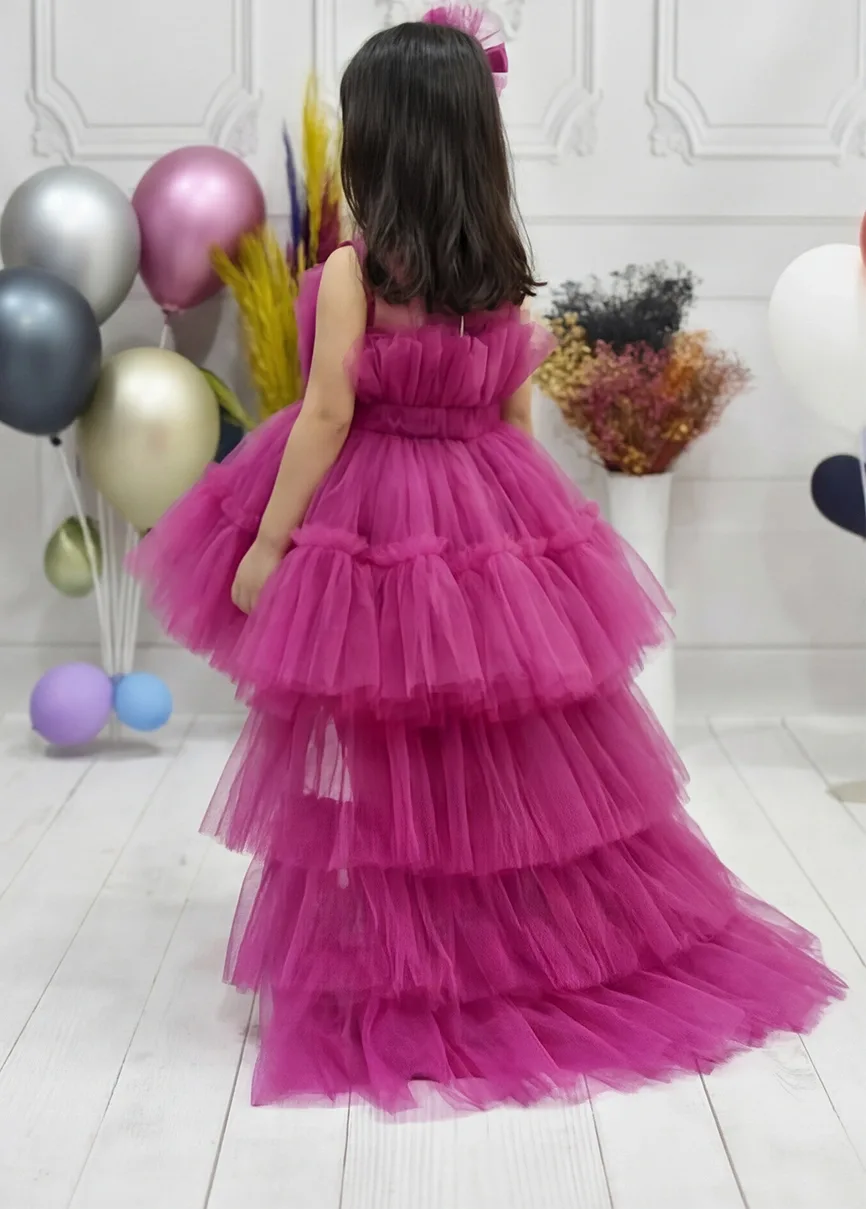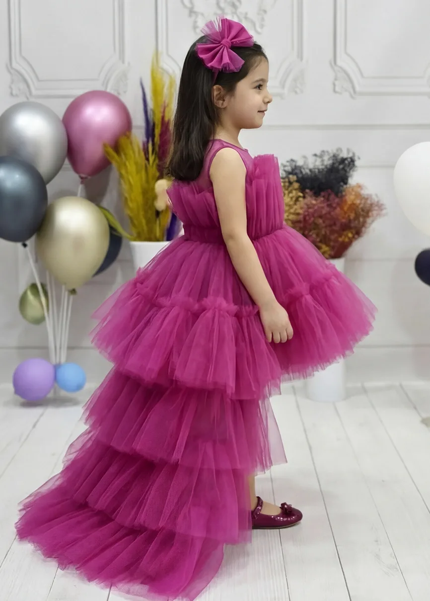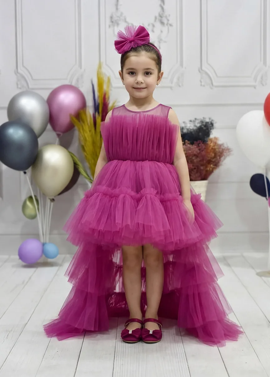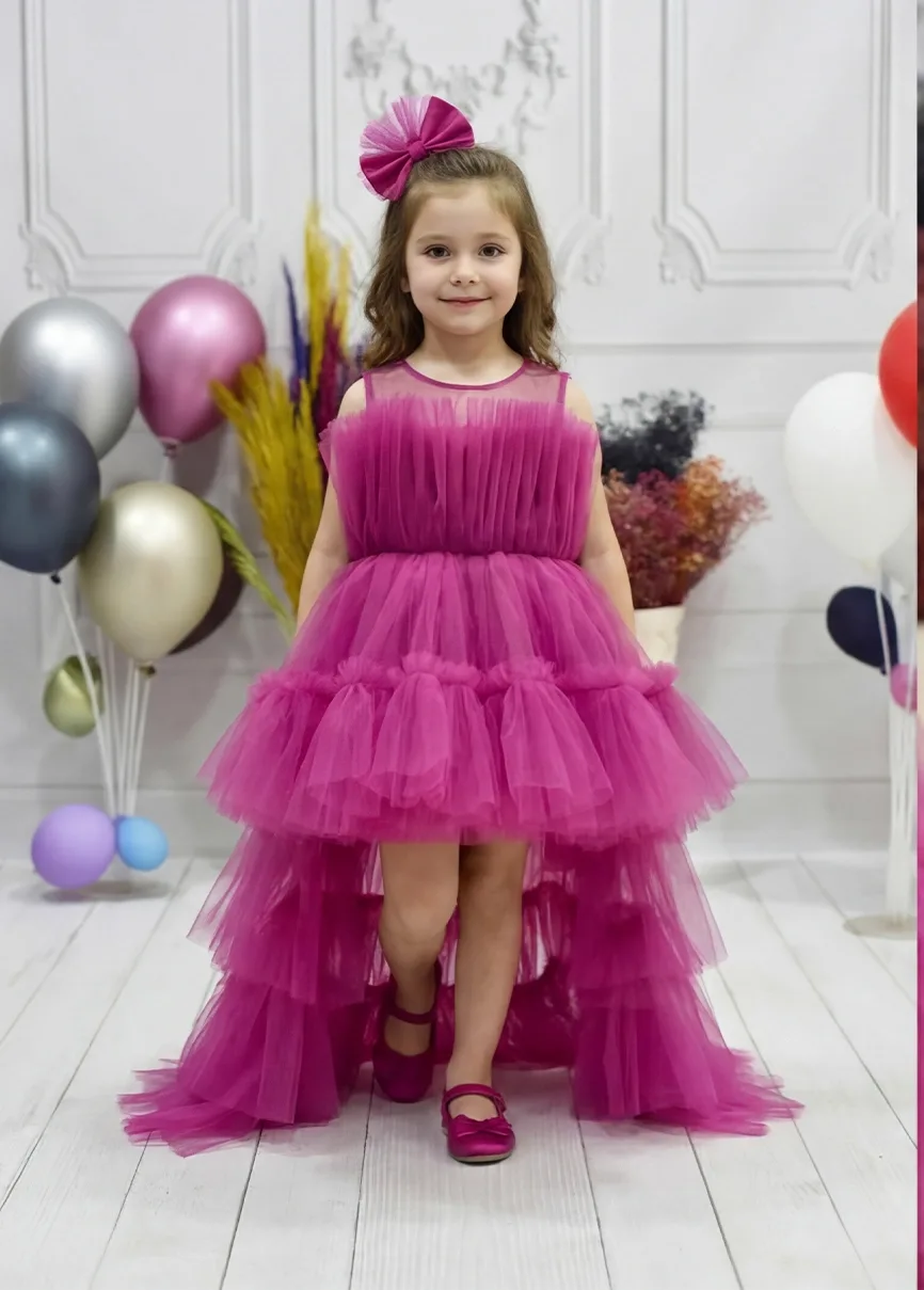 Kız Çocuk Fuşya Kuyruklu Gelinlik Tam Boy Abiye