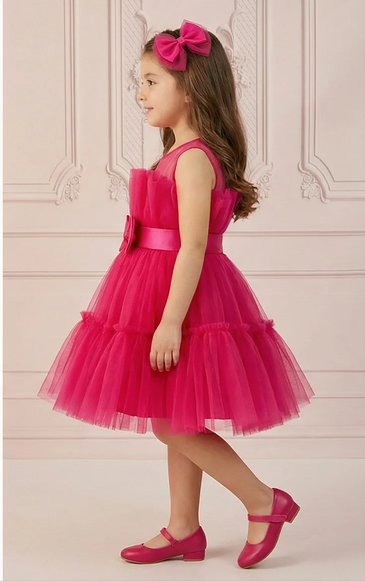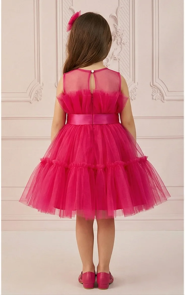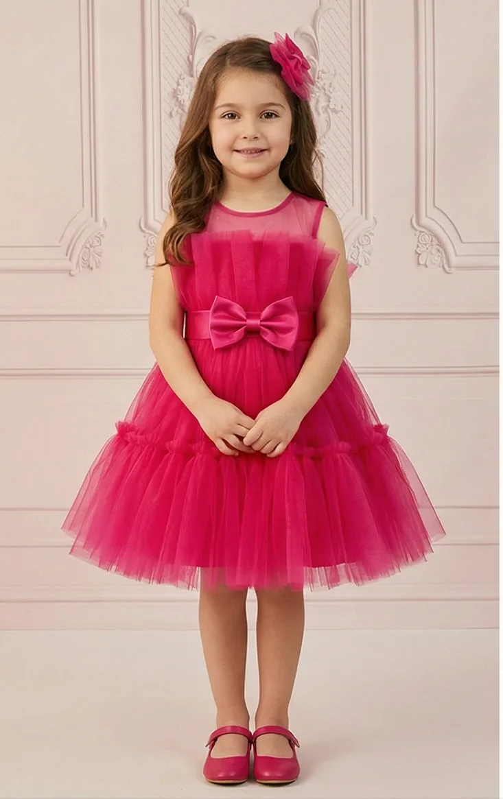 Kız Çocuk Fuşya Şeffaf Üst Ön Fiyonk Detaylı Kemerli Kabarık