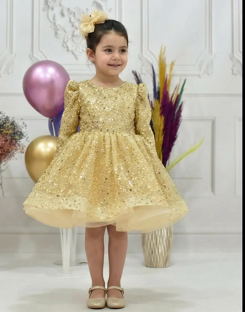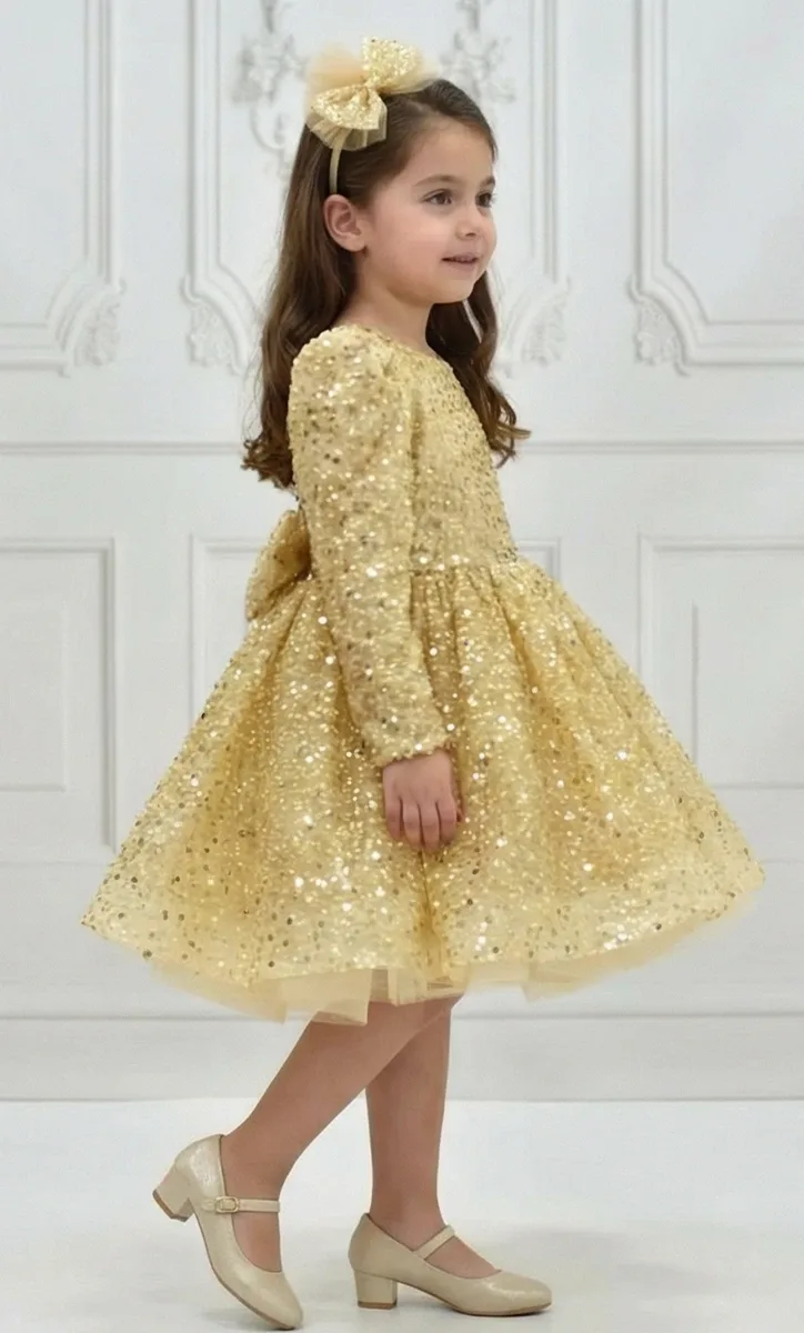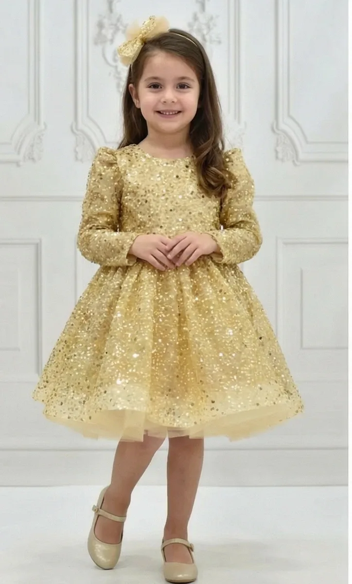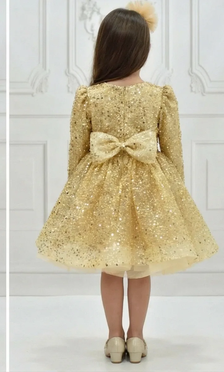 Kız Çocuk Gold Boncuklu Payetli Kabarık Elbise Uzun Kol