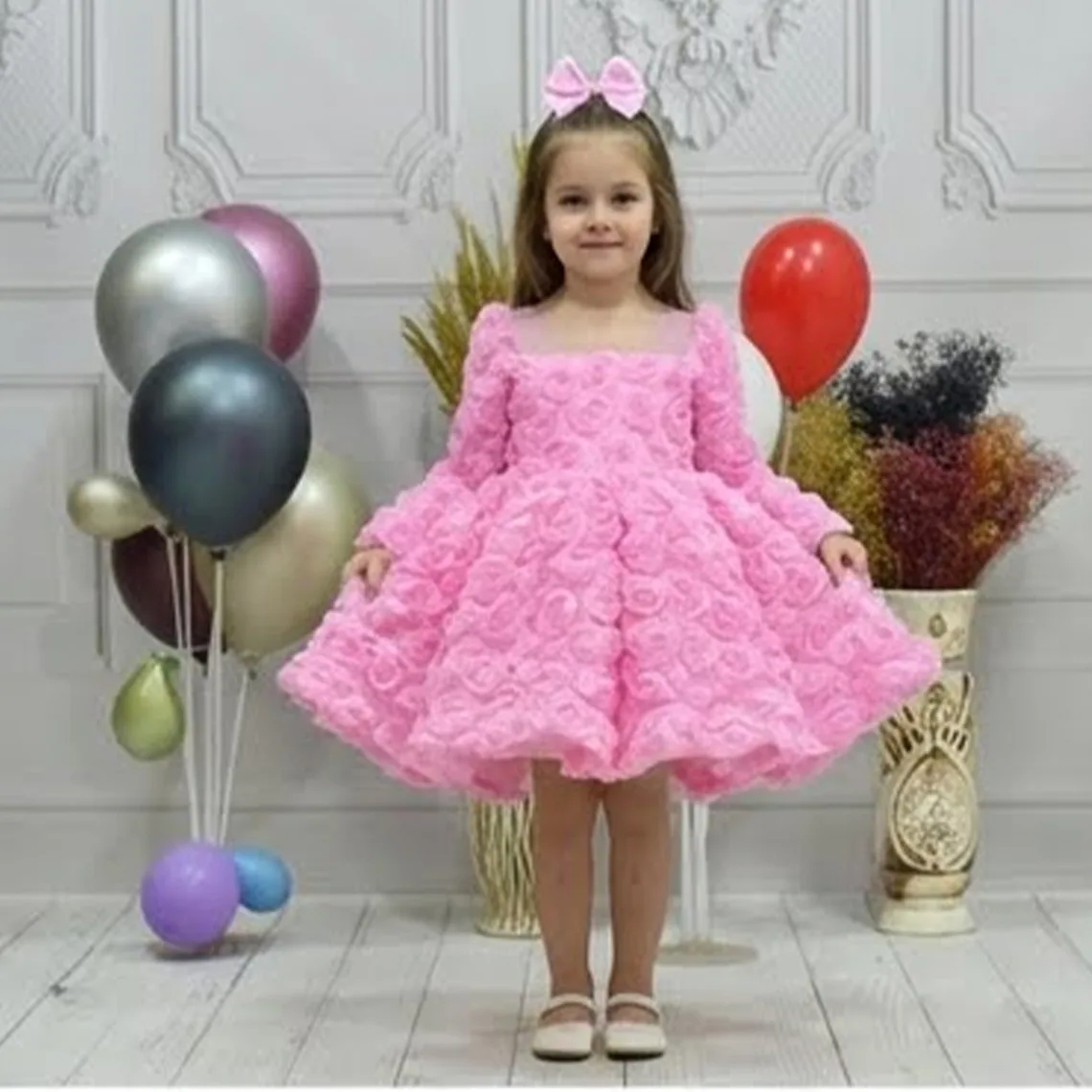 Kız Çocuk Pembe Şeffaf Gül Desenli Uzun Kol Kabarık Elbise