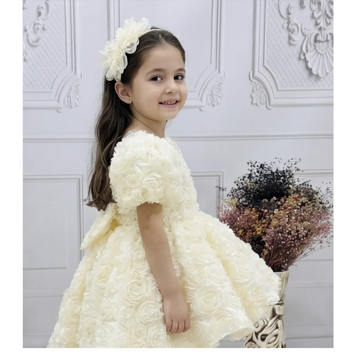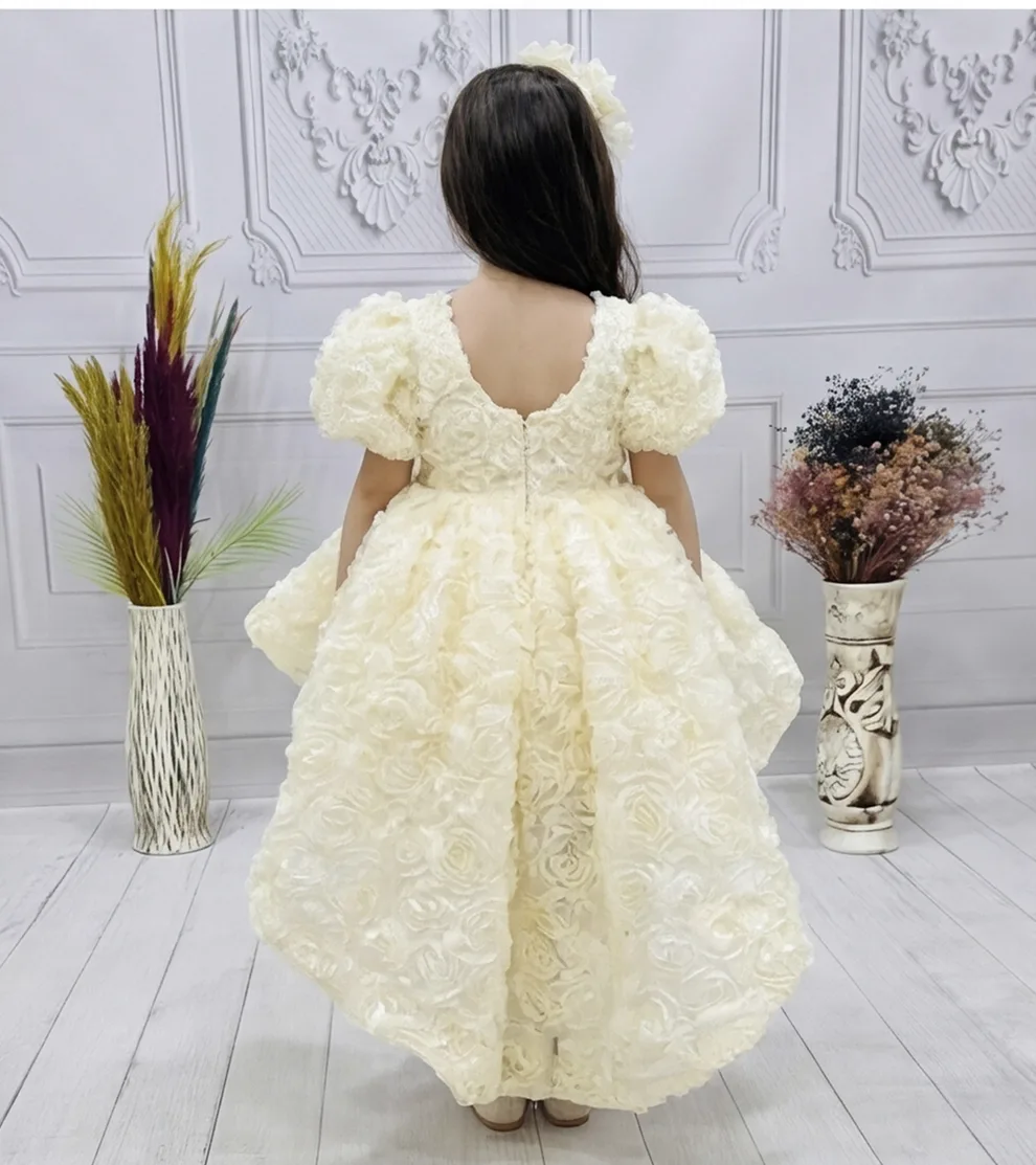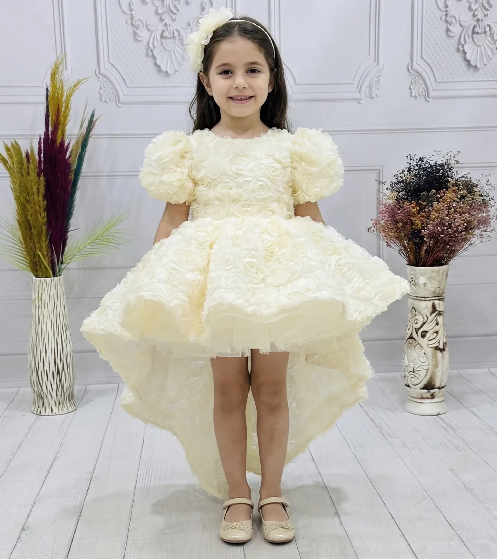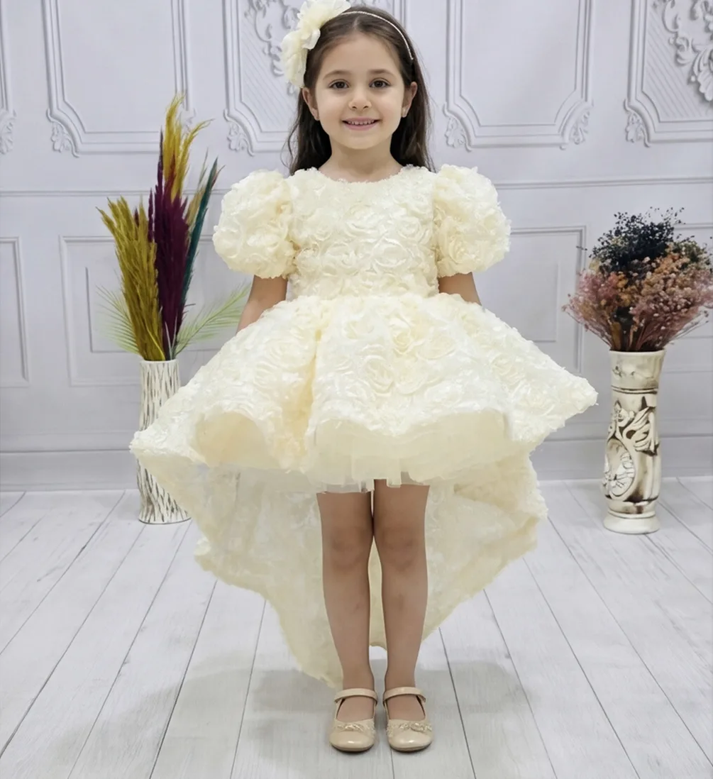 Kız Çocuk Krem Kuyruklu Gül Desenli Kapalı Yaaka Kısa Kol Elbise Abiye Elbise Gelinlik