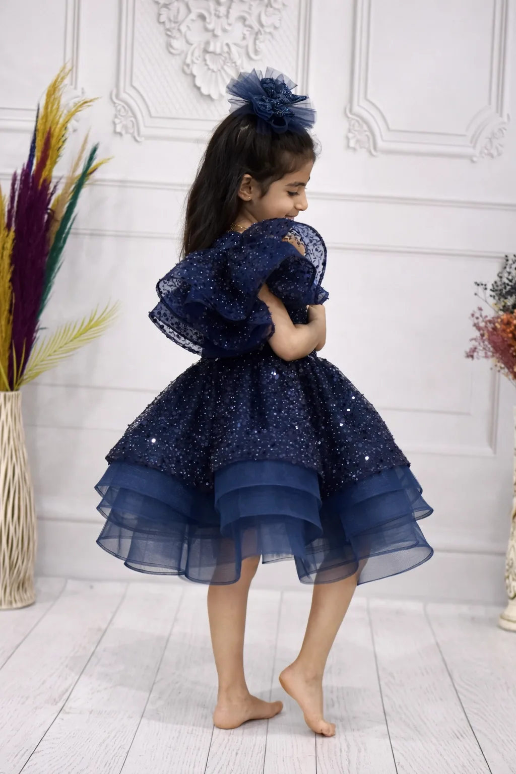 Kız Çocuk Lacivert Gül 3D Detaylı Kabarık Elbise Abiye Gelinlik