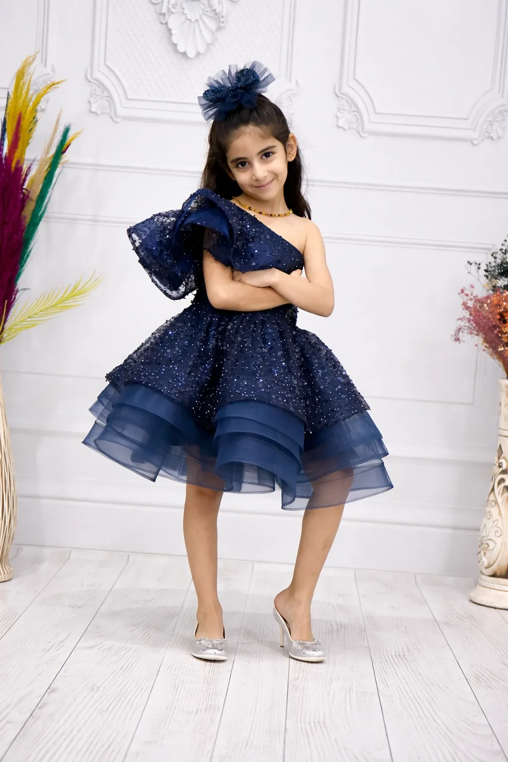 Kız Çocuk Lacivert Boncuklu Payetli Taşlı Tek Omuz Abiye Elbise