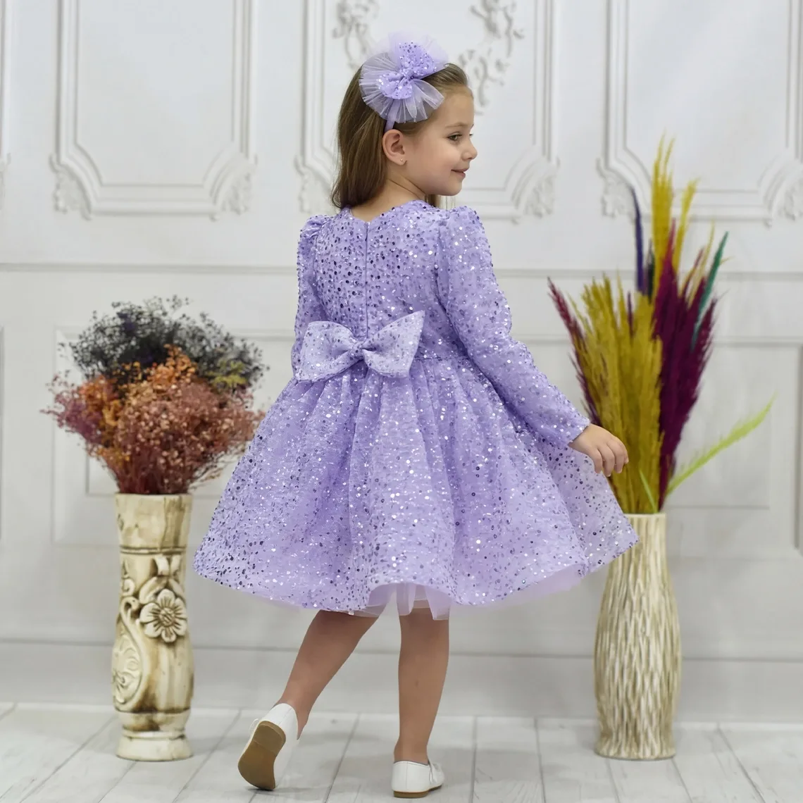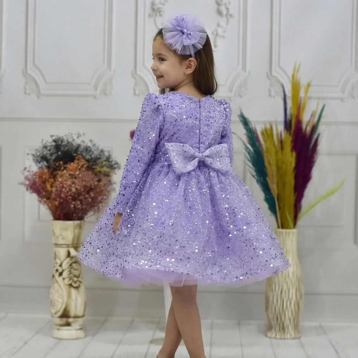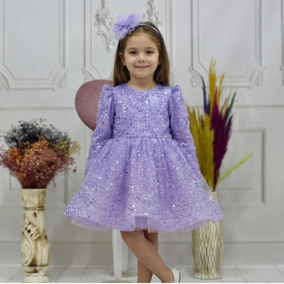 Kız Çocuk Lila Boncuklu Payetli Kabarık Elbise Uzun Kol Uzun Kol Uzun Kol Detaylı Kabarık Elbise Eteklerinde Gren Vardır ve Çok Kabarık Elbise Modelidir.