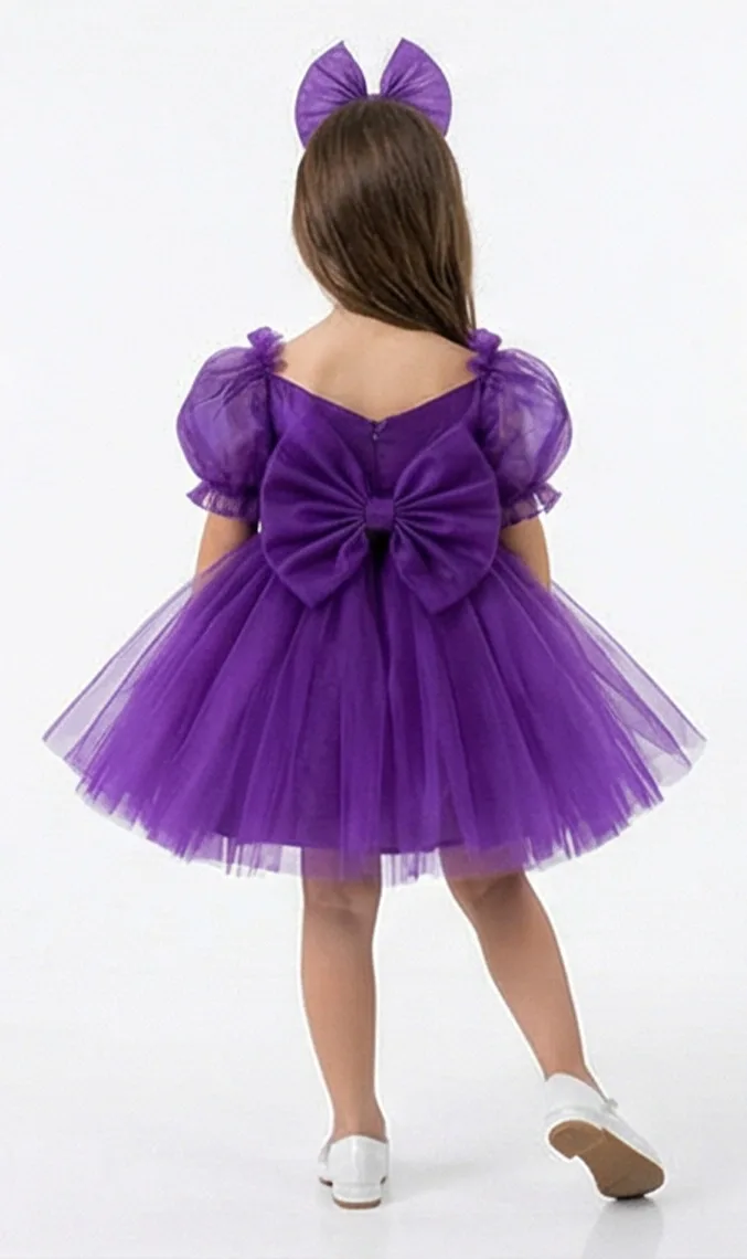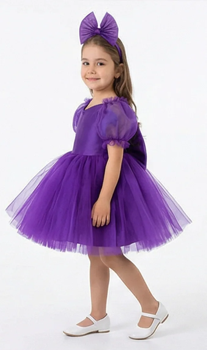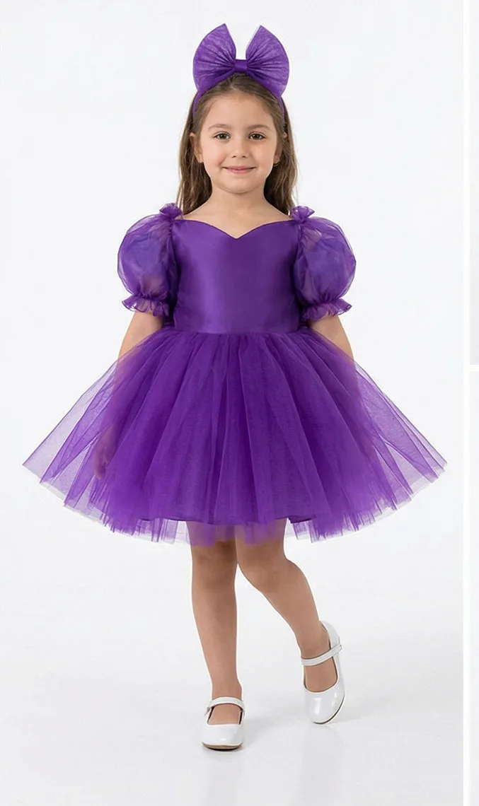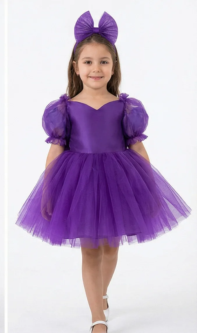 Kız Çocuk Mor Kalp Detaylı Kısa Balon Kol Kabarık Elbise