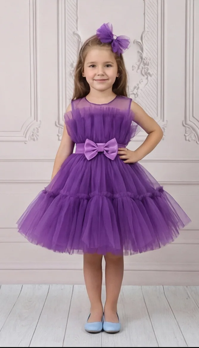 Mor Şeffaf Üst Ön Fiyonk Detaylı Kemerli Kabarık Elbise Çocuklarınız Düğün Doğum Günü ve Partilerde Kullanacağınız Harika Elbisedir.