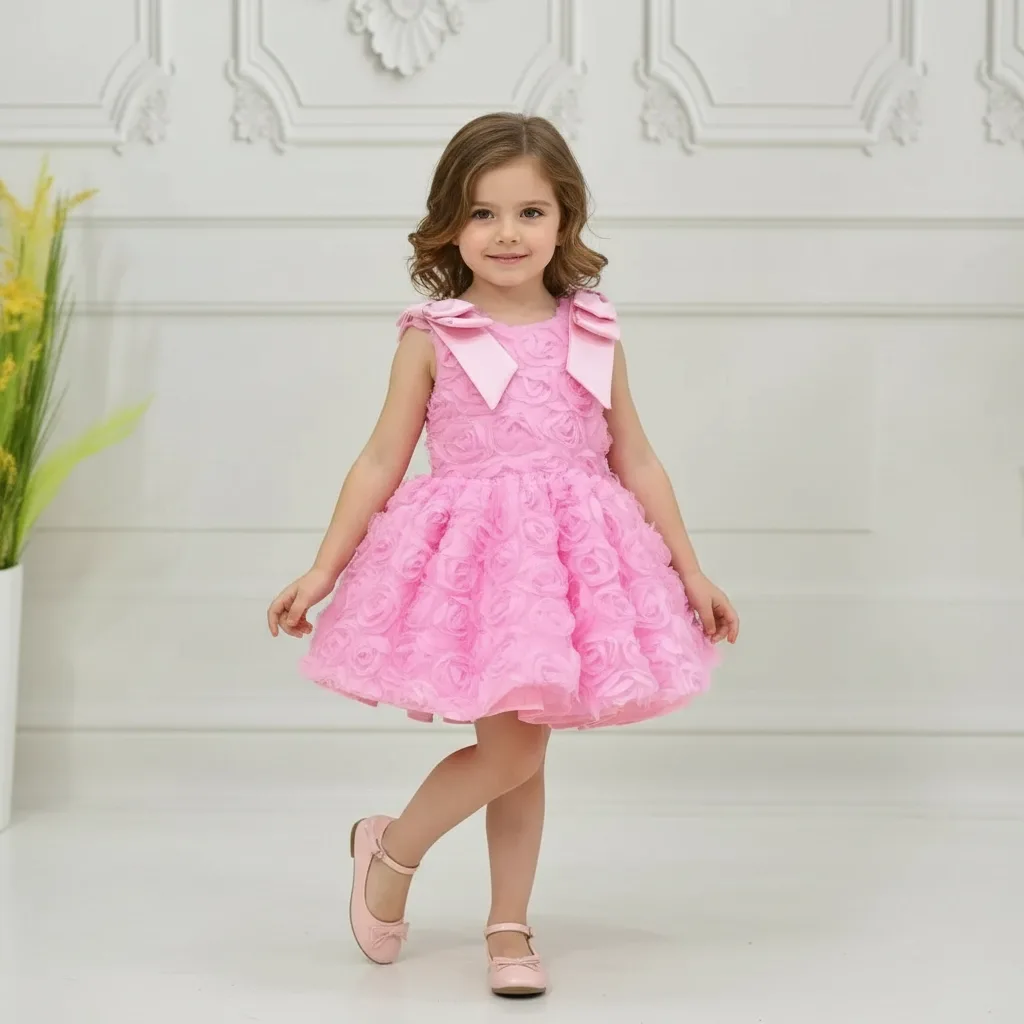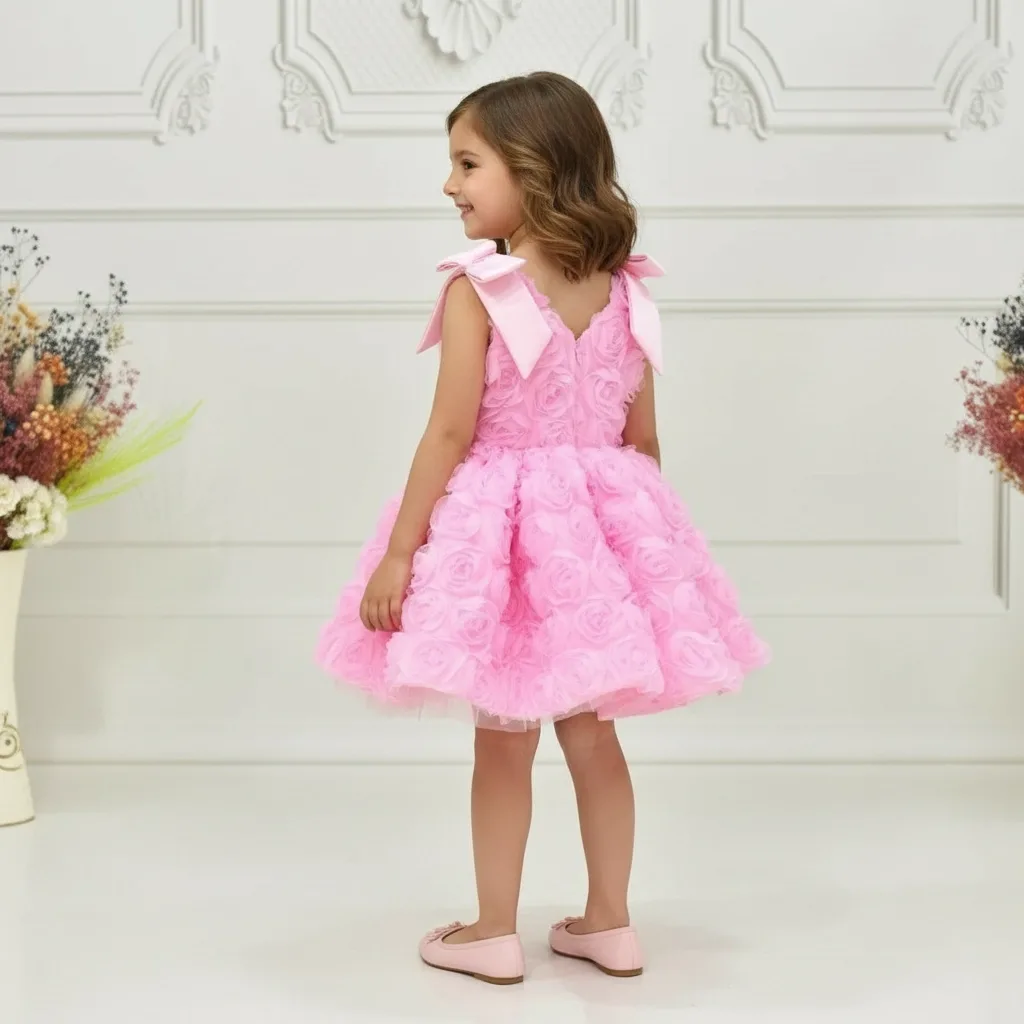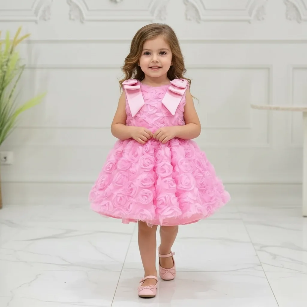 Kız Çocuk Pembe Gül 3D Kabarık Elbise Abiye Gelinlik
