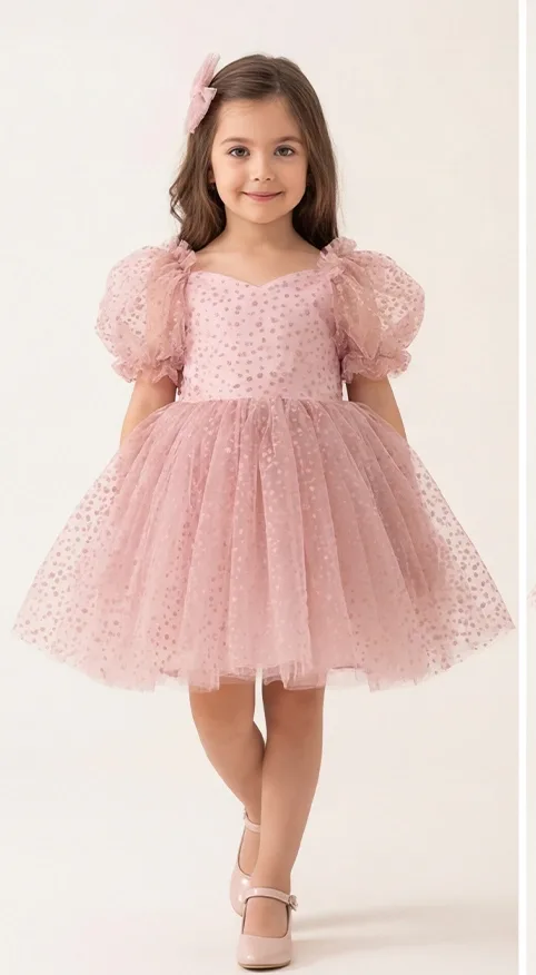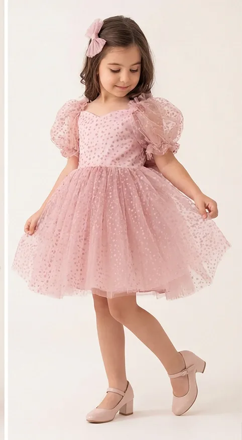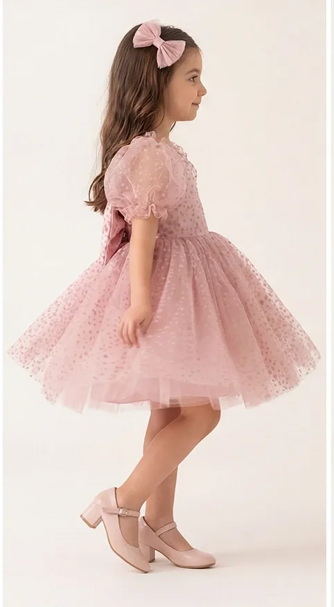 ELLUSSİ Kız Çocuk Pudra Flok Tüllü Prenses Kol Kalp Detaylı Kabarık Elbise - Kızınızın prenses olmasını sağlayacak zarif ve şık tasarım.