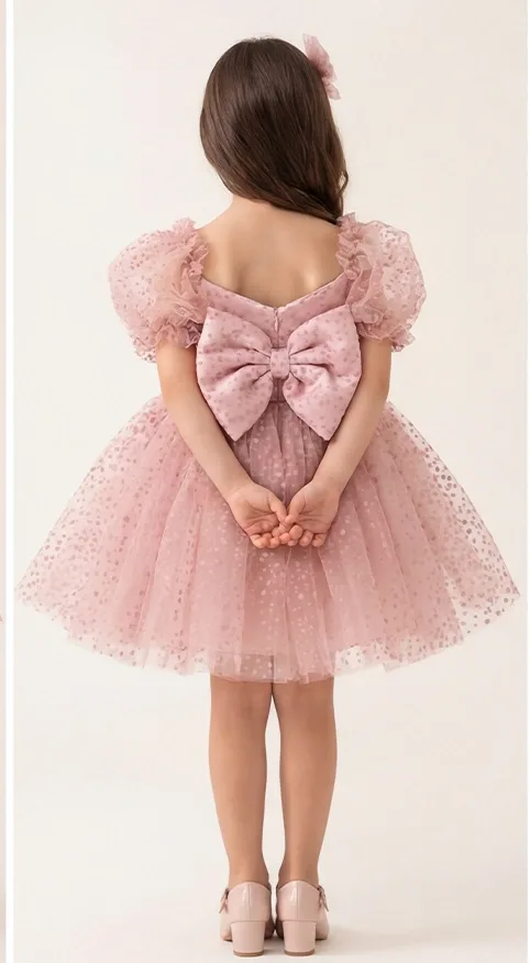 Kız Çocuk Pudra Flok Tüllü Prenses Kol Kalp Detaylı Kabarık Elbise