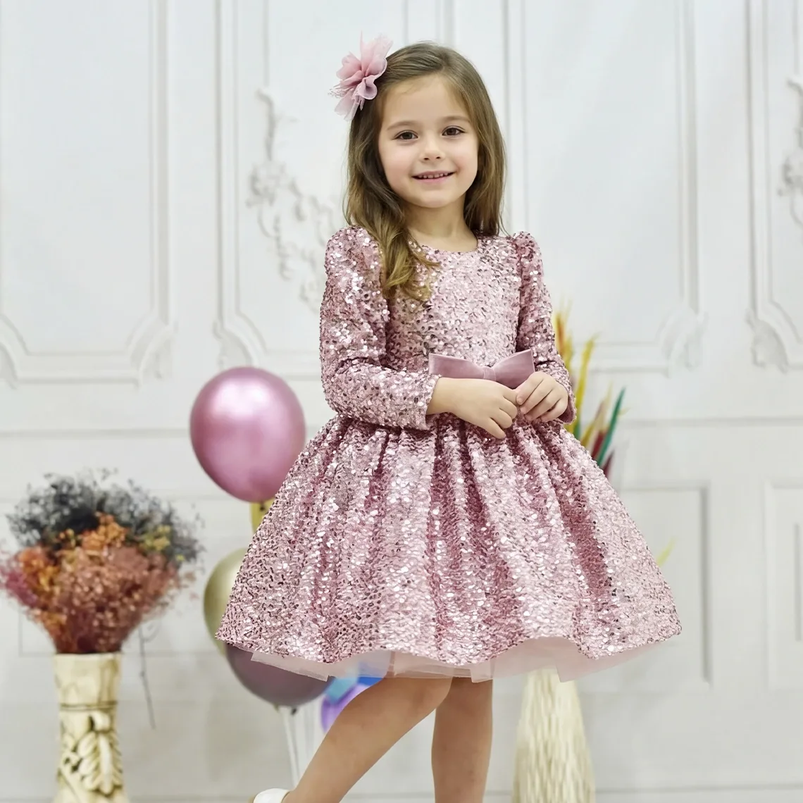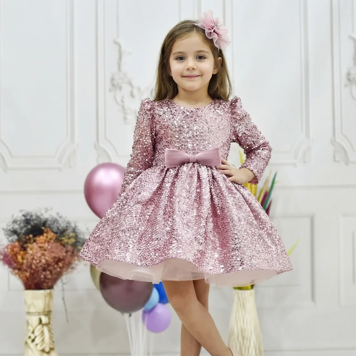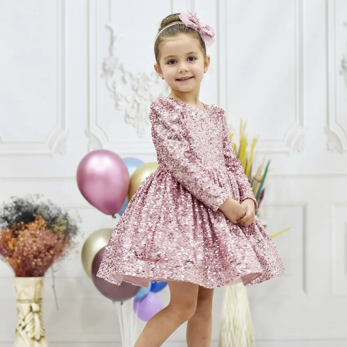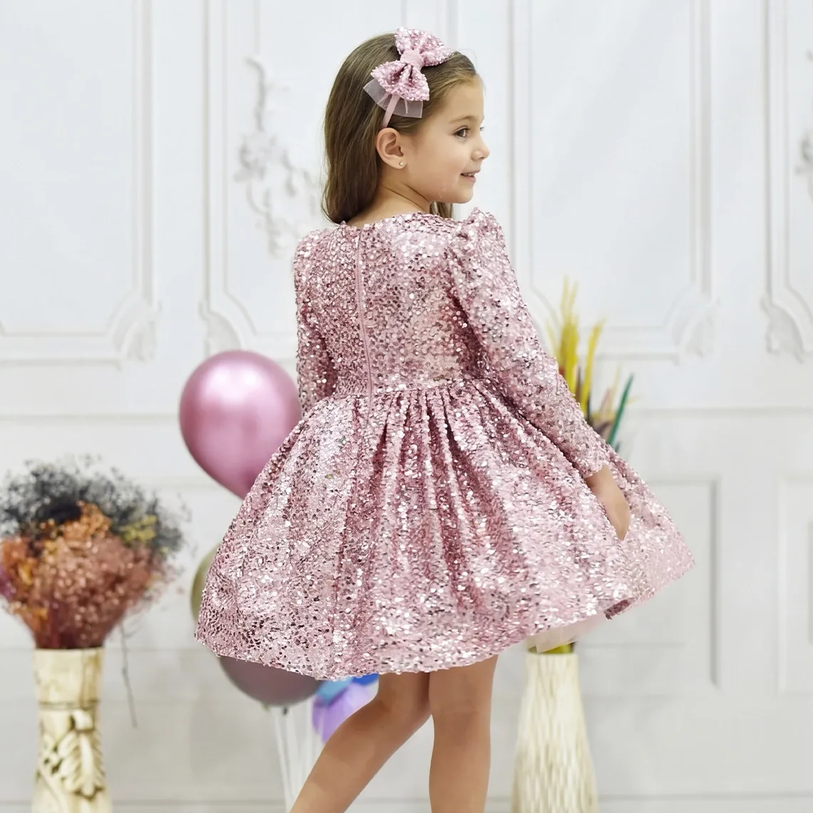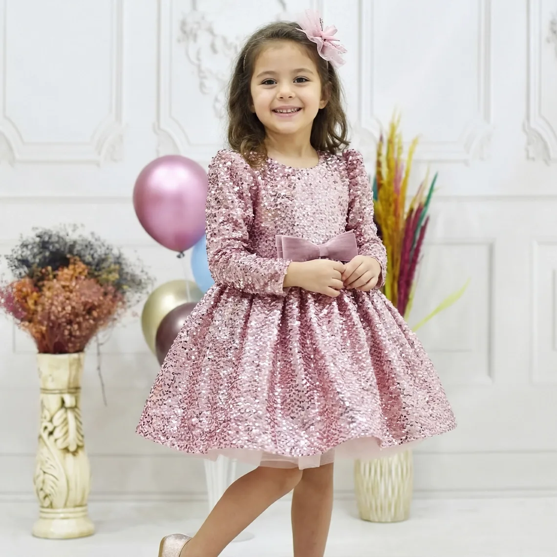 Kız Çocuk Pudra Payetli Tüy Detaylı Uzun Kol Bisiklet Yaka Grenli Kabarık Elbise