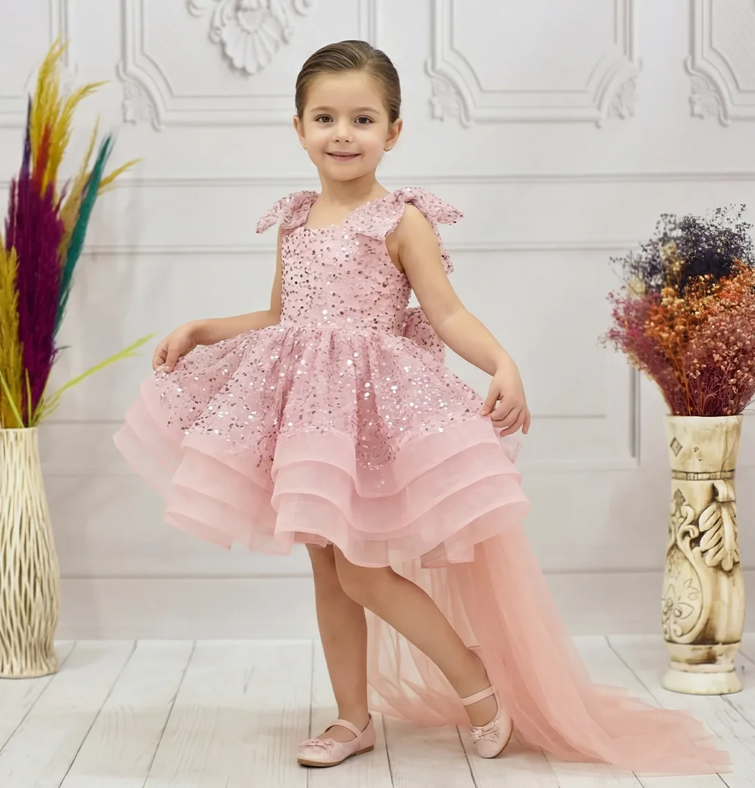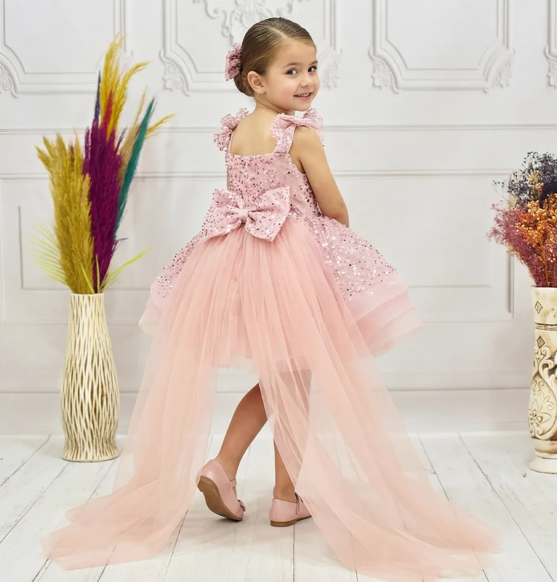 Kız Çocuk Pudra Taşlı Boncuklu Kuyruklu Kısa Kol Elbise Abiye