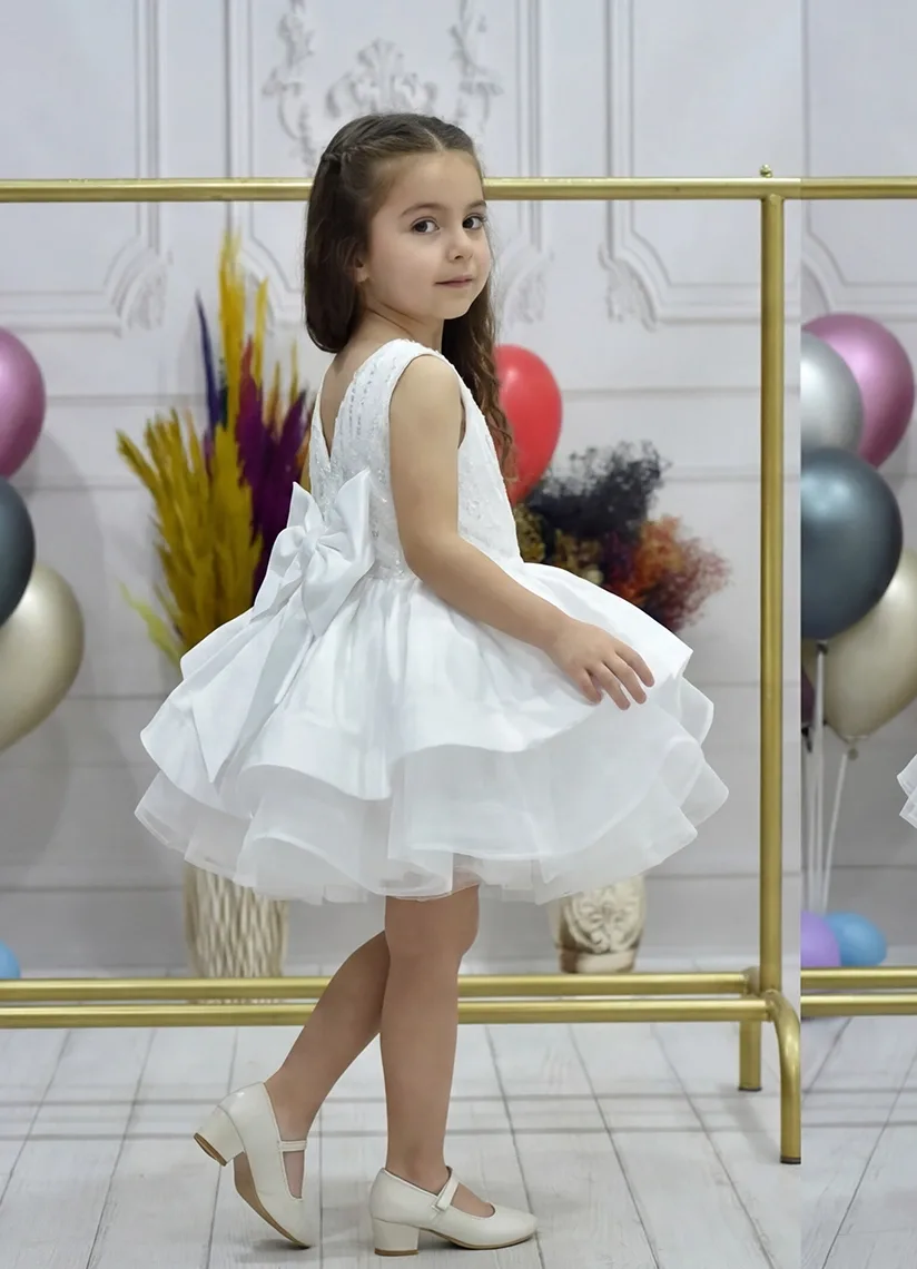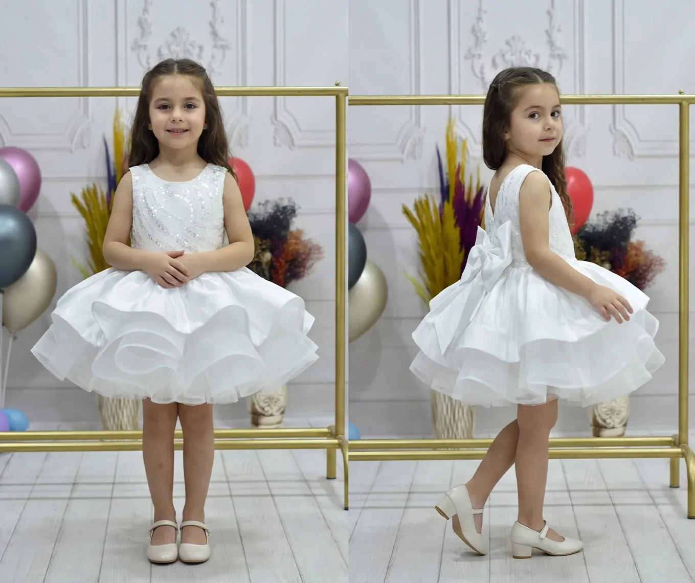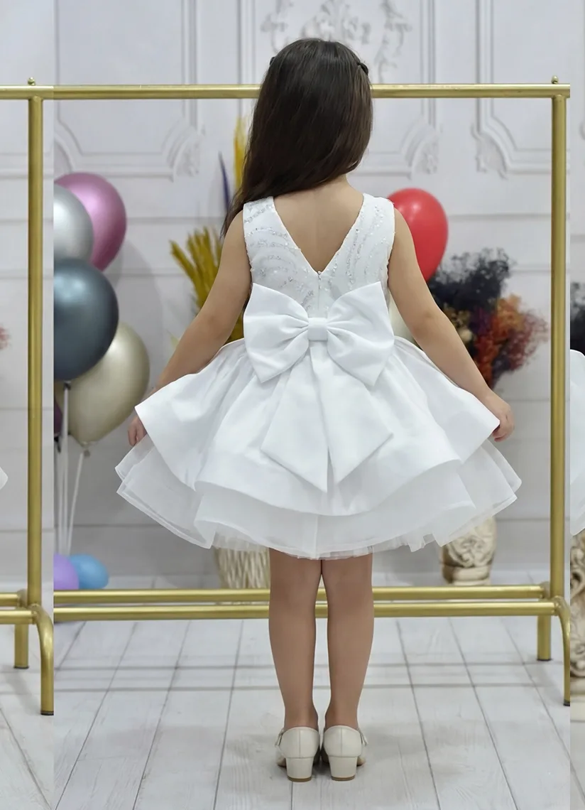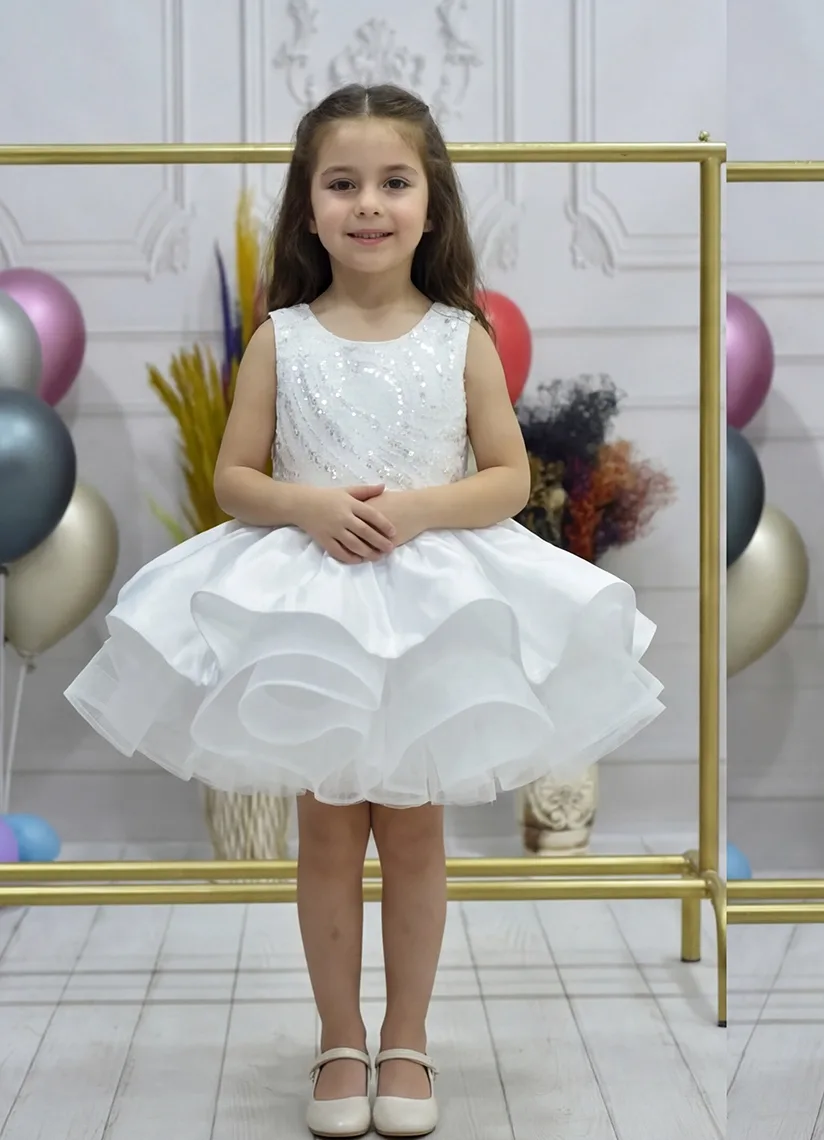 Kız Çocuk Beyaz Taşlı Boncuklu Payetli Sıfır Kol Elbise