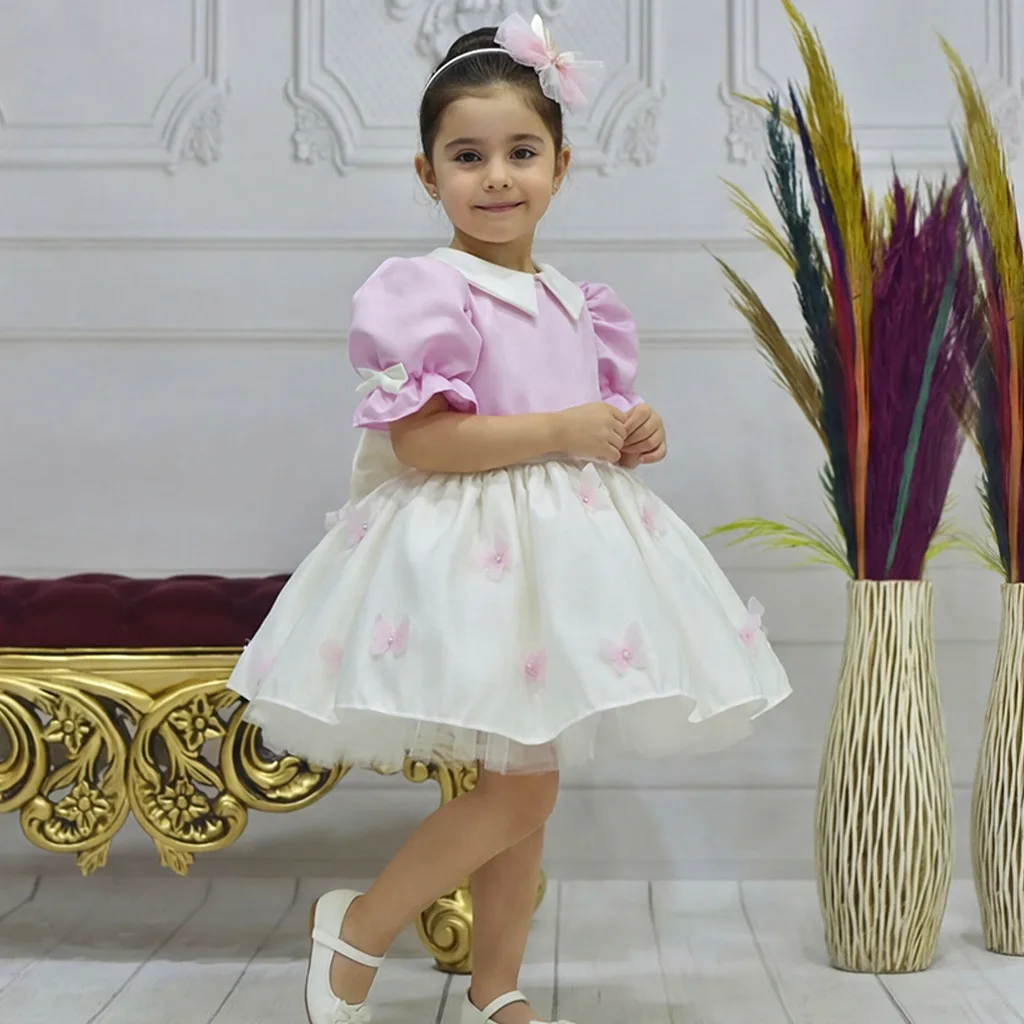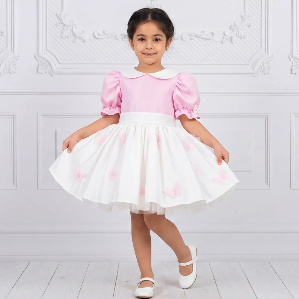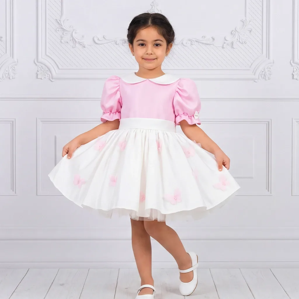 Kız Çocuk Şeker Pembesi Krem Bebe Yakalı Etekli Kelebek İşlemli Kabarık Elbise