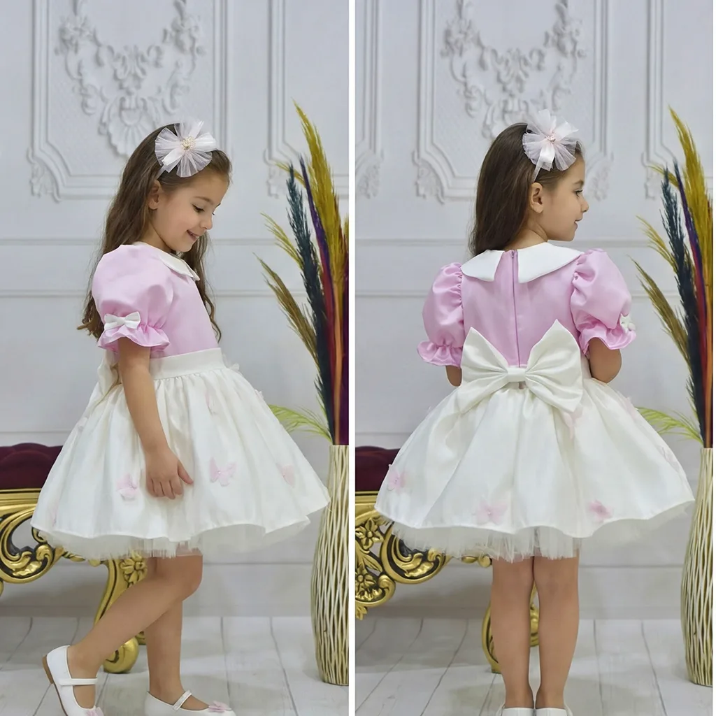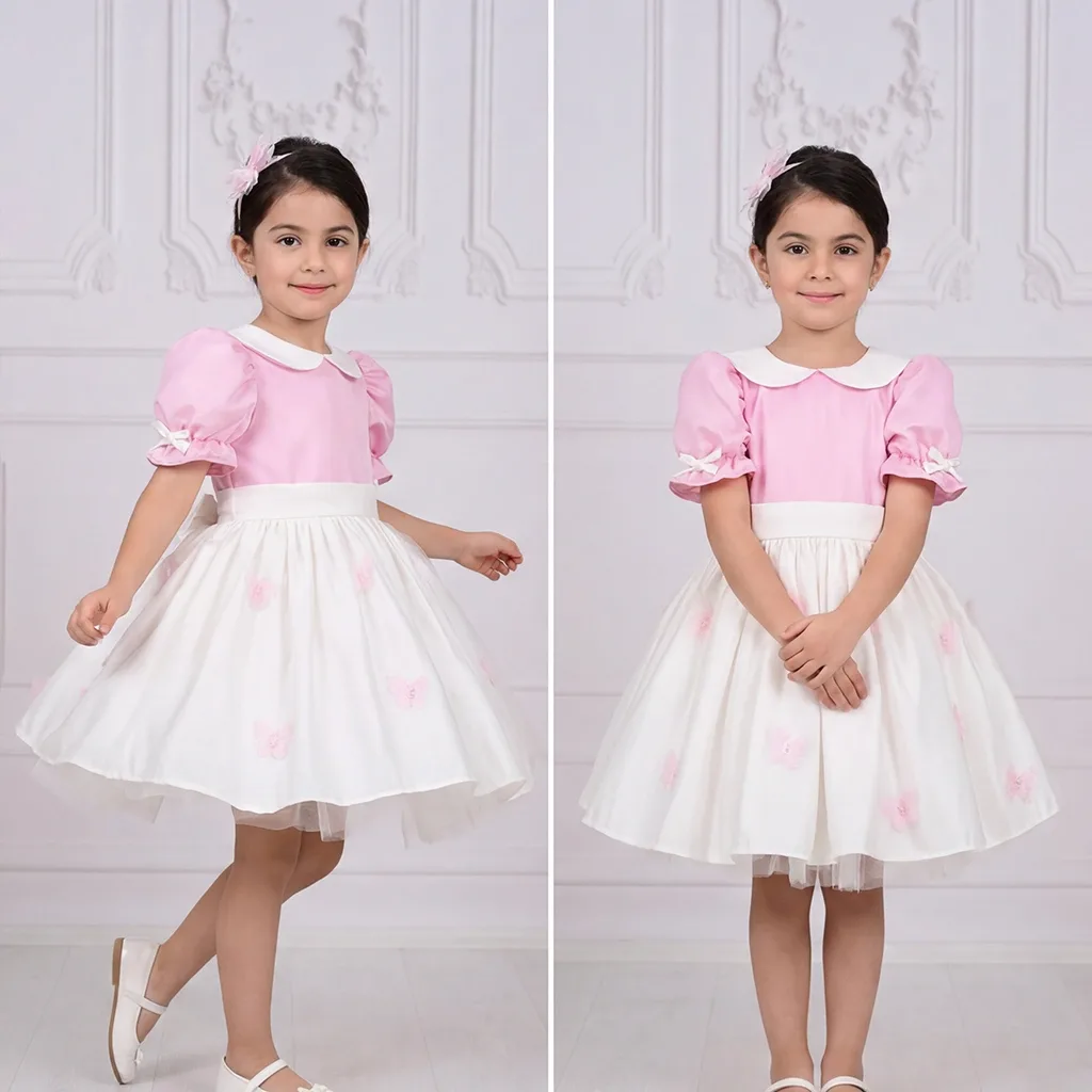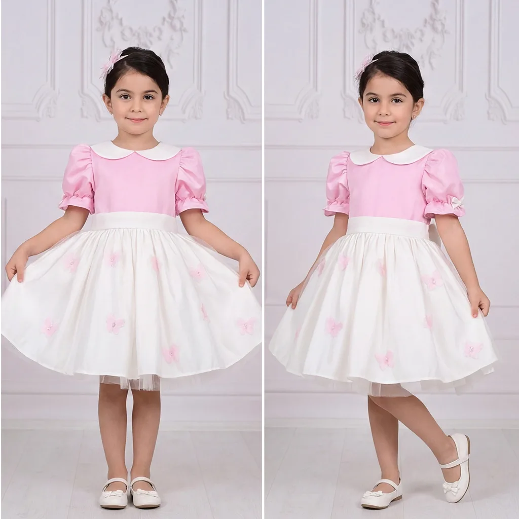 Kız Çocuk Şeker Pembesi Krem Bebe Yakalı Etekli Kelebek İşlemli Kabarık Elbise