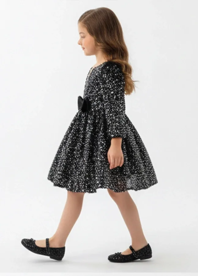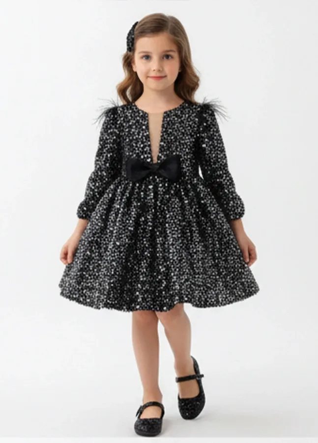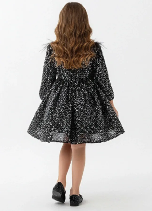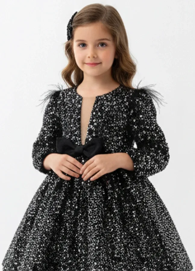 Kız Çocuk Siyah Pul Payetli Tüy Detaylı Uzun Kol Bisiklet Yaka Grenli Kabarık Elbise