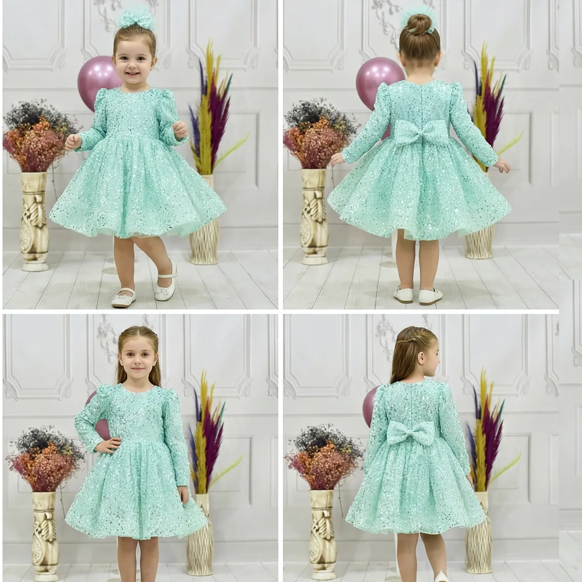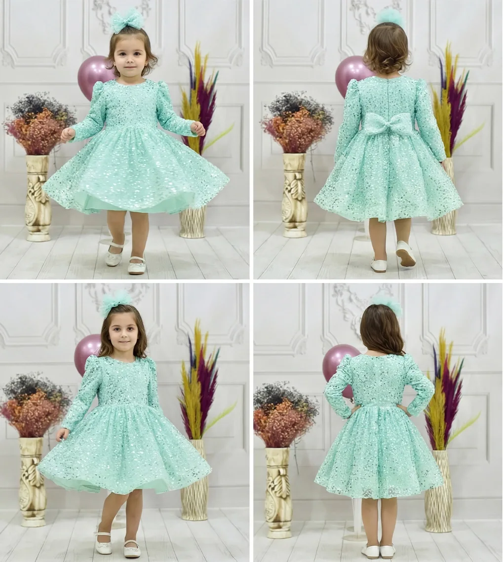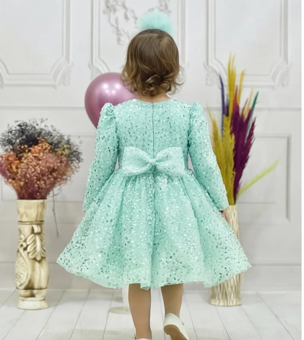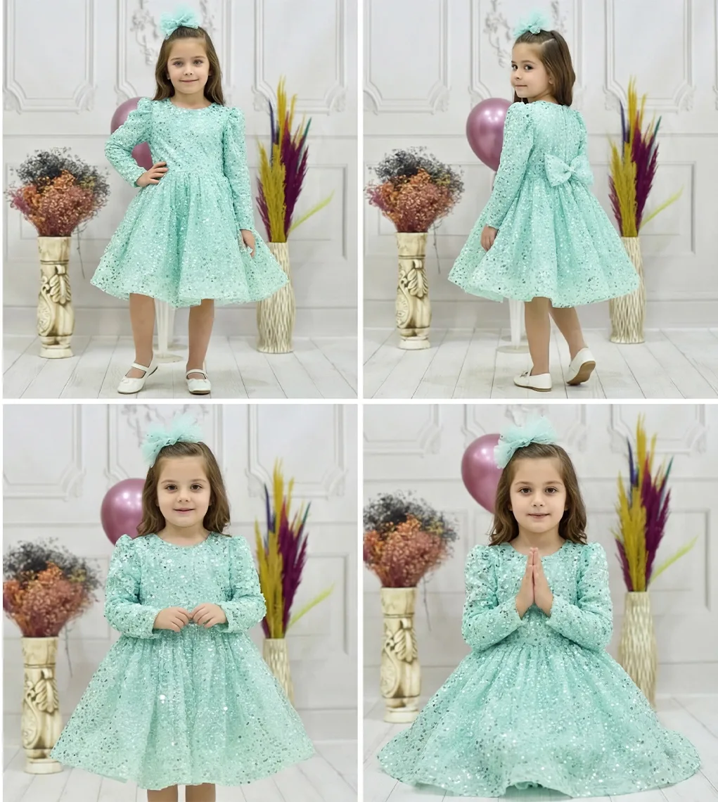 kiz-cocuk-su-yesili-boncuklu-payetli-uzun-kol-kabarik-elbise Eteklerinde Gren Vardır ve Çok Kabarık Elbise Modelidir.