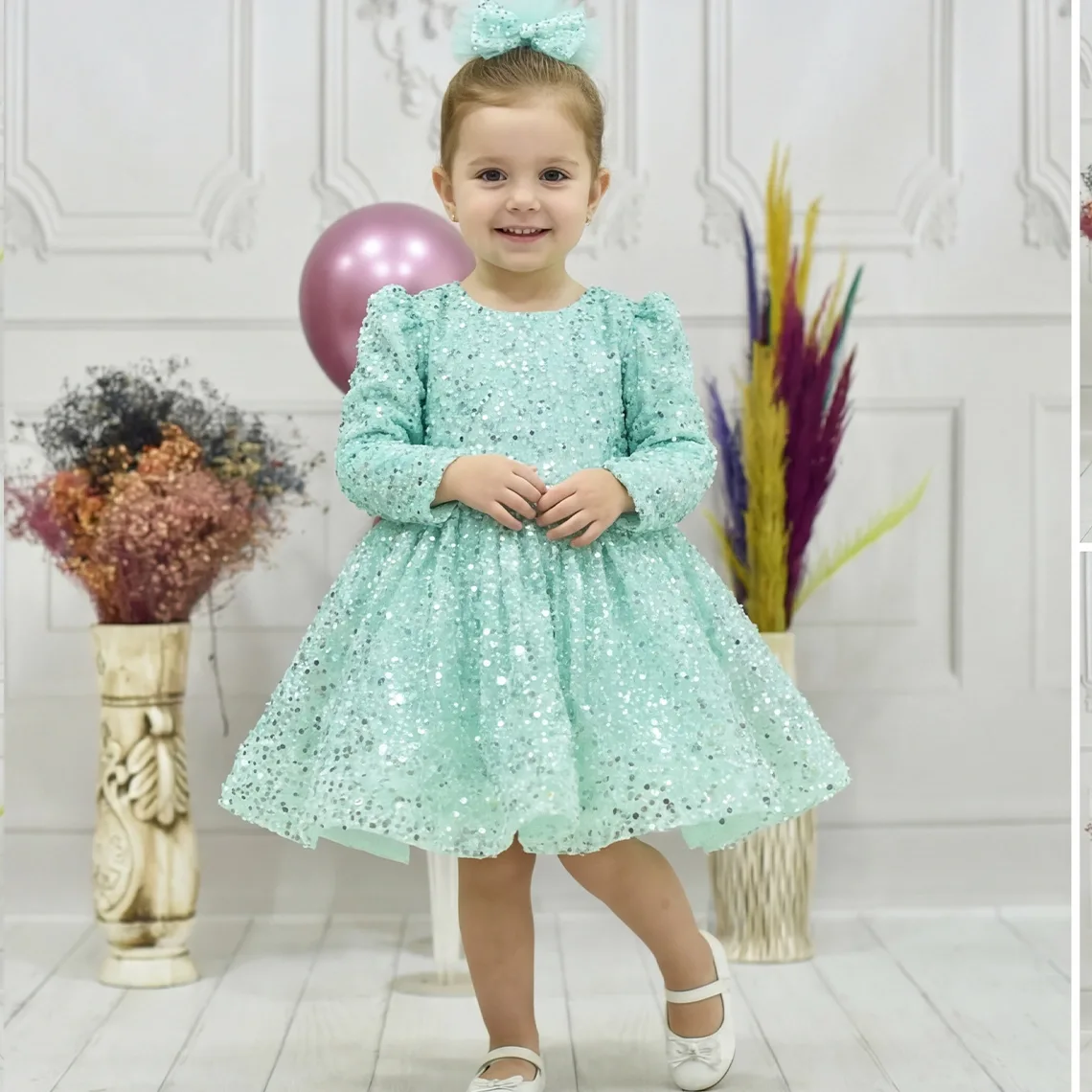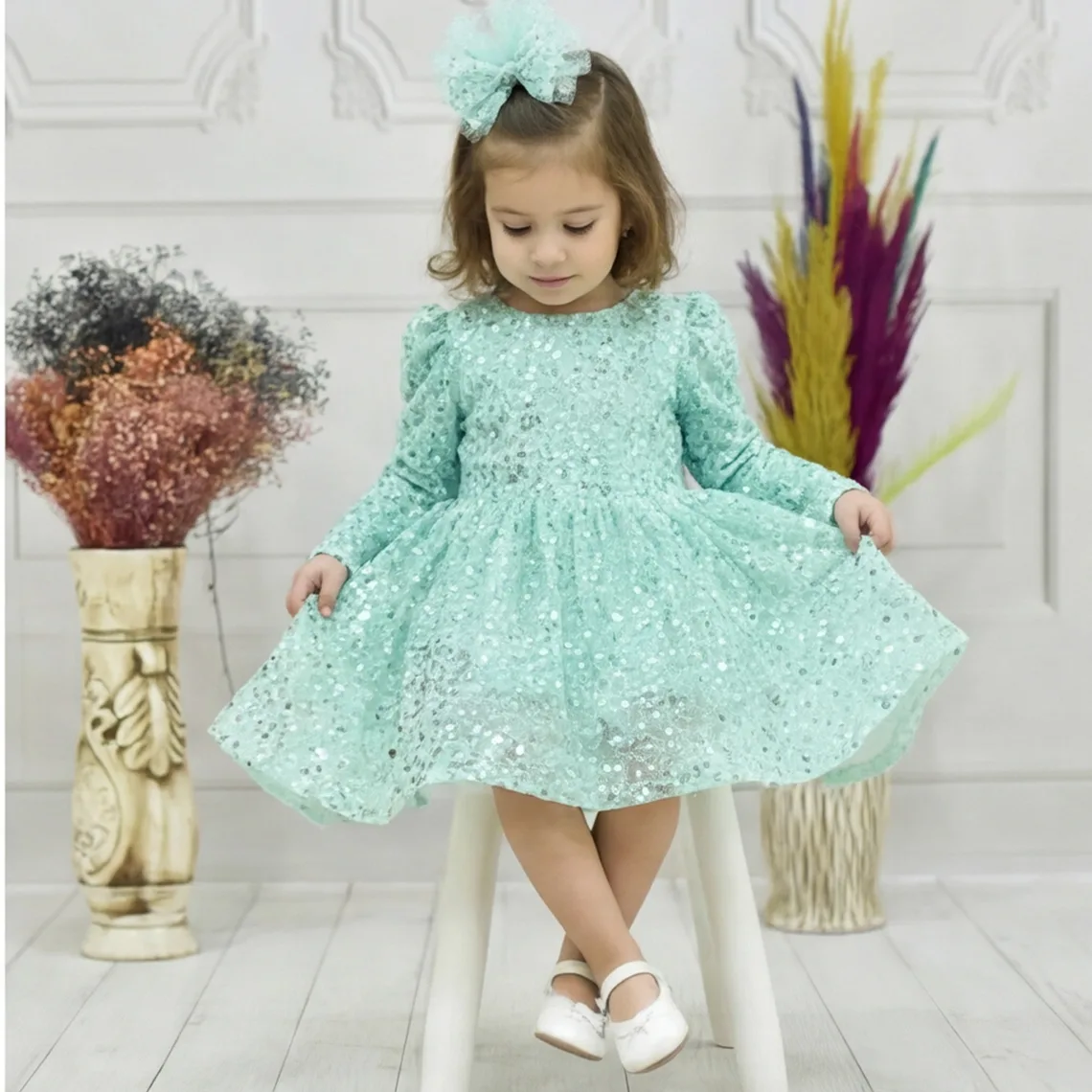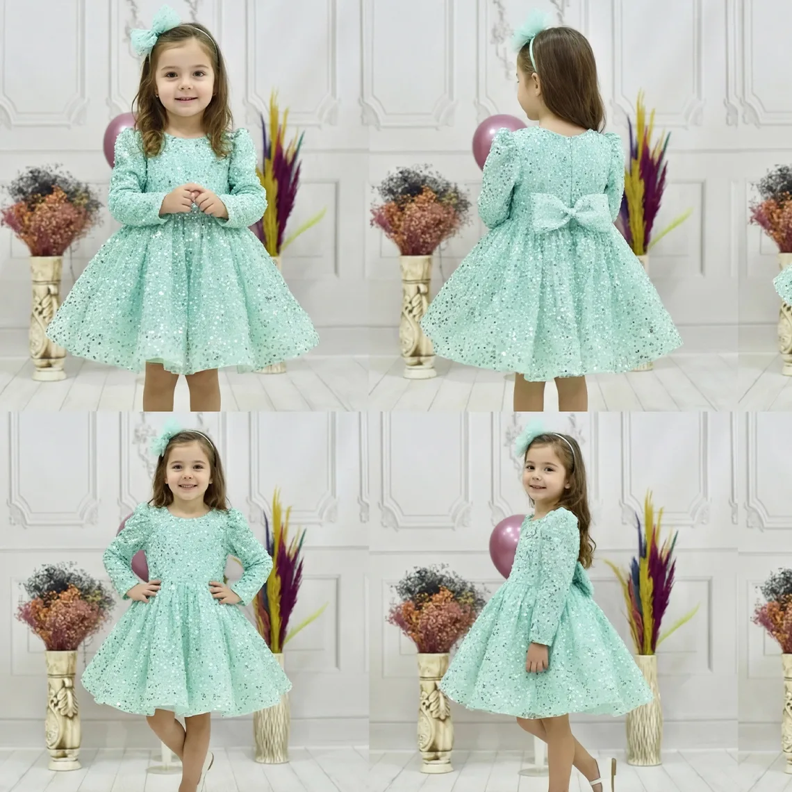 kiz-cocuk-su-yesili-boncuklu-payetli-uzun-kol-kabarik-elbise Eteklerinde Gren Vardır ve Çok Kabarık Elbise Modelidir.