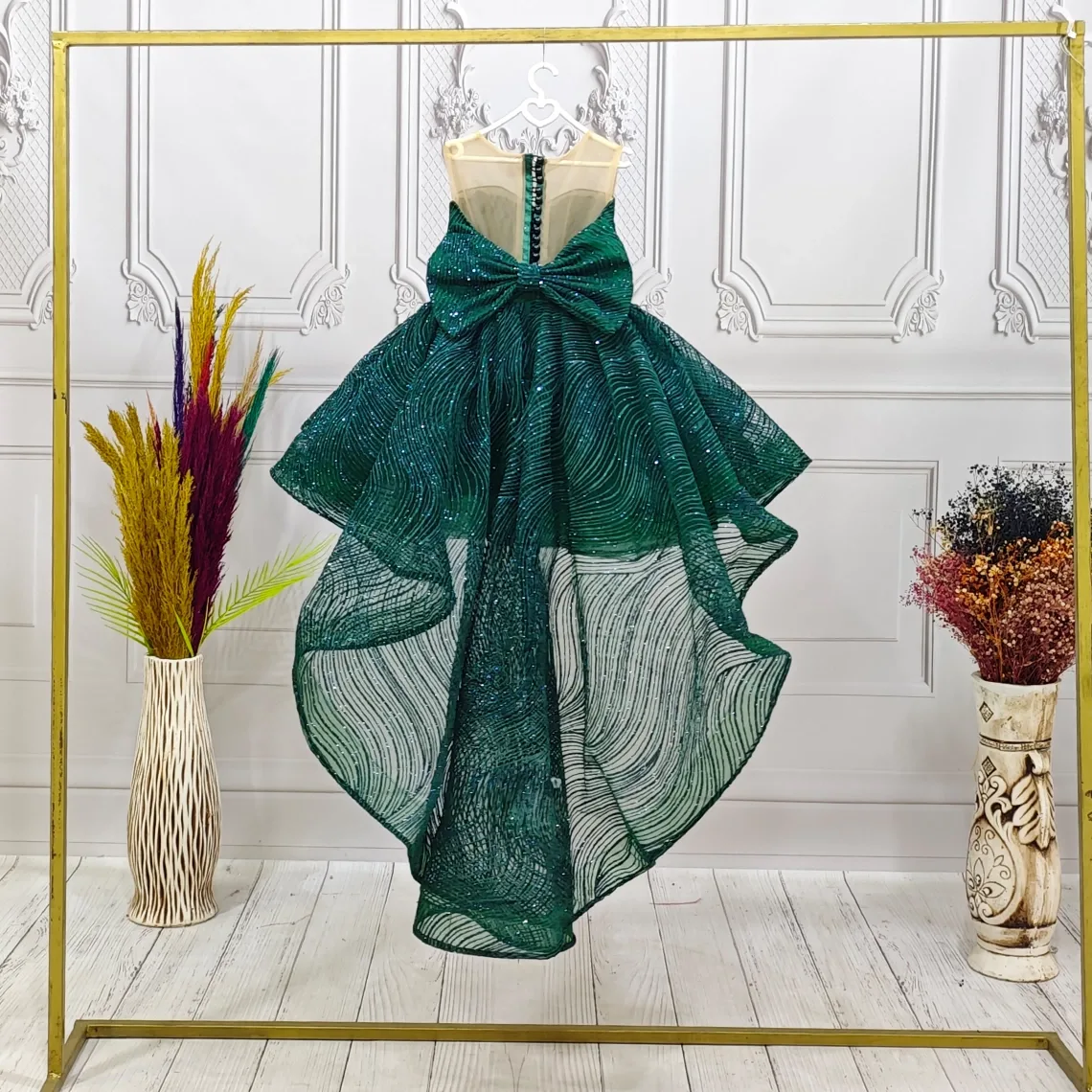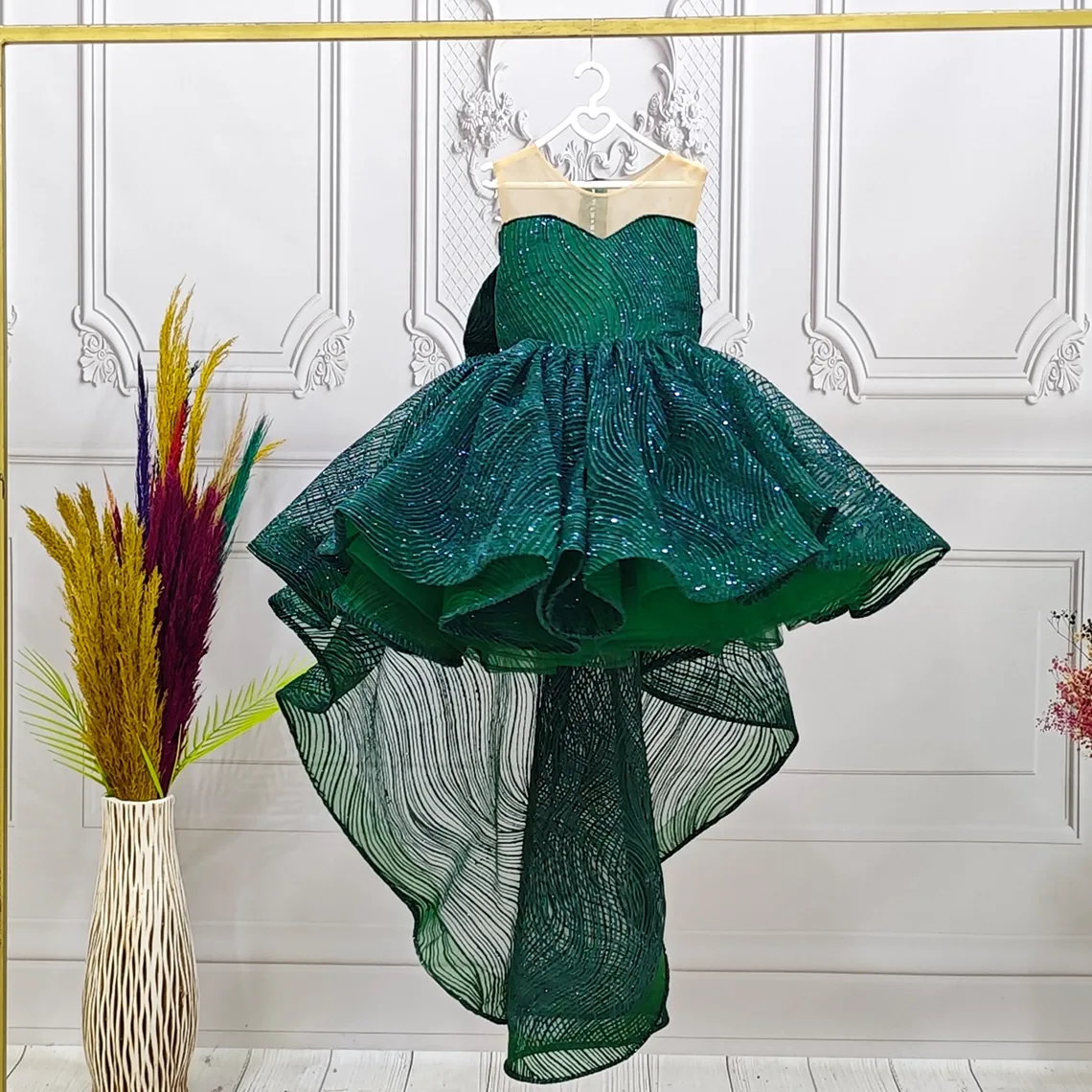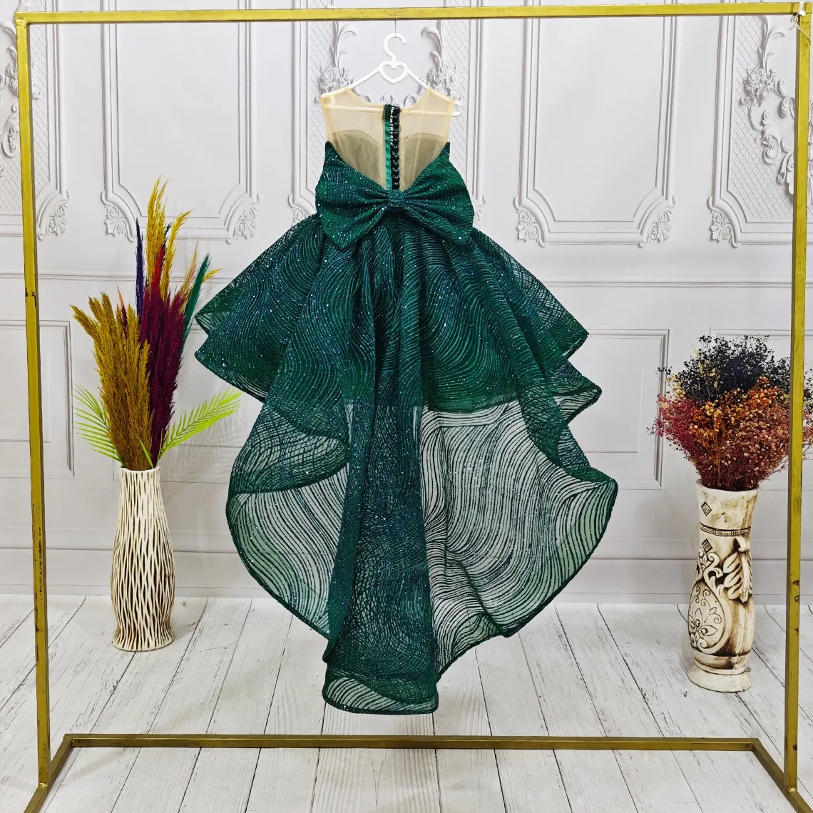 Kız Çocuk Zümrüt Yeşili Dalgalı Parıltılı Kuyruklu Elbise Abiye