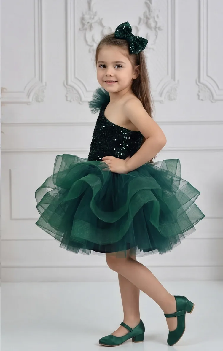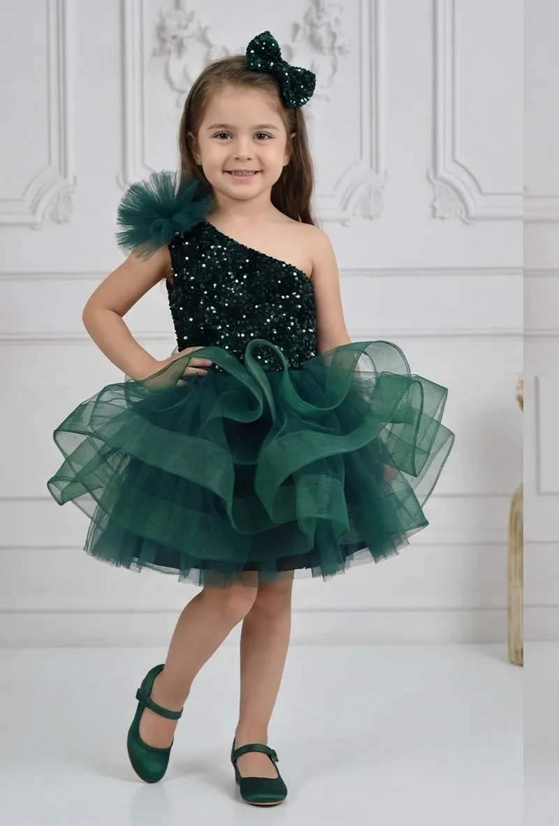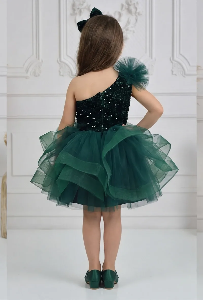 Kız Çocuk Zümrüt Yeşilli Payetli Kadife Grenli Tek Omuz Kabarık Elbise