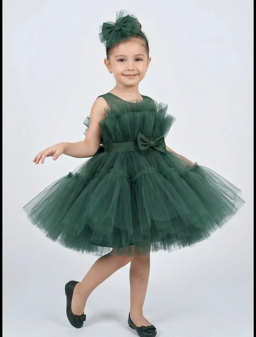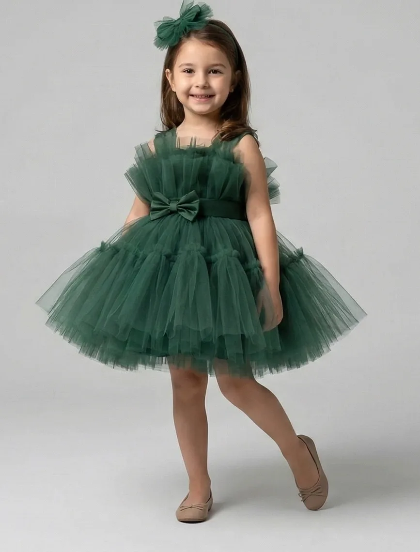 Kız Çocuk Zümrüt Yeşilli Şeffaf Üst Ön Fiyonk Detaylı Kemerli Kabarık