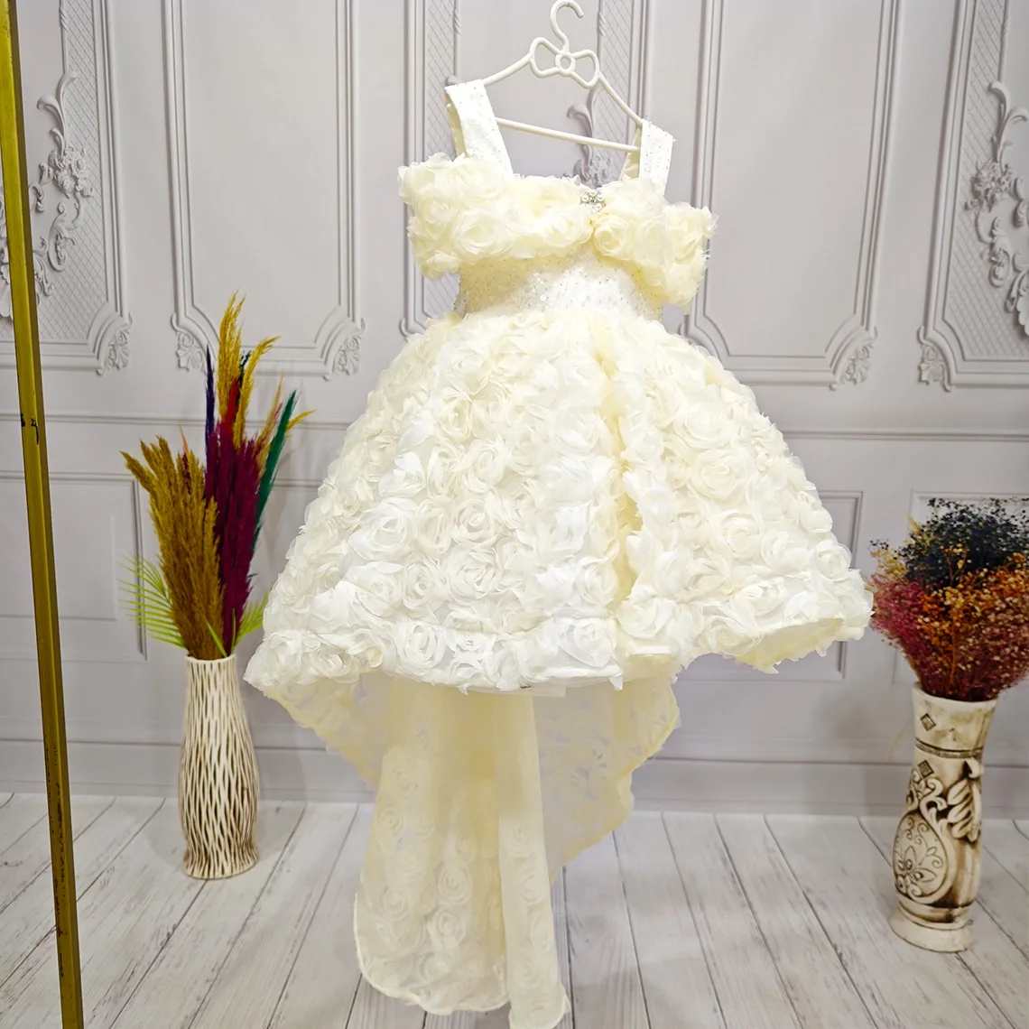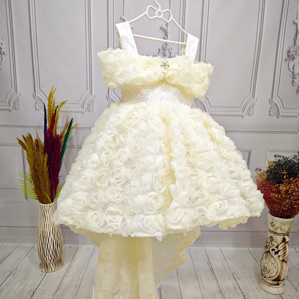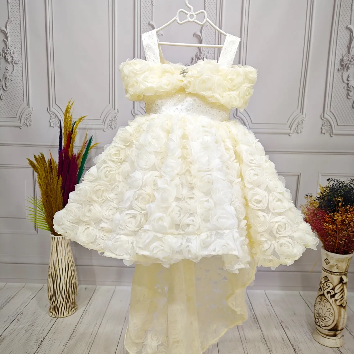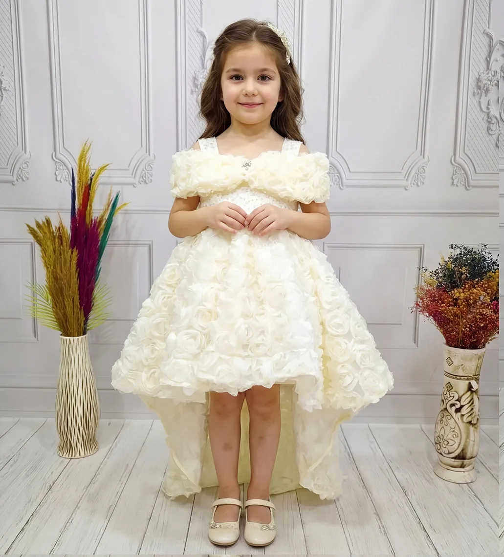 Kız Çocuk Krem Kuyruklu Şeffaf Gül Desenli Kısa Balon Kol Elbise Abiye Kuyruludur Ve Oldukça Zariftir İstediğin Beden Üretimi Yapılmaktadır. Elbısenın içi komple pamuk astarlıdır.Hicbir sekilde cildi tahriş etmez..Oldukça kabarık bir elbisedir. Yıkama ve kurutma işlemlerini tersten yapmanızı ve 30°c sıcaklıkta yıkamanızı öneririz. ( TOKASI DAHİL DEĞİLDİR )