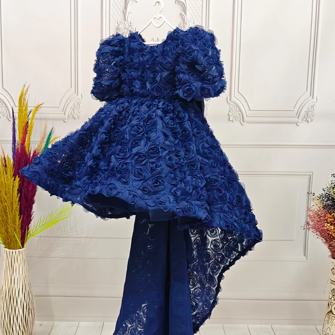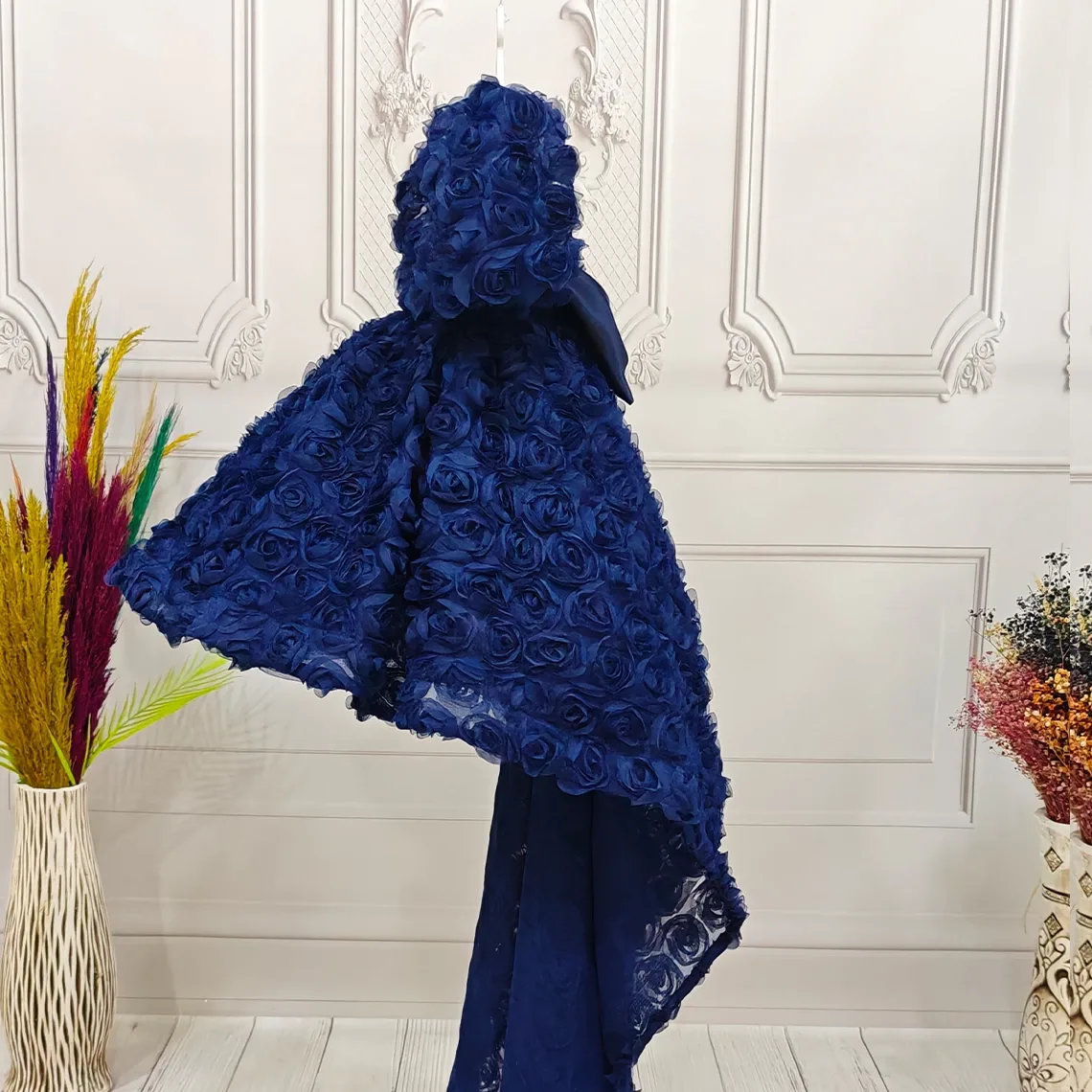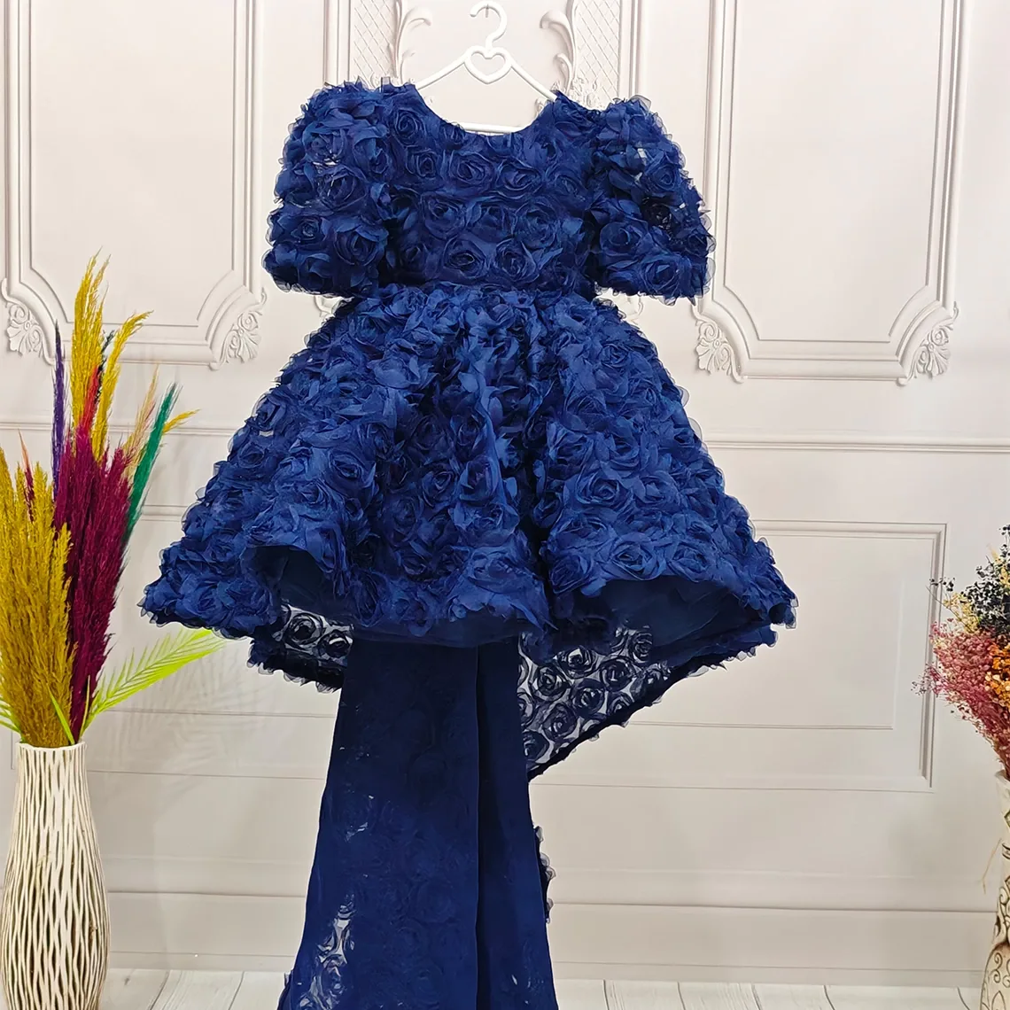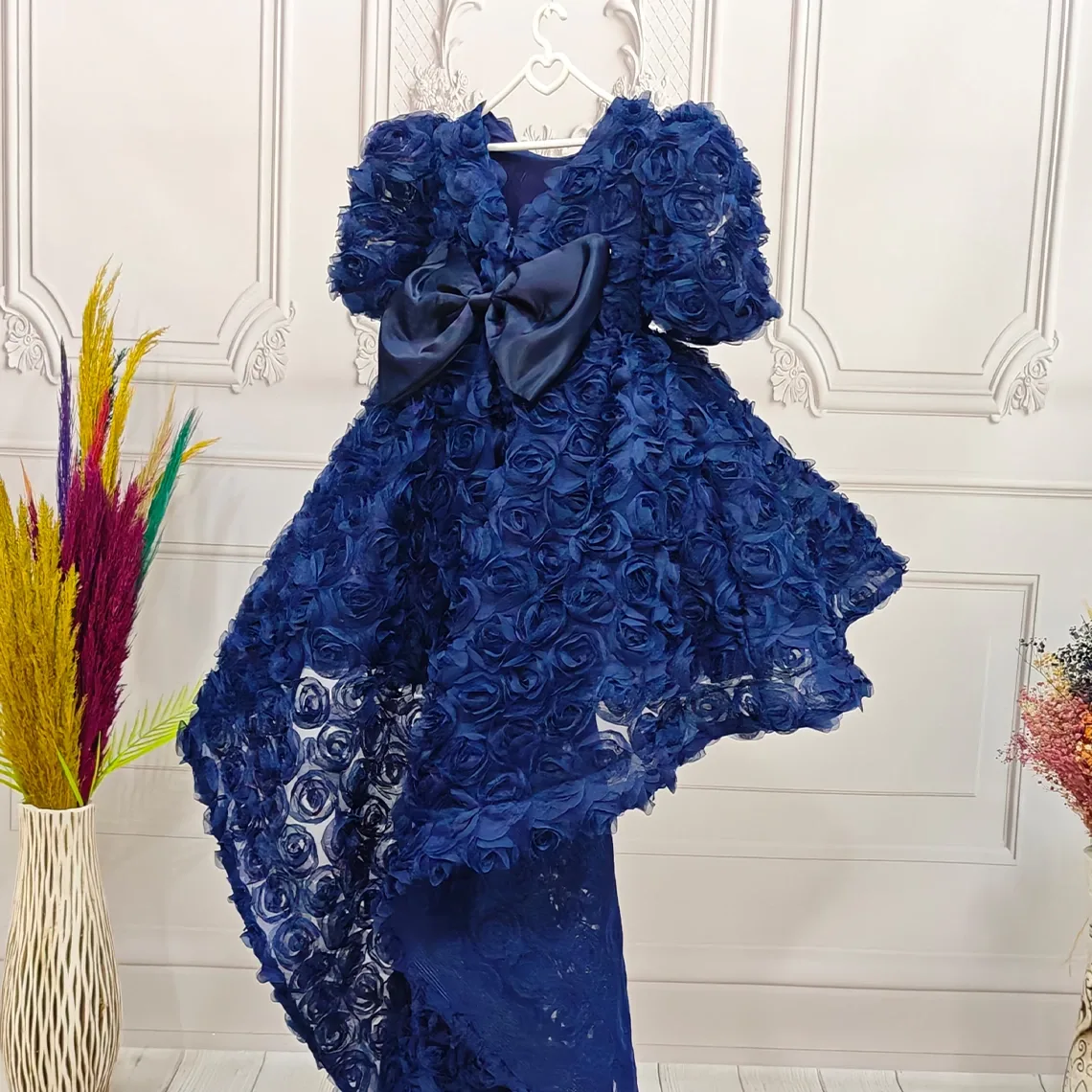 Lacivert Güllü Kuyruklu Kısa Kol Elbise Abiye Gelinlik