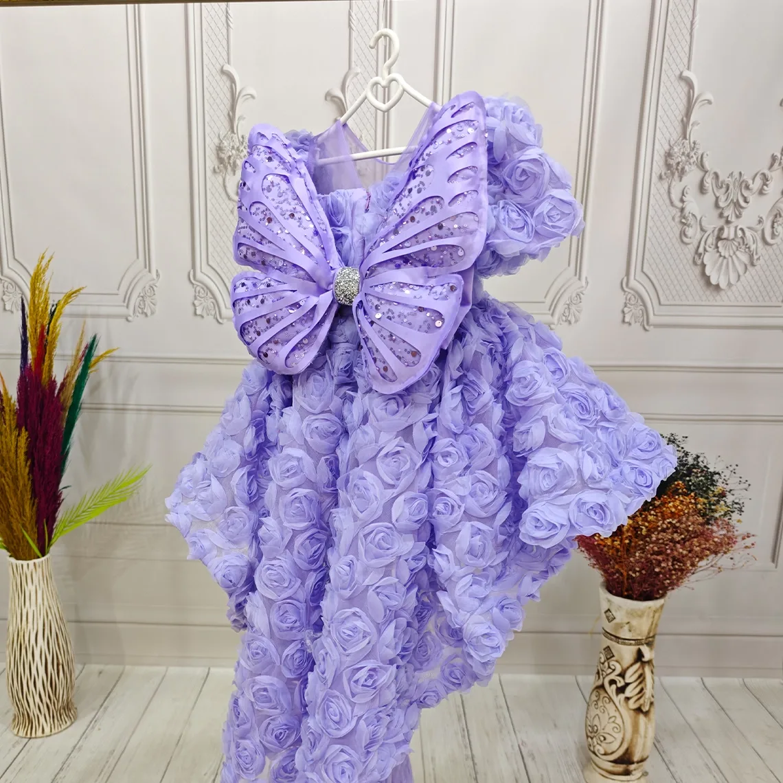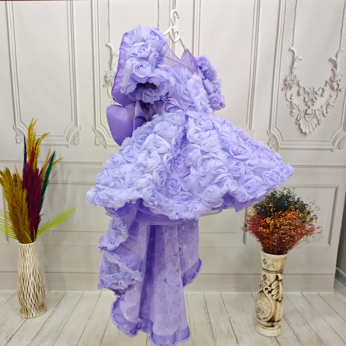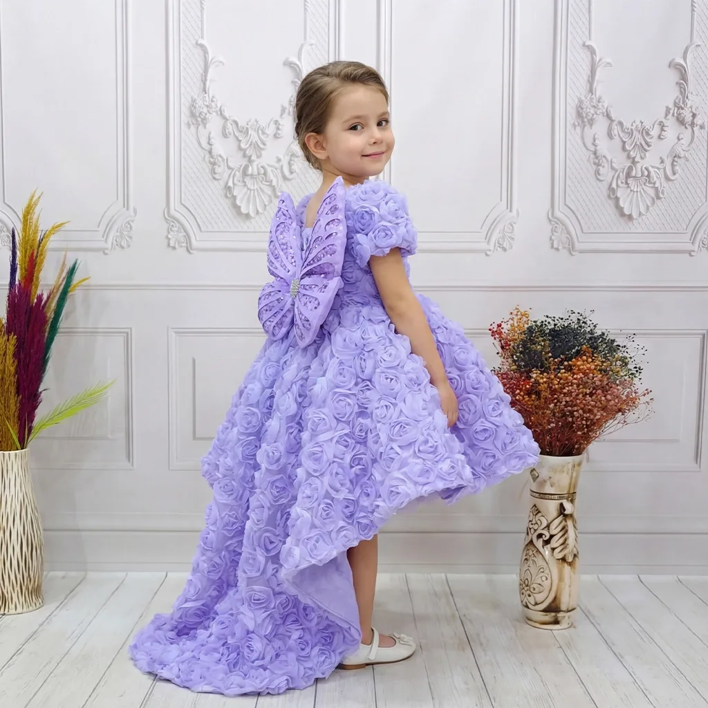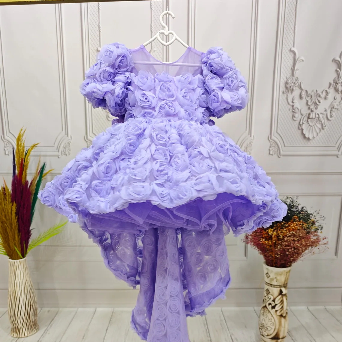• Kız Çocuk Lila Gül Desenli Kuyruklu Kısa Balon Kol Ön Şeffaf Elbise Abiye