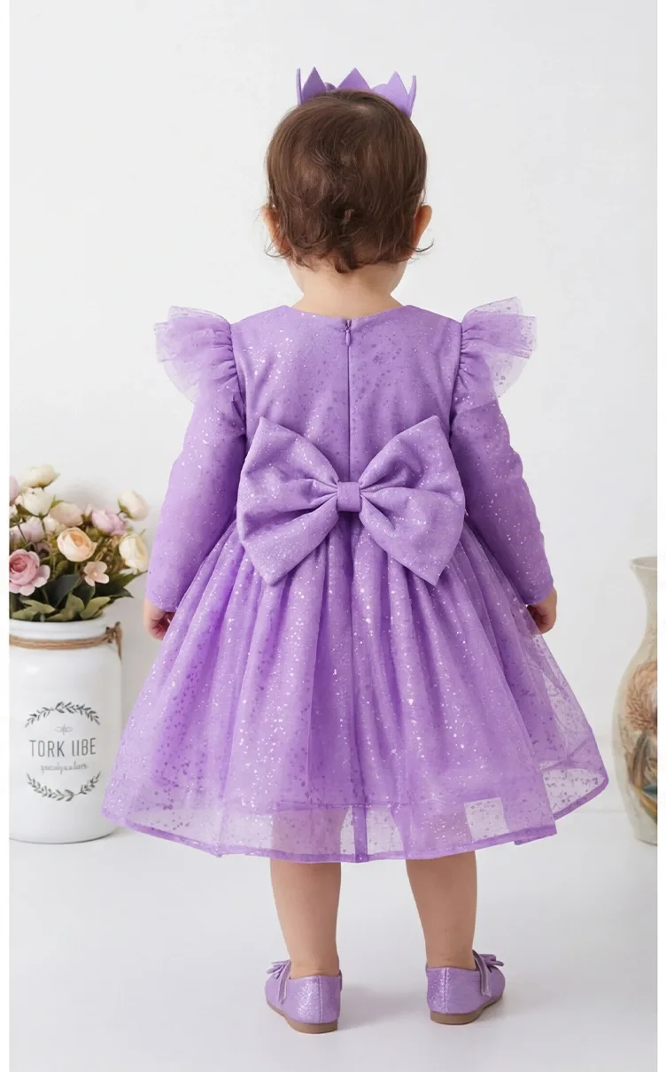 Lila Parıltılı Uzun Kol Kabarık Elbise Abiye Gelinlik