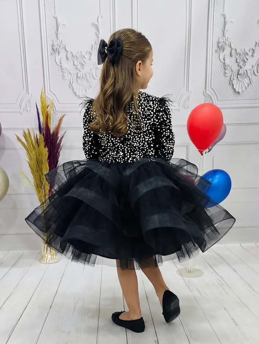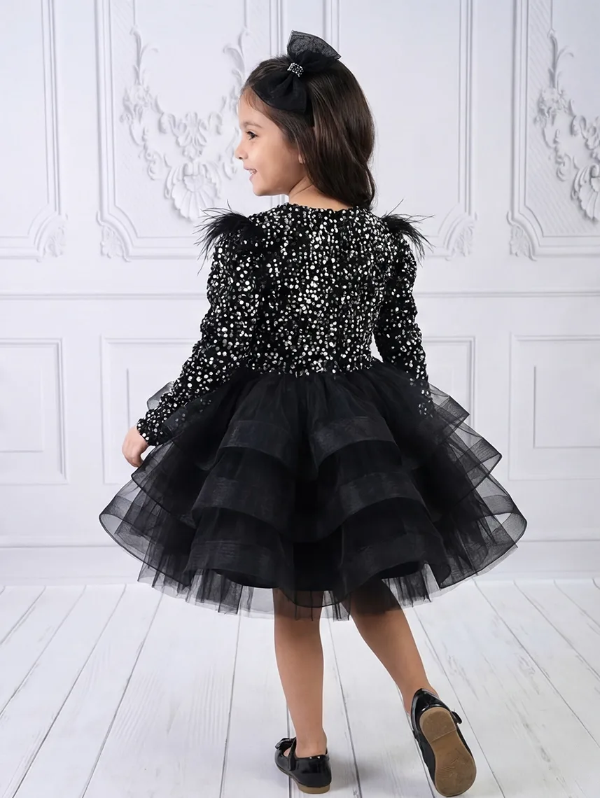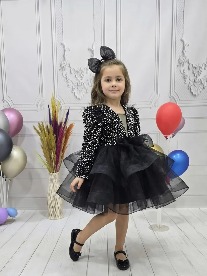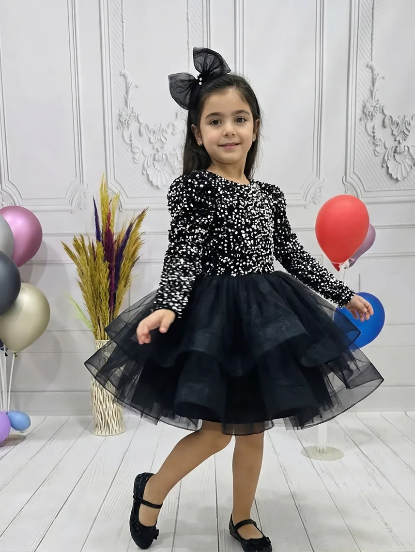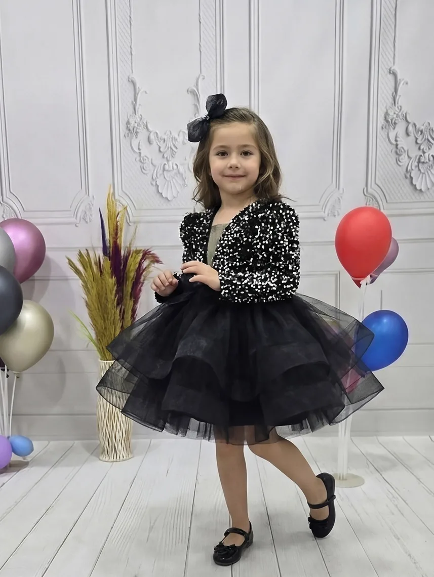 Kız Çocuk Siyah Payetli Dekolteli Uzun Kol Gren Etekli Kabarık Elbise
