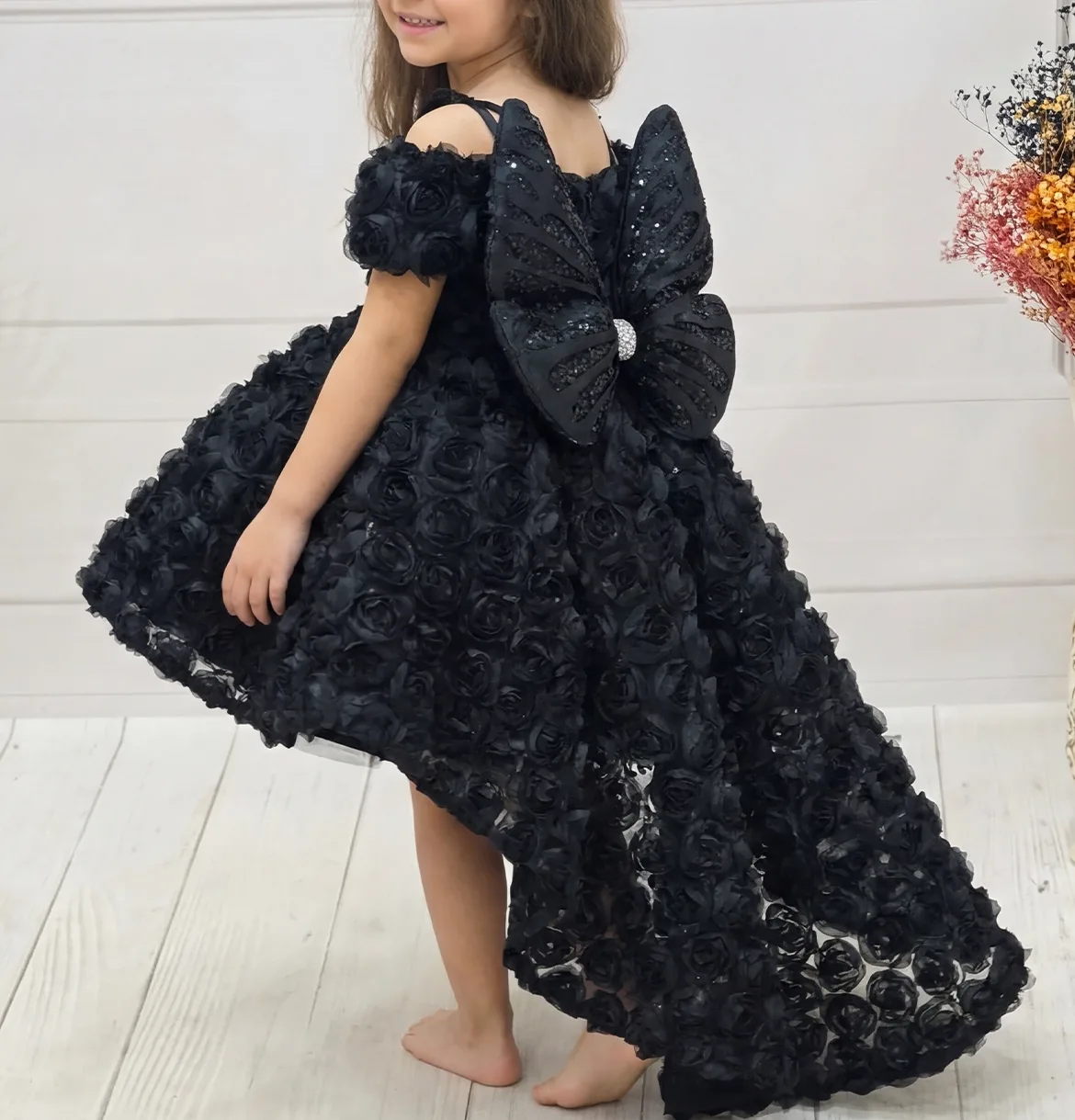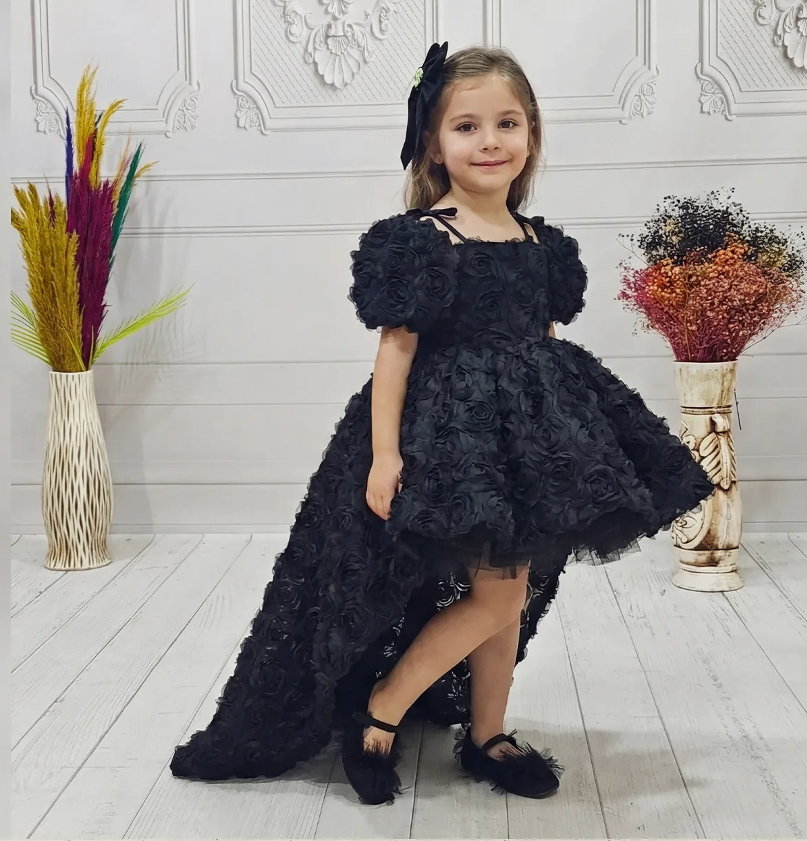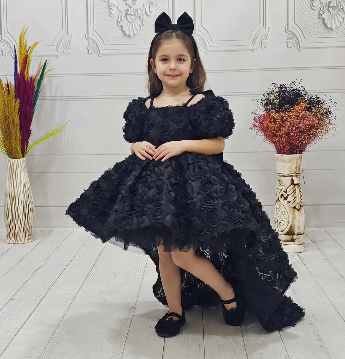 Kız Çocuk Siyah Gül 3D Kabarık Elbise Abiye Gelinlik