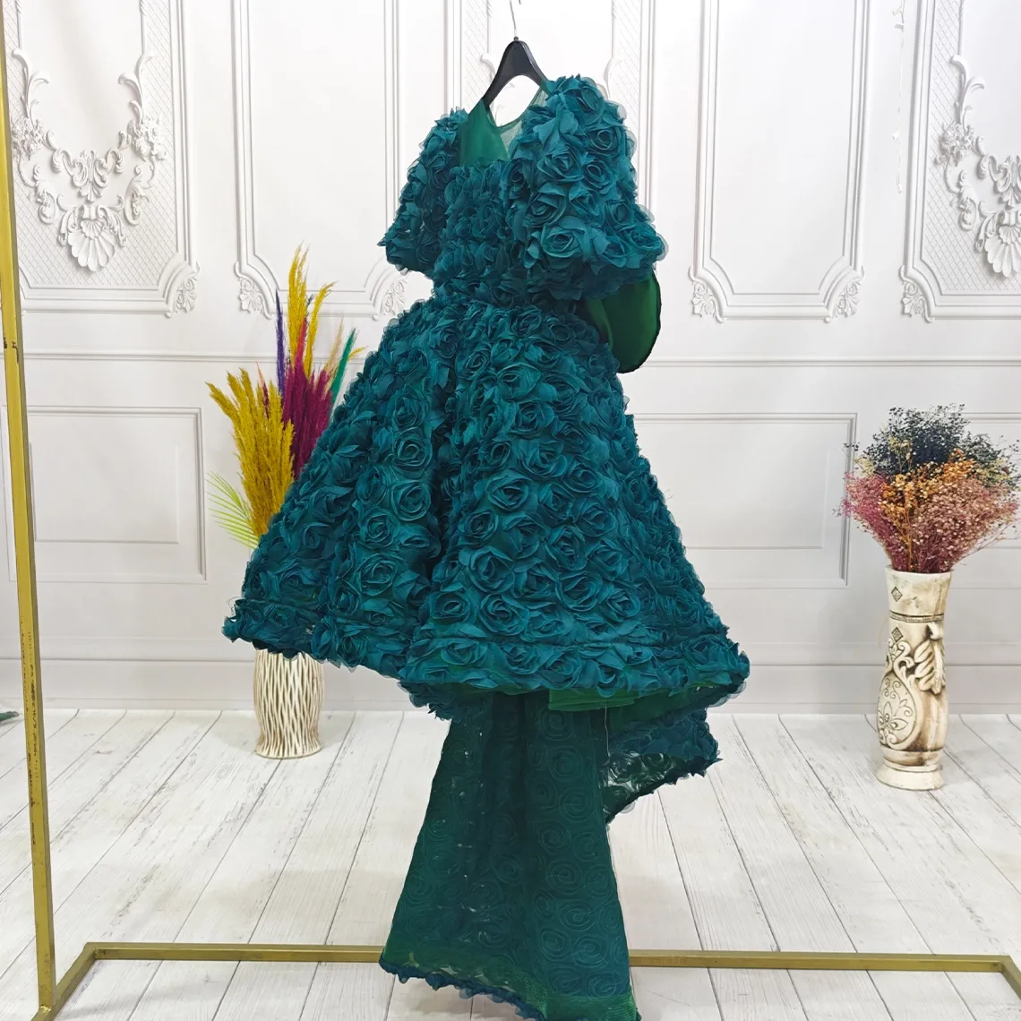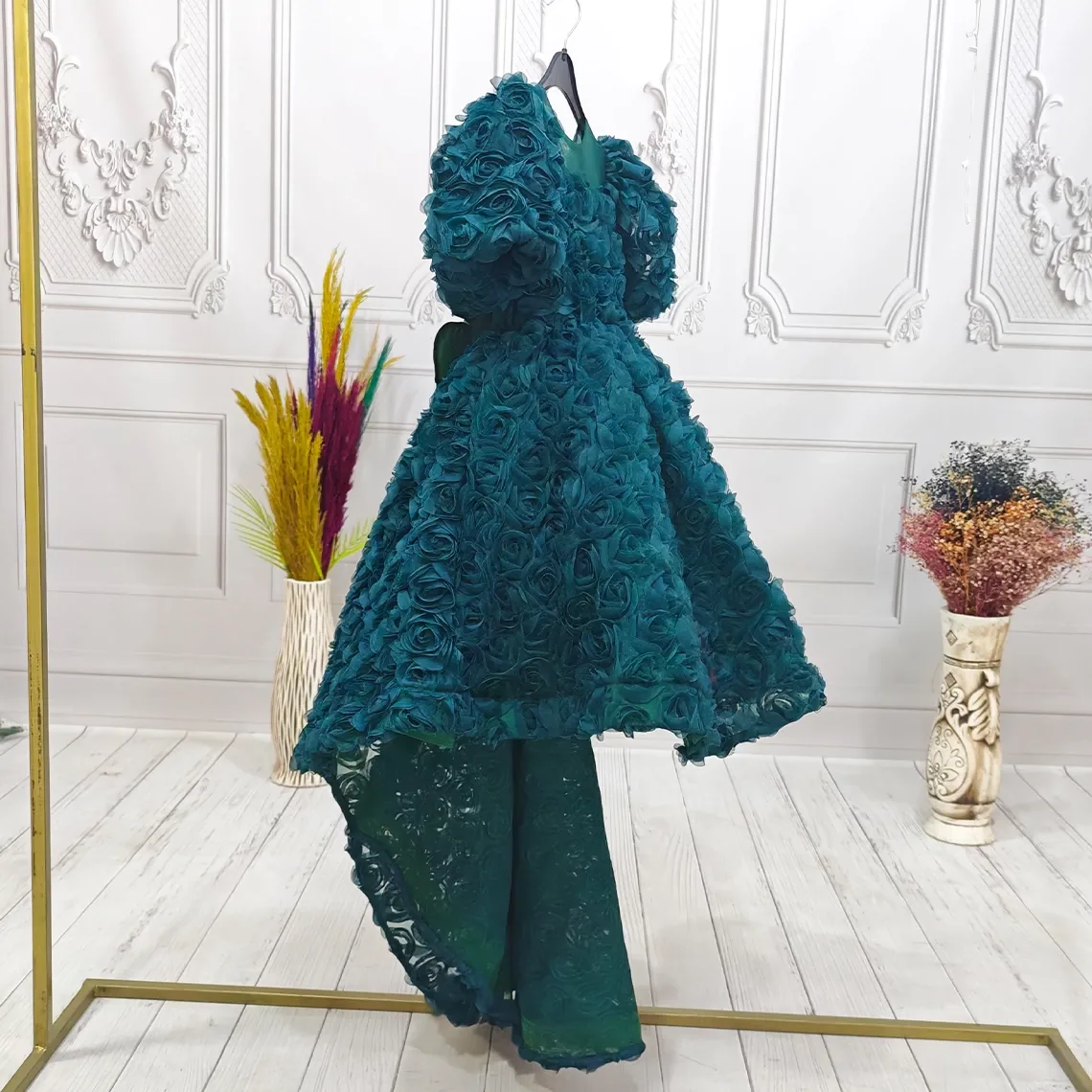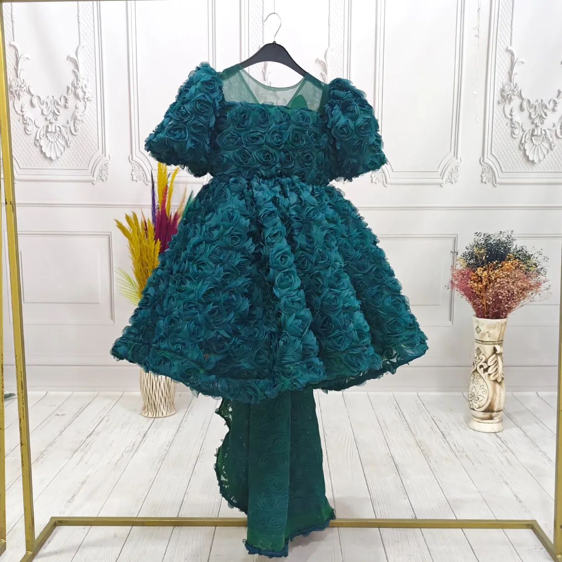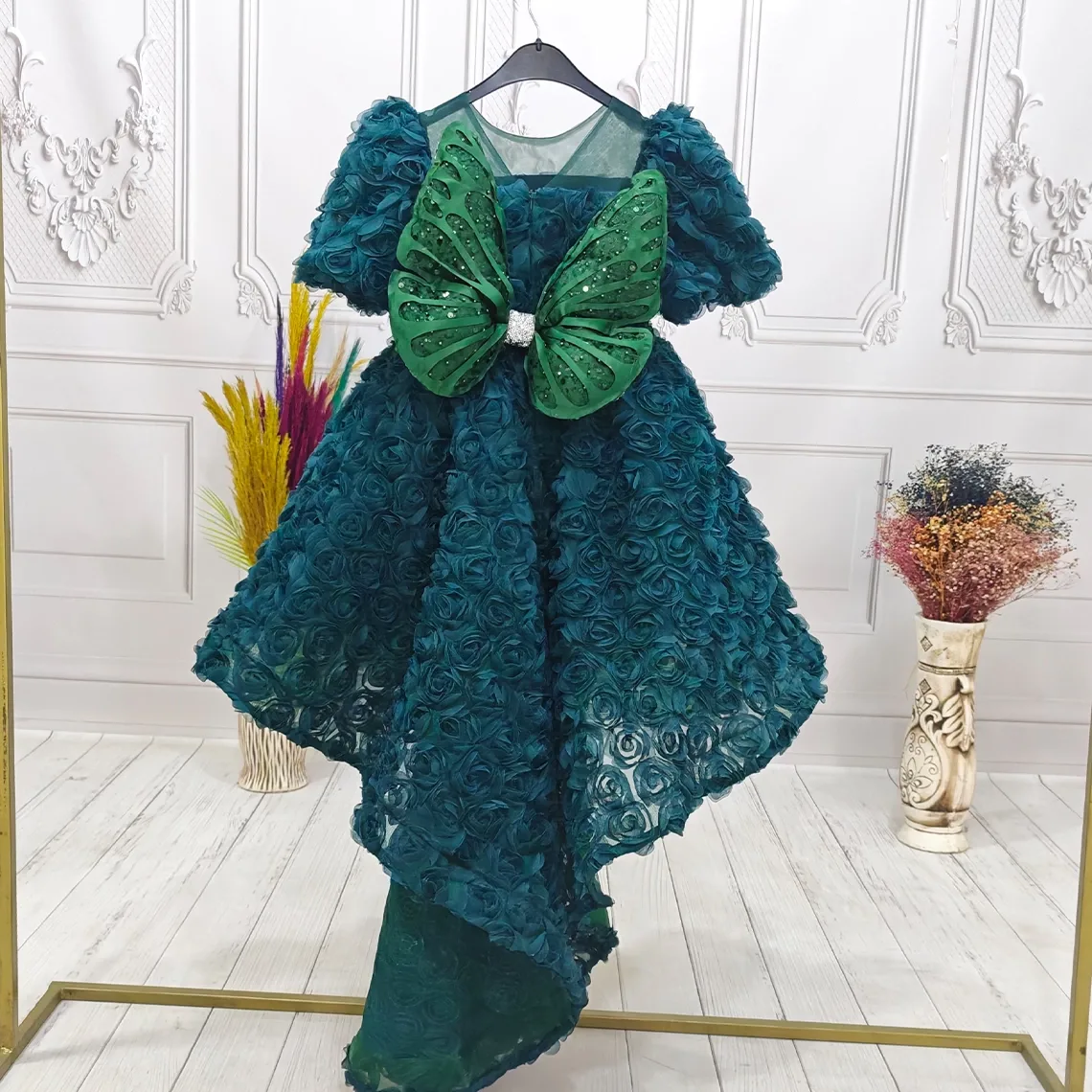 • ELLUSSİ Kız Çocuk Zümrüt Yeşili Gül Desenli Kuyruklu Uzun Kol Elbise Abiye, zarif ve şık tasarımıyla öne çıkıyor.