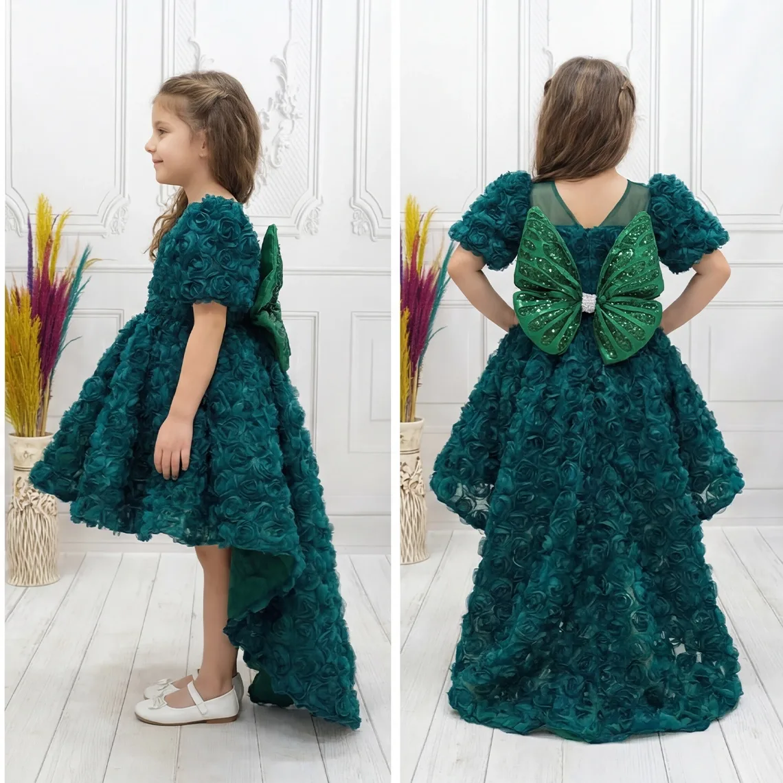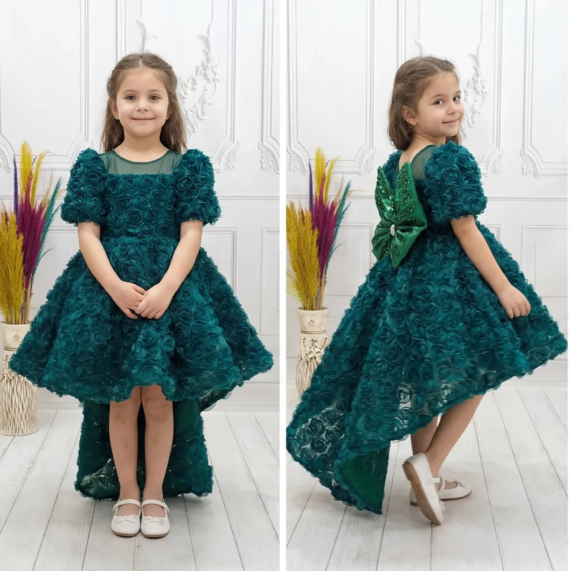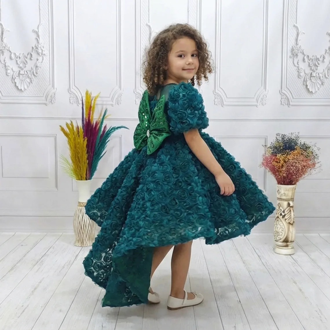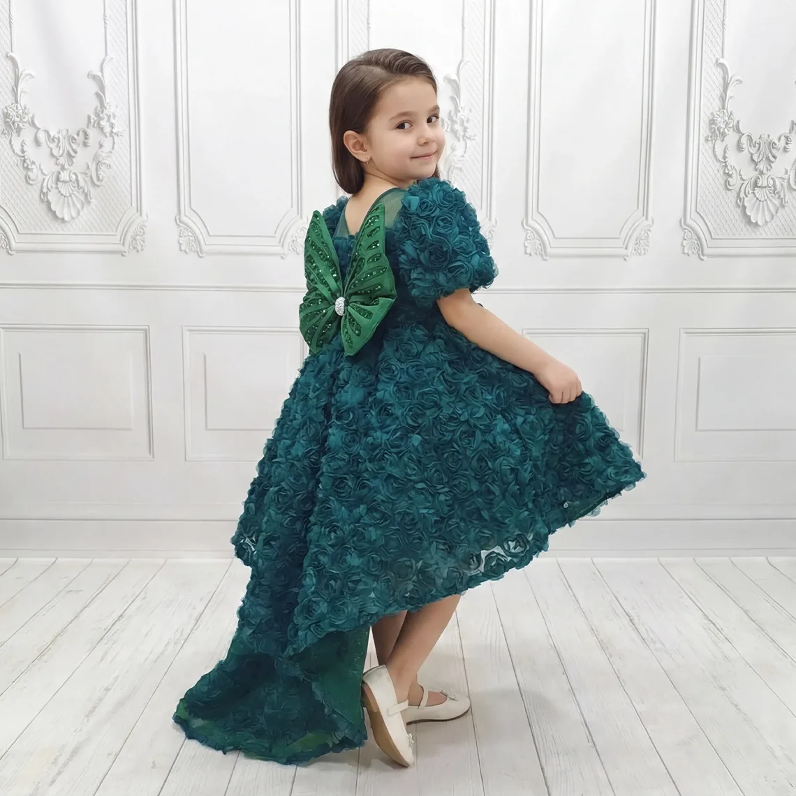 • ELLUSSİ Kız Çocuk Zümrüt Yeşili Gül Desenli Kuyruklu Uzun Kol Elbise Abiye, zarif ve şık tasarımıyla öne çıkıyor.